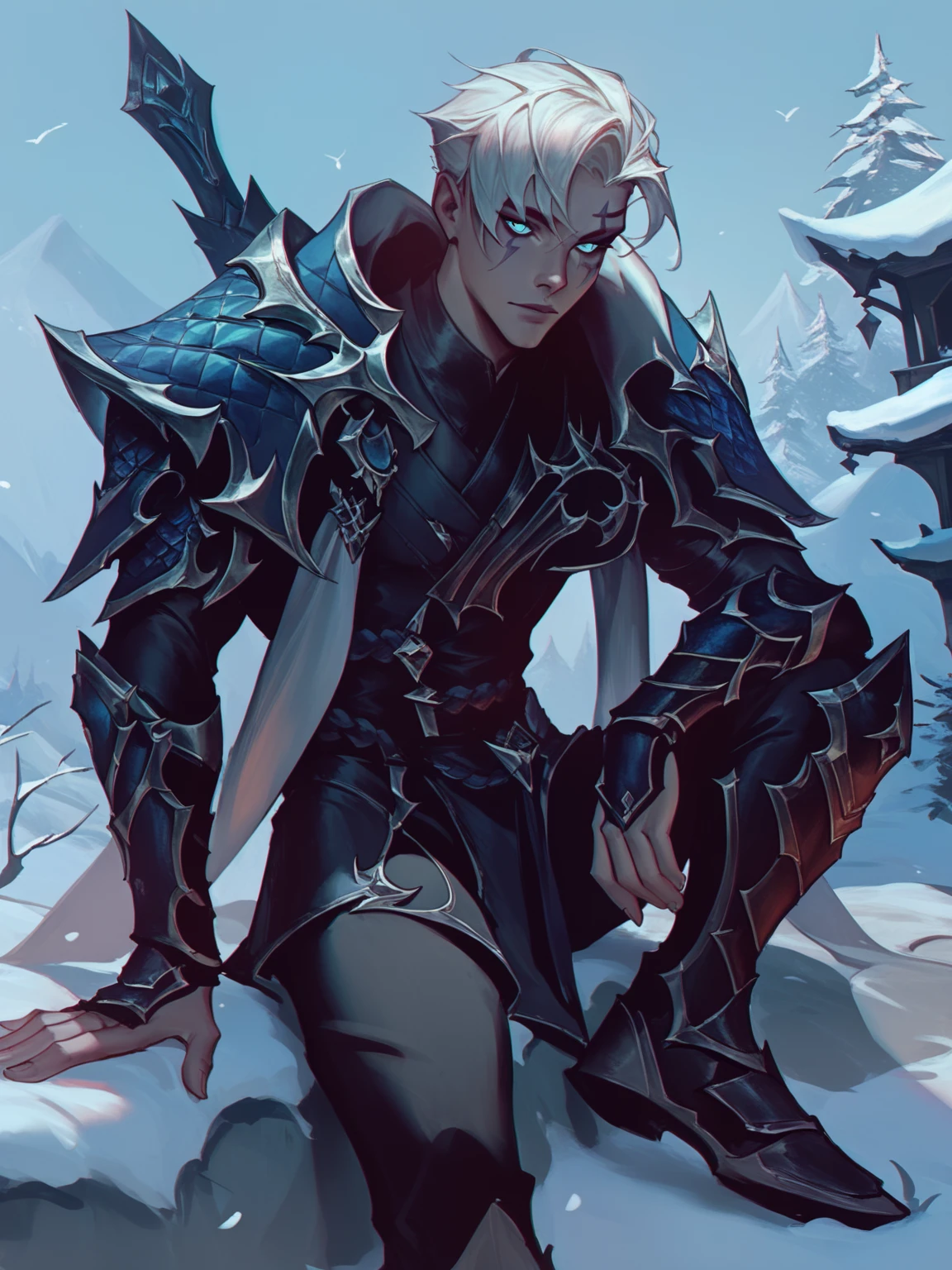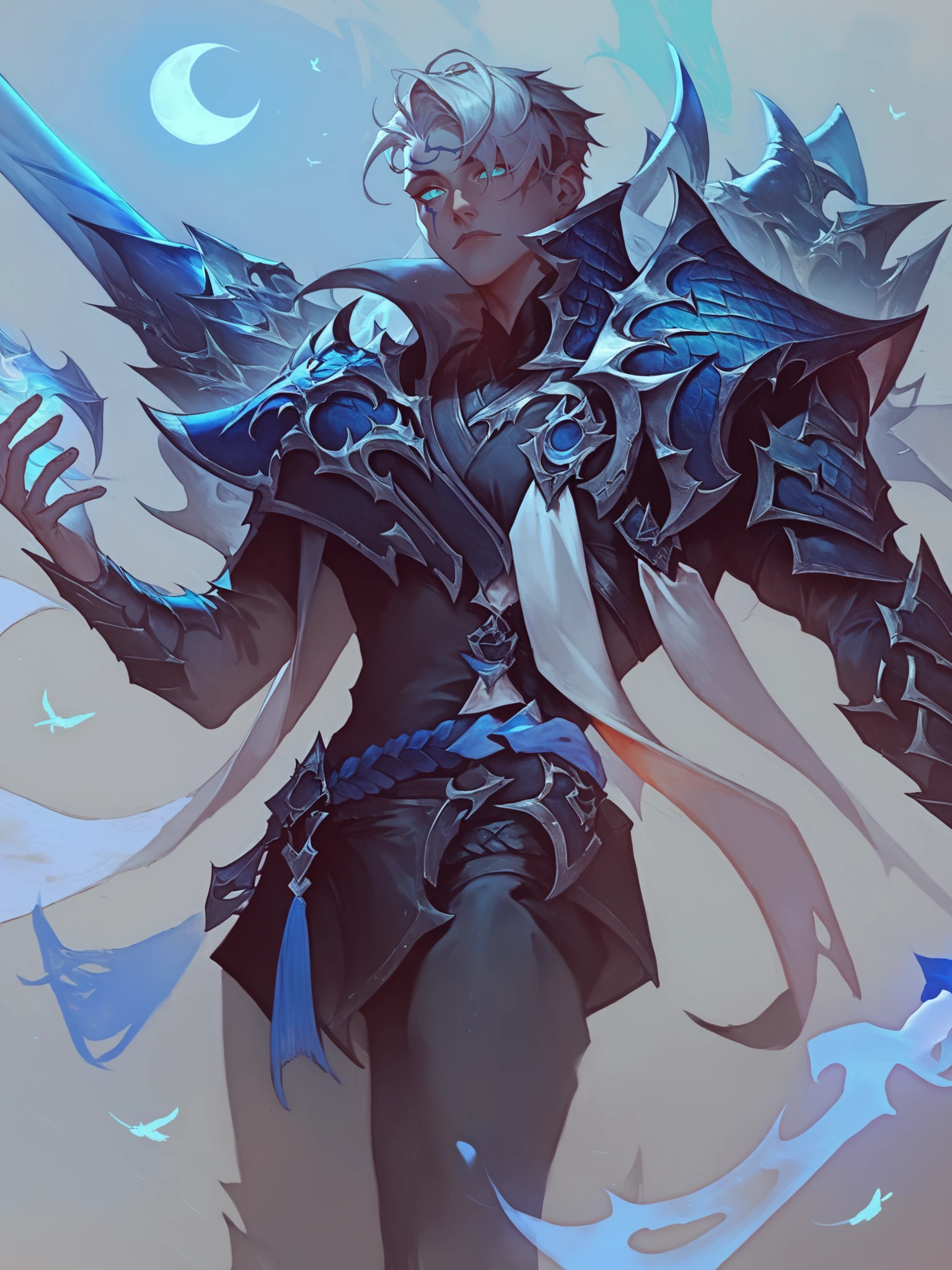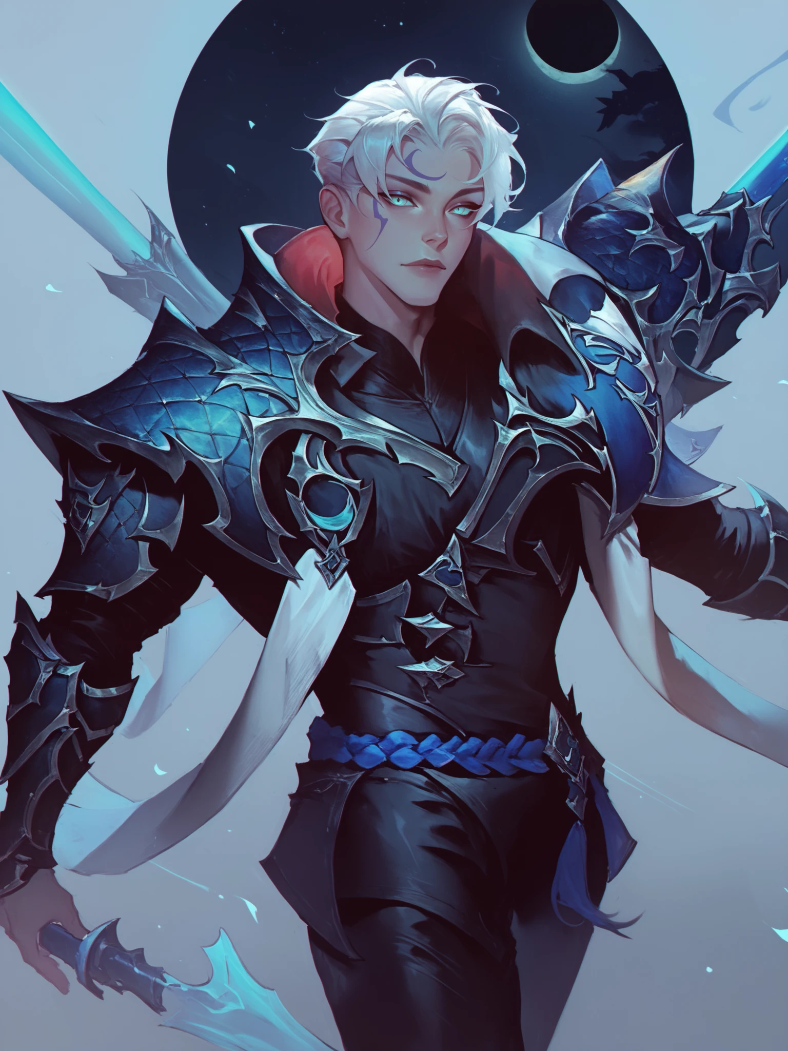 ApheliosEDG, 1man, solo, white_short_hair, blue_armored_jacket, turquoise_eyes, face_makeup, black_shirt,