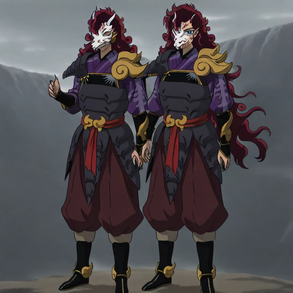 japanese clothes, long sleeved top, purple and lavender top, black undershirt, reddish pants, black gold trimmed armor, black gauntlets, black bootsOptional Prompt: maskDescription
