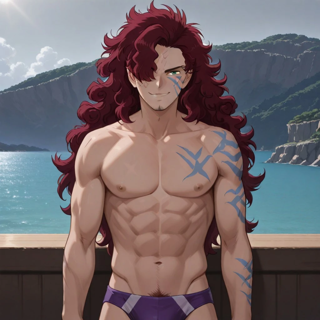 1boy, solo, male focus, Kirinmaru, mature male, tall male, long hair, bulbous hair, pubic hair, hair over one eye, red hair, green eyes, scales on right cheek, scales on forehead, blue markings on left cheek, greyish-purple nails, sharp nailsAttire Prompt:
