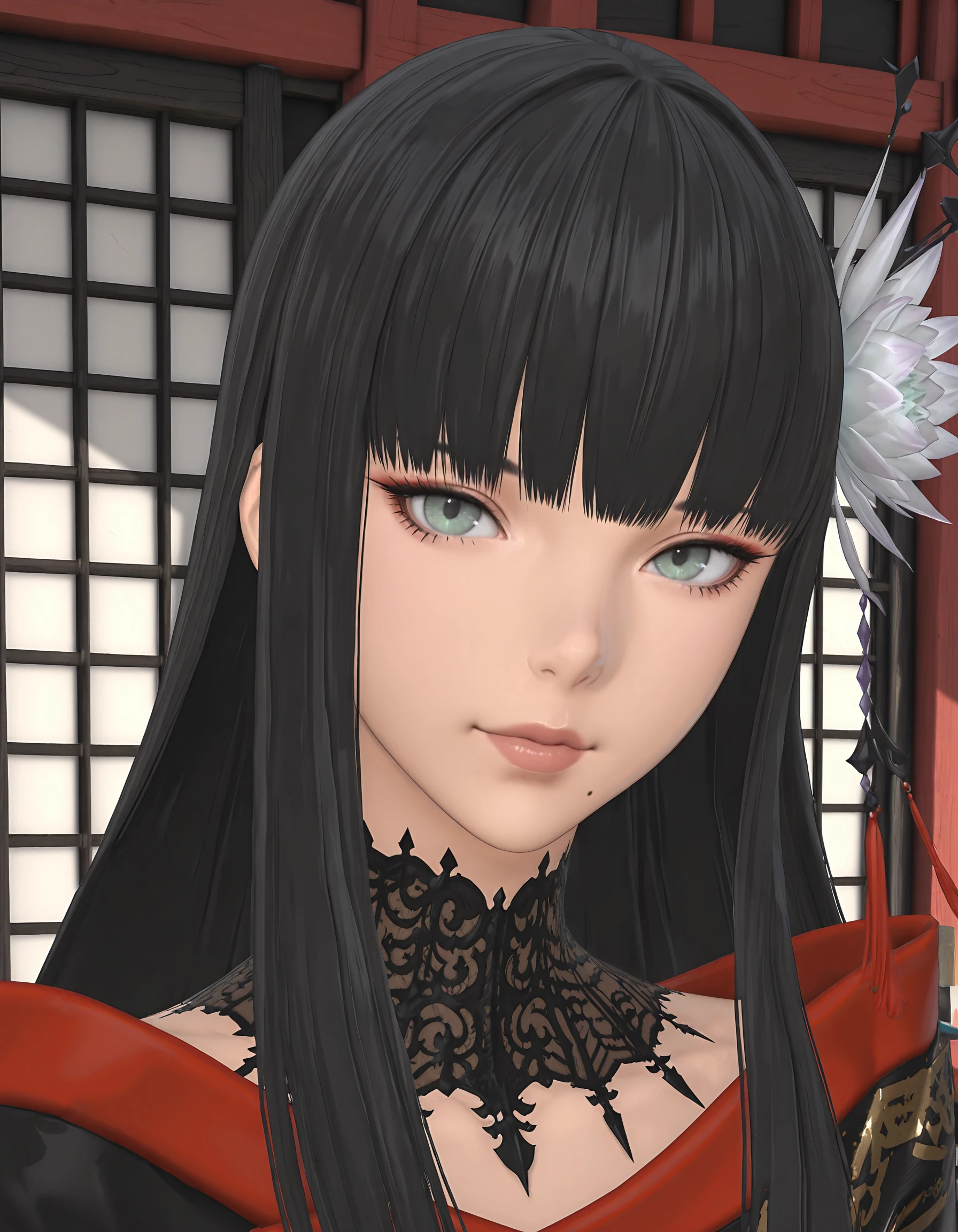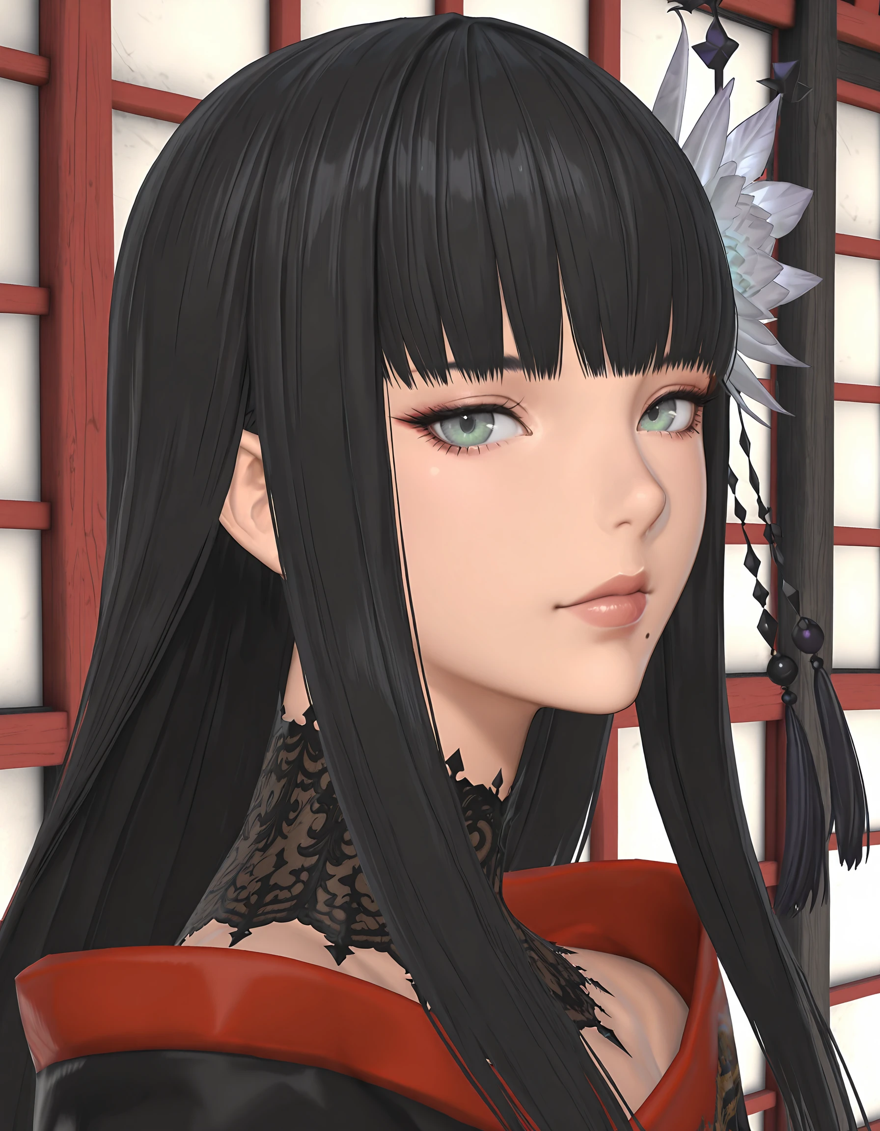 <lora:Yotsuyu_FF14_Illustrious:1>, YotsuyuFF14, gray eyes, green eyes, black hair, long hair, straight hair, bangs, hair flower, hair ornament, mole under mouth,