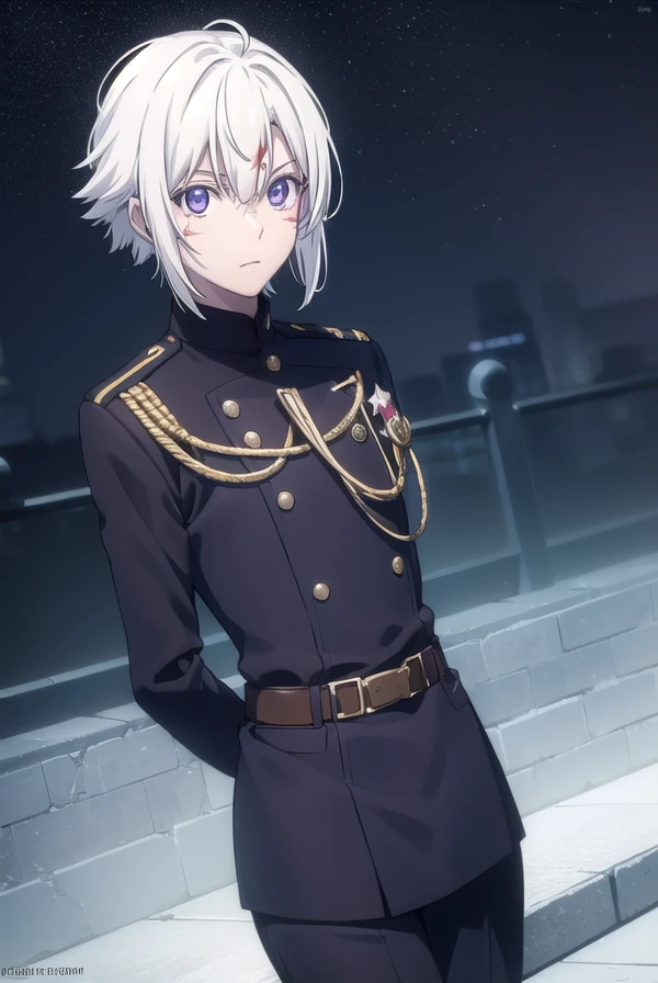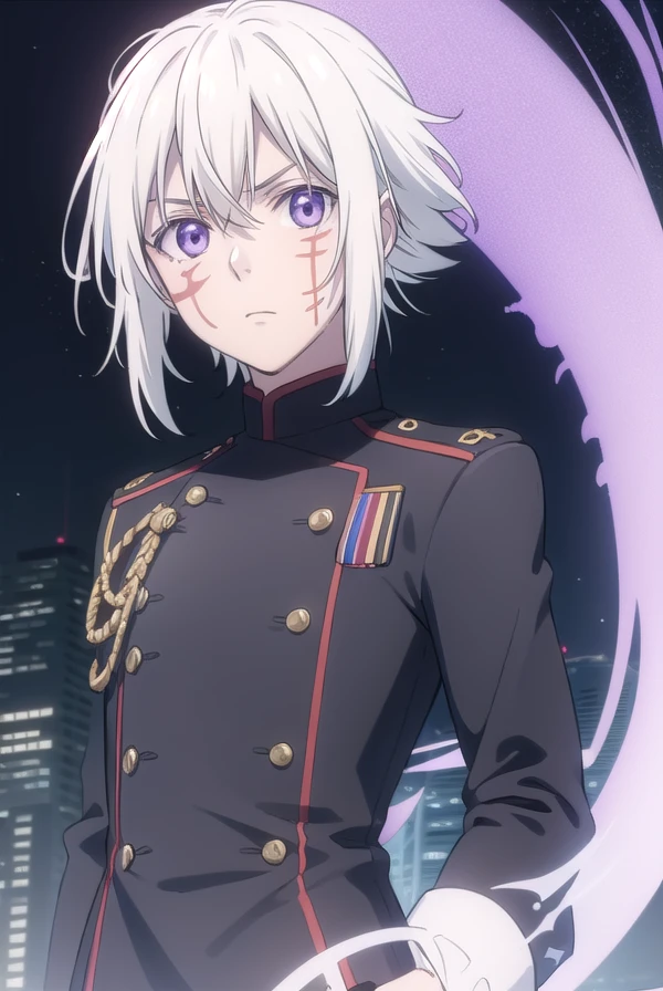 allen walker, (purple eyes:1.1), white hair, male focus, scar, facial mark,