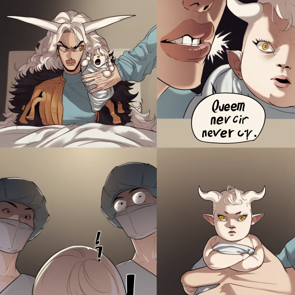 mikus-concept, crying, seriousness, lying, 2people, BREAK, child, Text "Queen never cry", surprise, close-up, BREAK, 2people, shock, doctors, BREAK, child, seriousness, looking at viewer, BREAK, comic