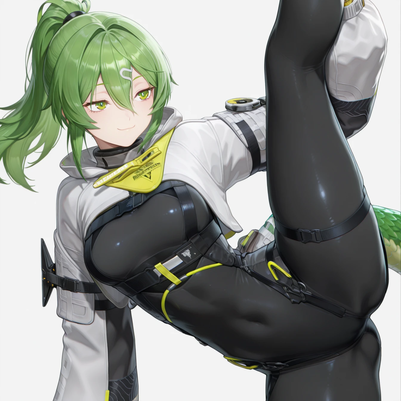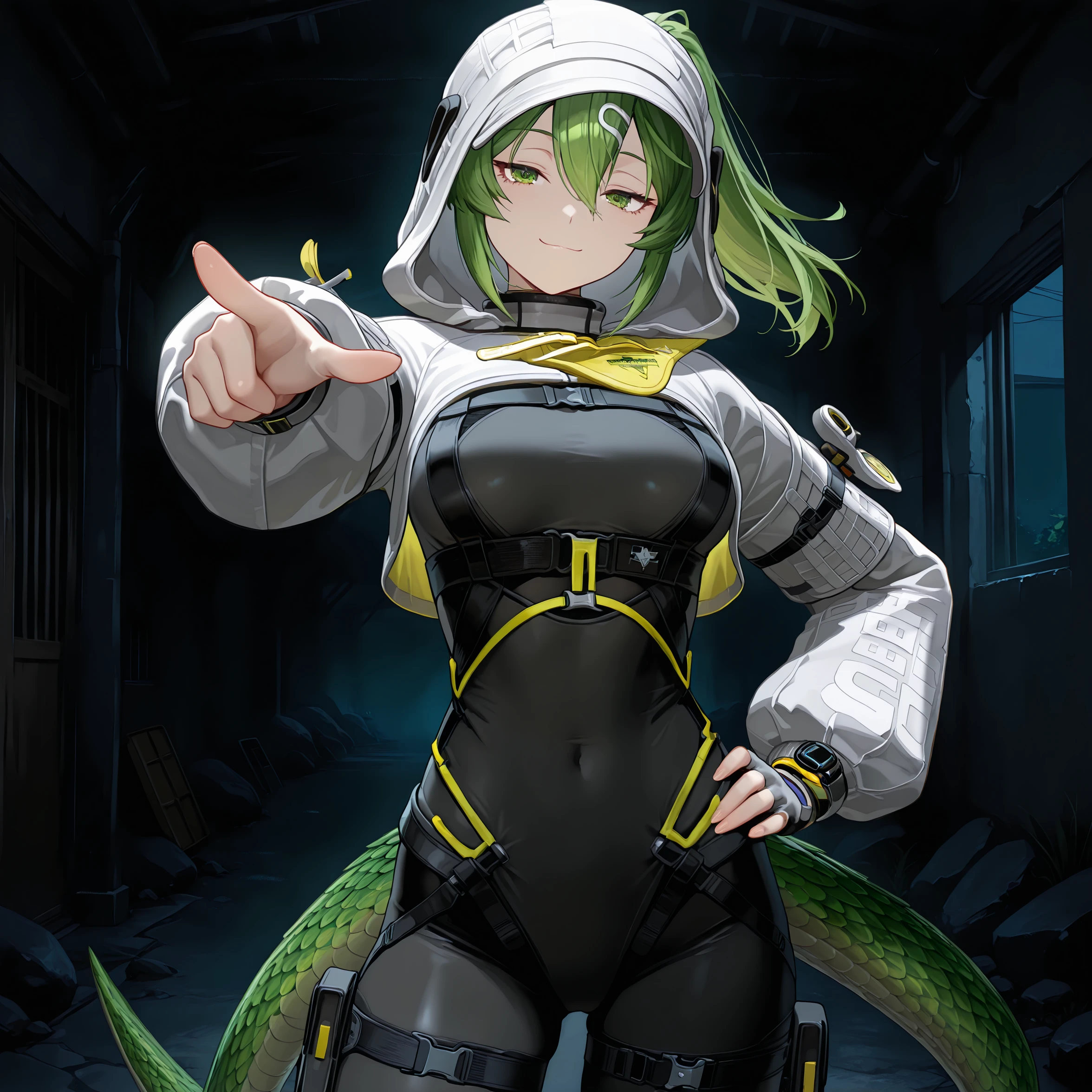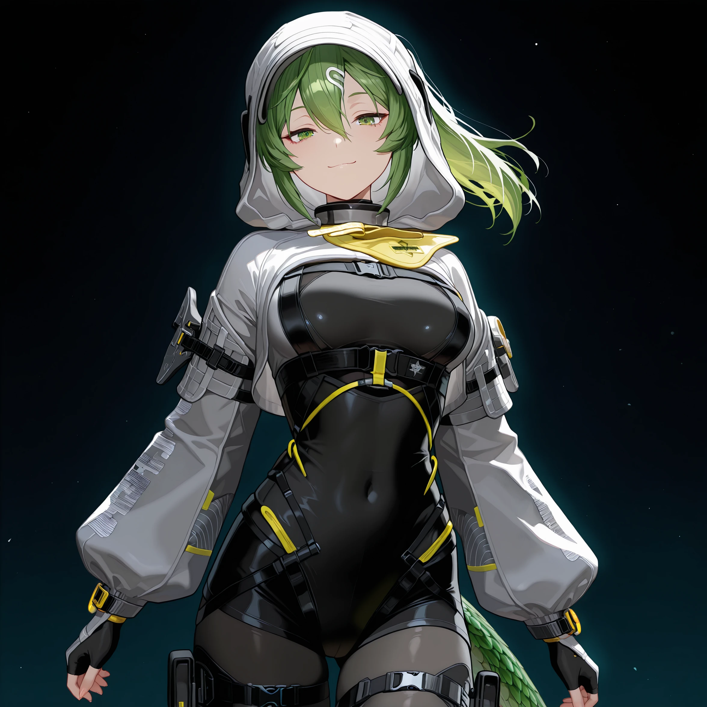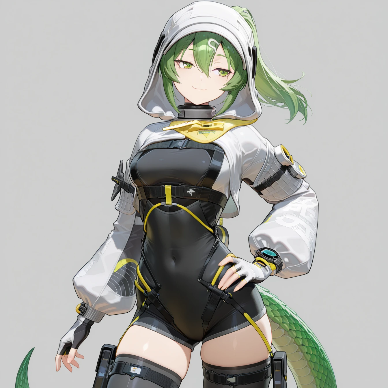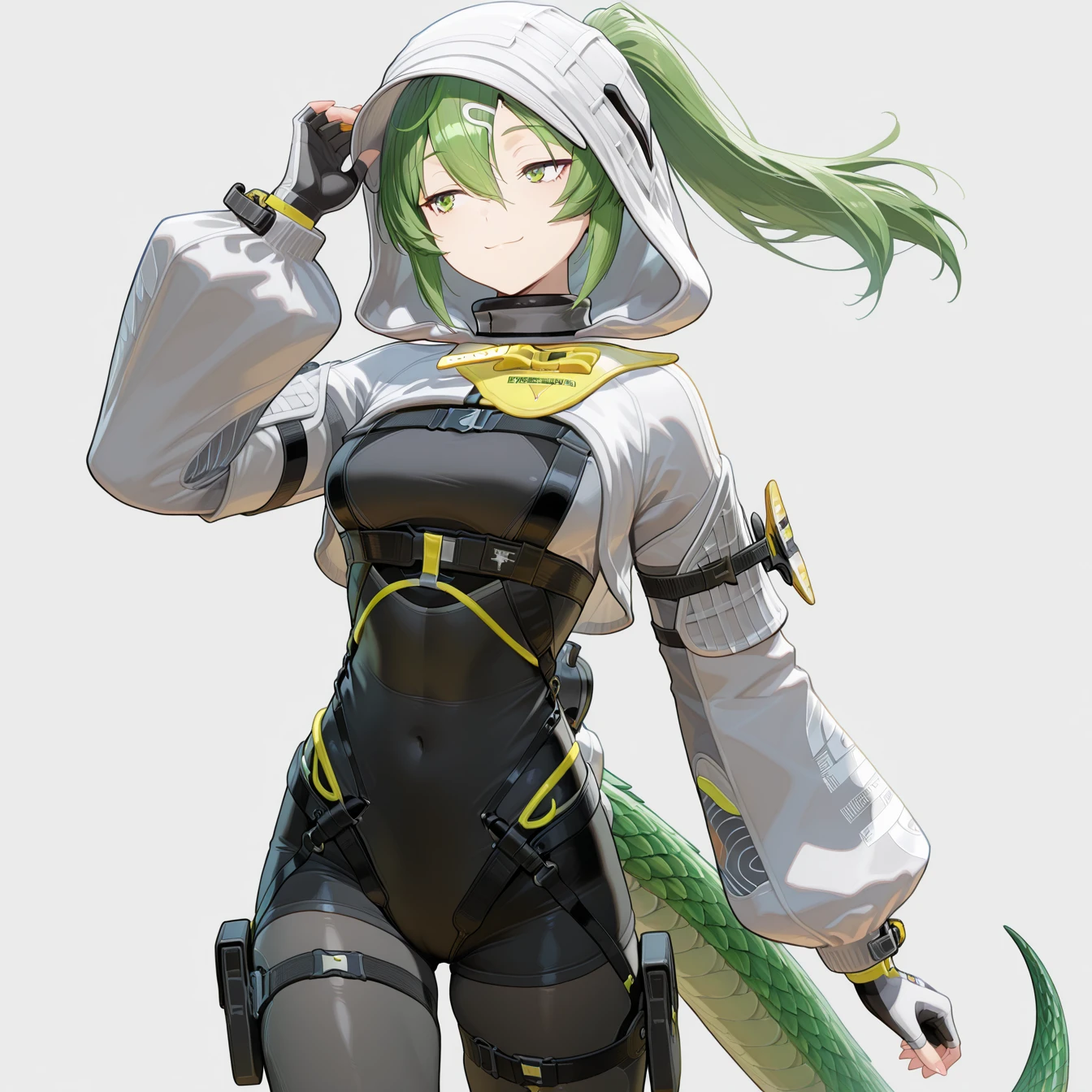 jacket, gloves, pants, boots, tail。如果你不想要兜帽,在负面提示词加