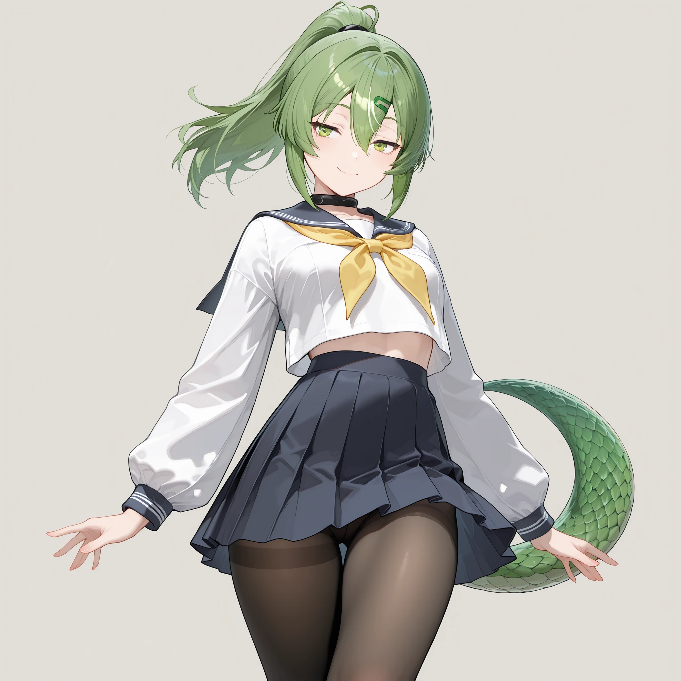 masterpiece, best quality, amazing quality, Fluorite, 1girl, solo, cowboy shot, simple background, smile, closed mouth,全身可尝试添加full body, boots 等。