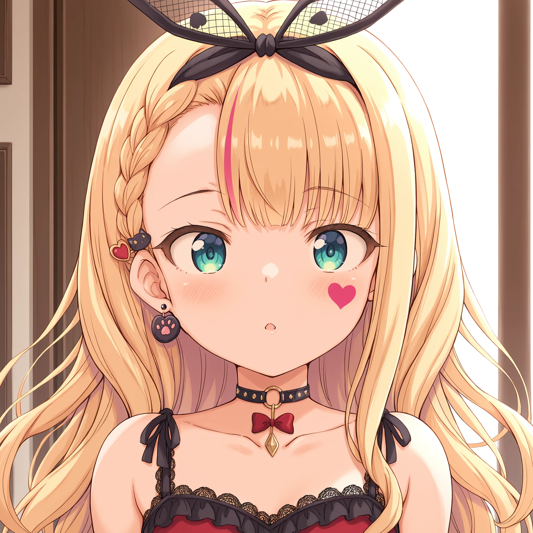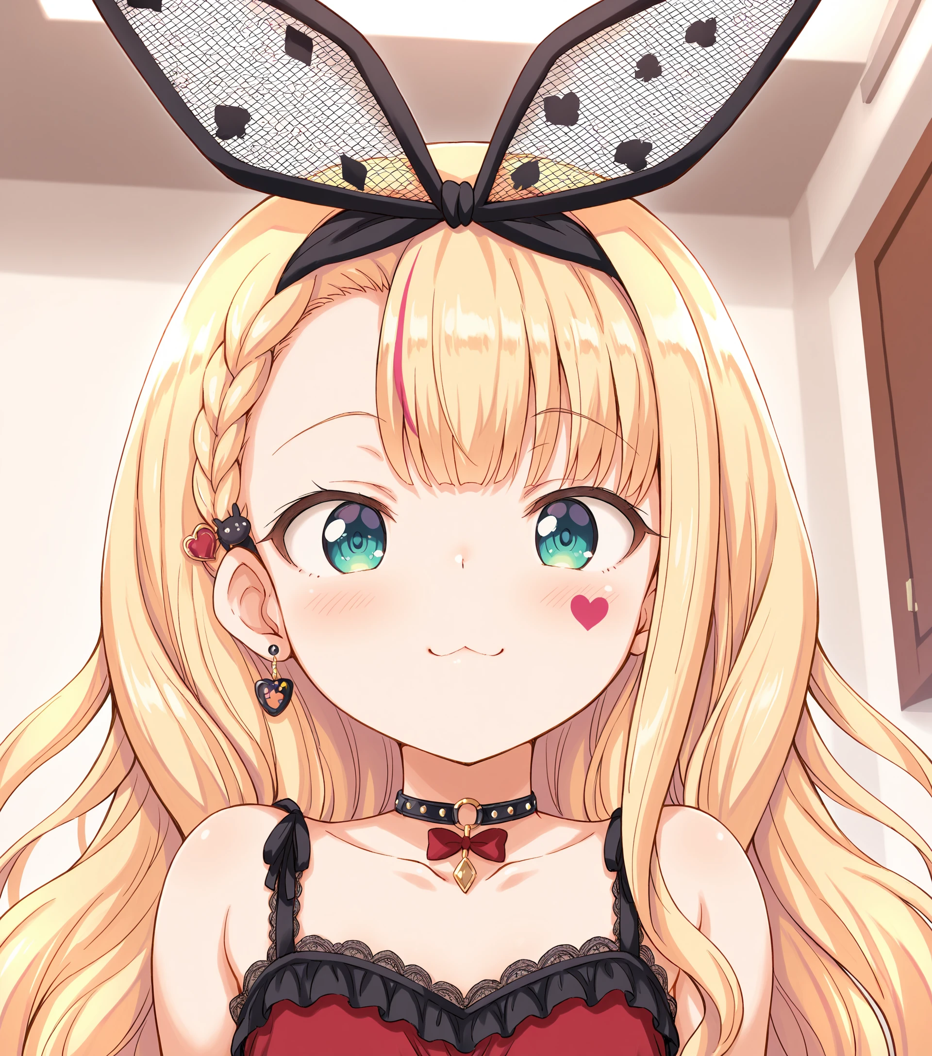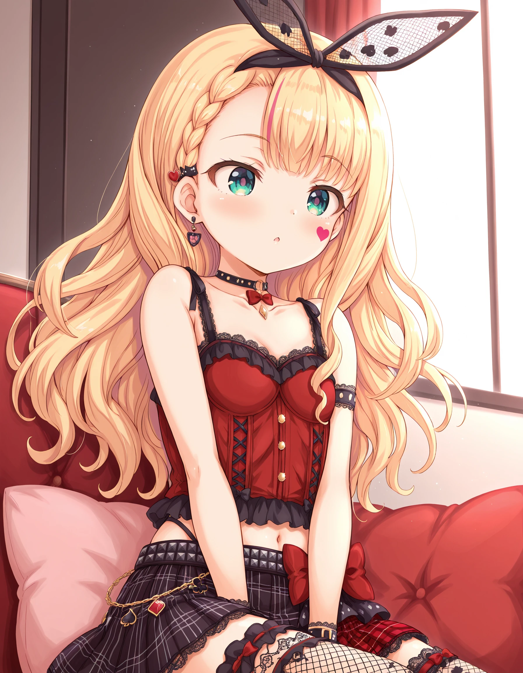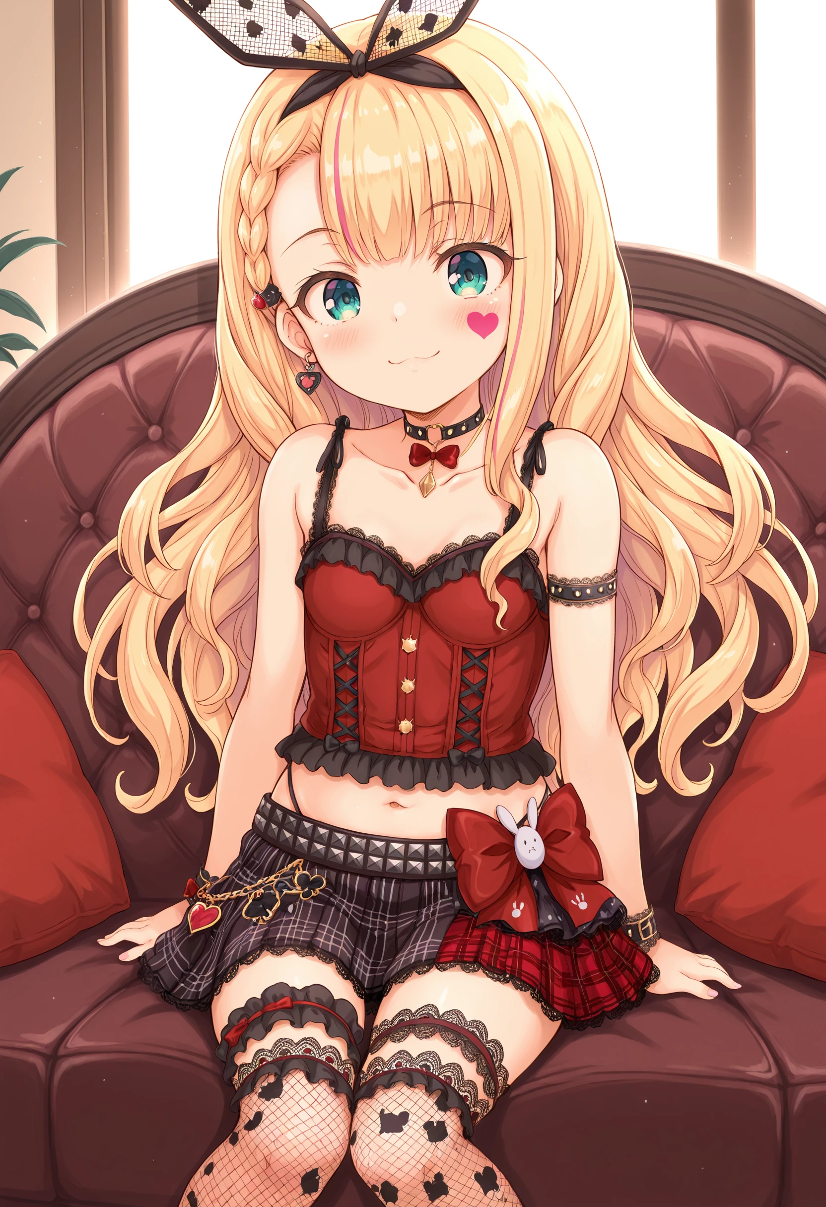 mononobe alice \(punkstyle\), rabbit ear hairband, streaked hair, braided bangs, hairpin, earrings, facial mark, green eyes, very long hair, blonde hair, wavy hair, choker, collarbone, arm strap, wristband, pink nails, camisole, navel, highleg panties, plaid skirt, fishnet thighhighs, thigh strap, 可能会用到的负面提示词