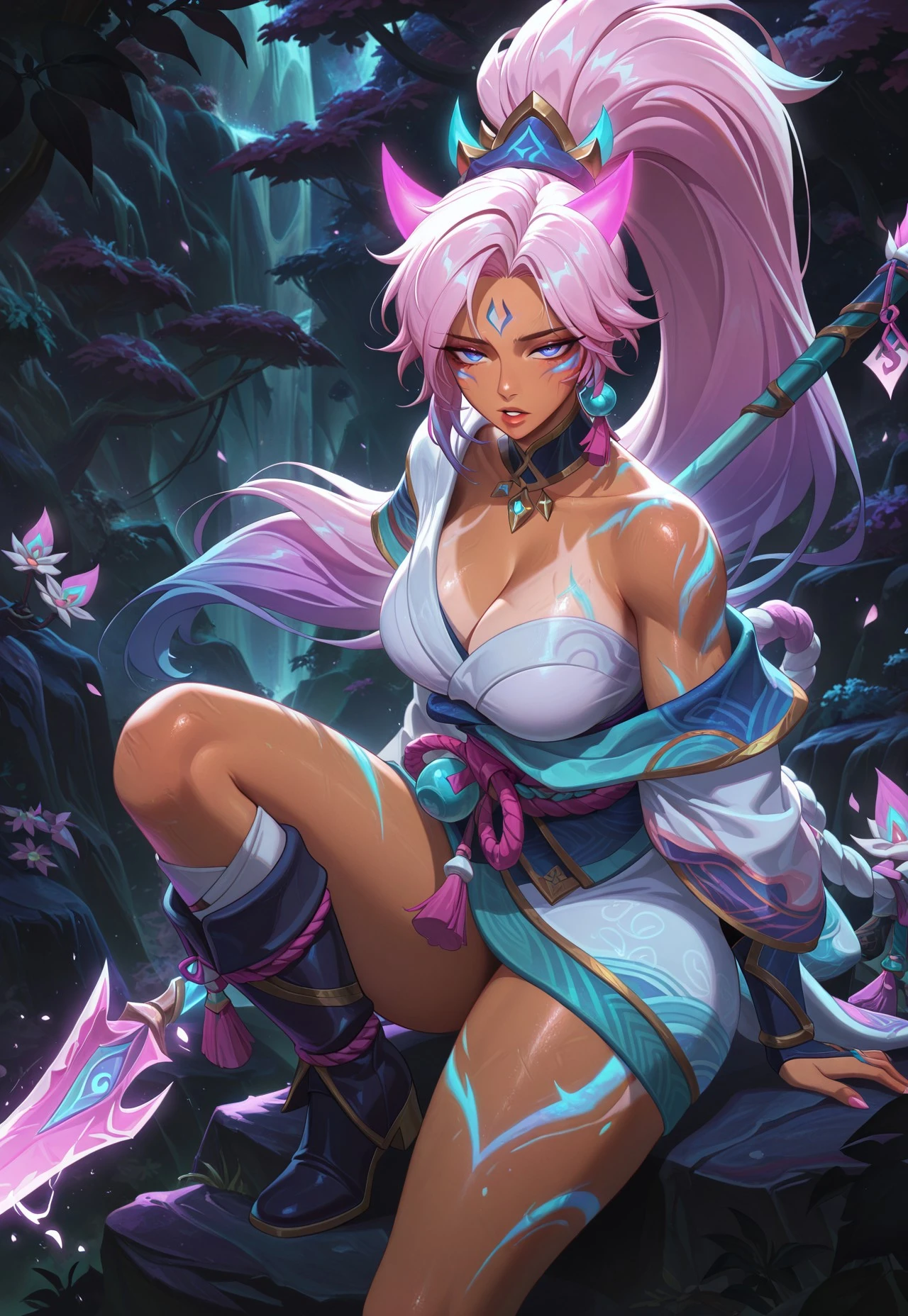 SBnidalee,pink hair,gradient hair,hair ornament,ponytail,tan skin,forehead mark,face marks,japanese clothes,boots,spear,