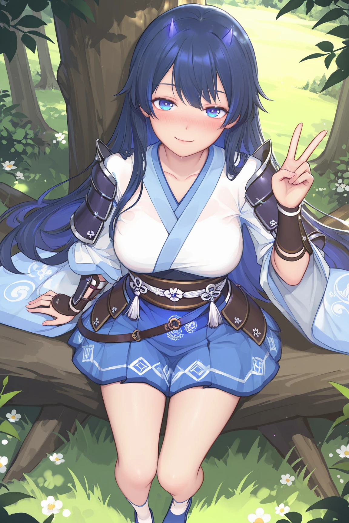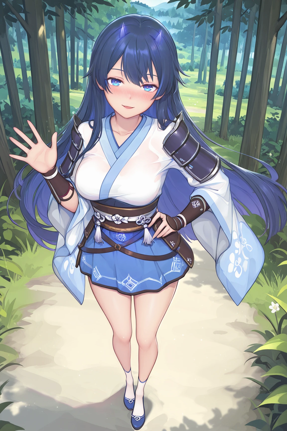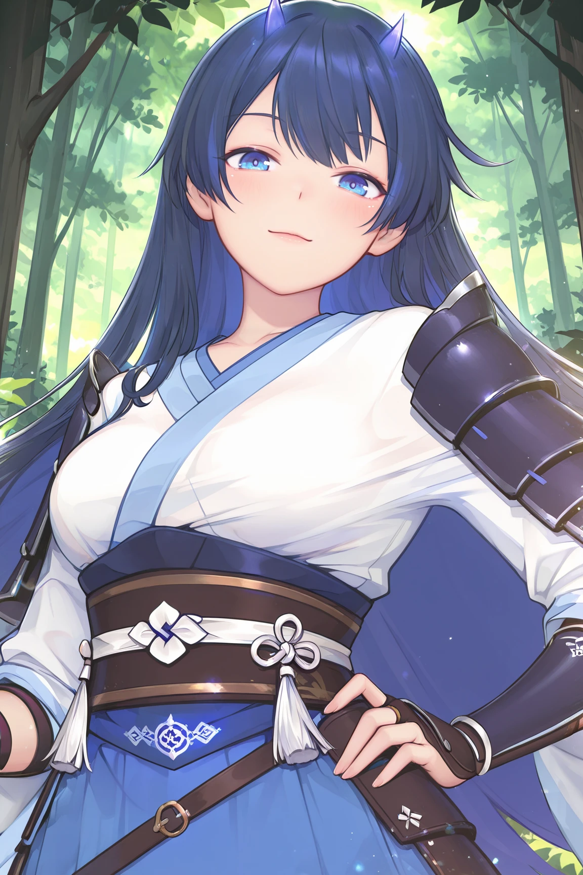 SayaICILXL, blue eyes, blue hair, long hair, purple horns, small horns, bangs, large breasts, shoulder armor, white japanese clothes, blue sash, white obi, brown guantlets, armor hips, blue skirt, white socks, blue shoes