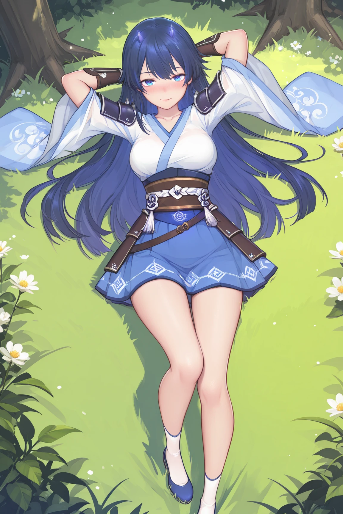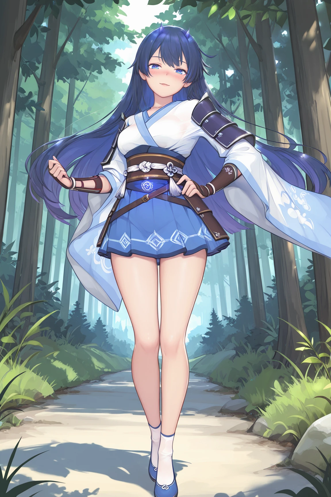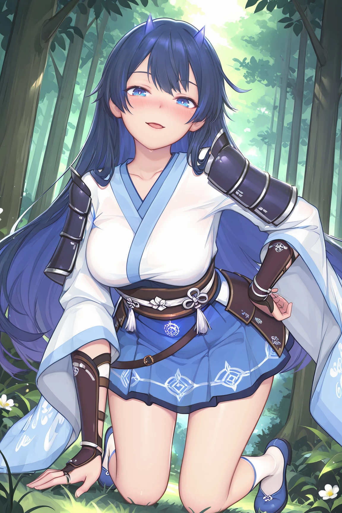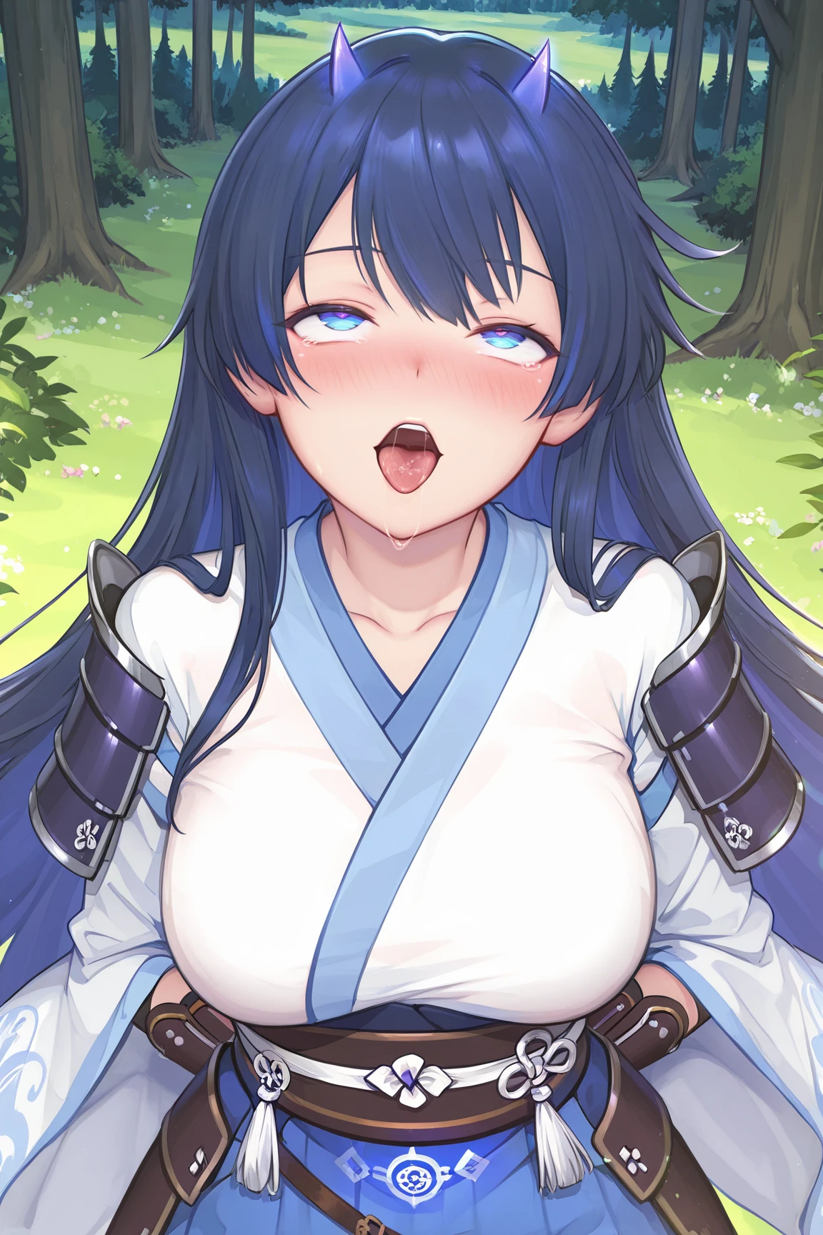 SayaICILXL, blue eyes, blue hair, long hair, purple horns, small horns, bangs, large breasts, shoulder armor, white japanese clothes, blue sash, white obi, brown guantlets, armor hips, blue skirt, white socks, blue shoes