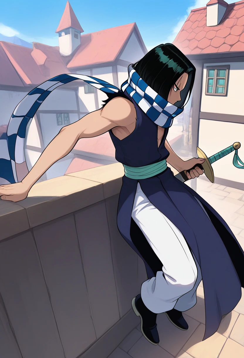 outfit: checkered scarf, sleeveless coat, white pants, sash, white footwear