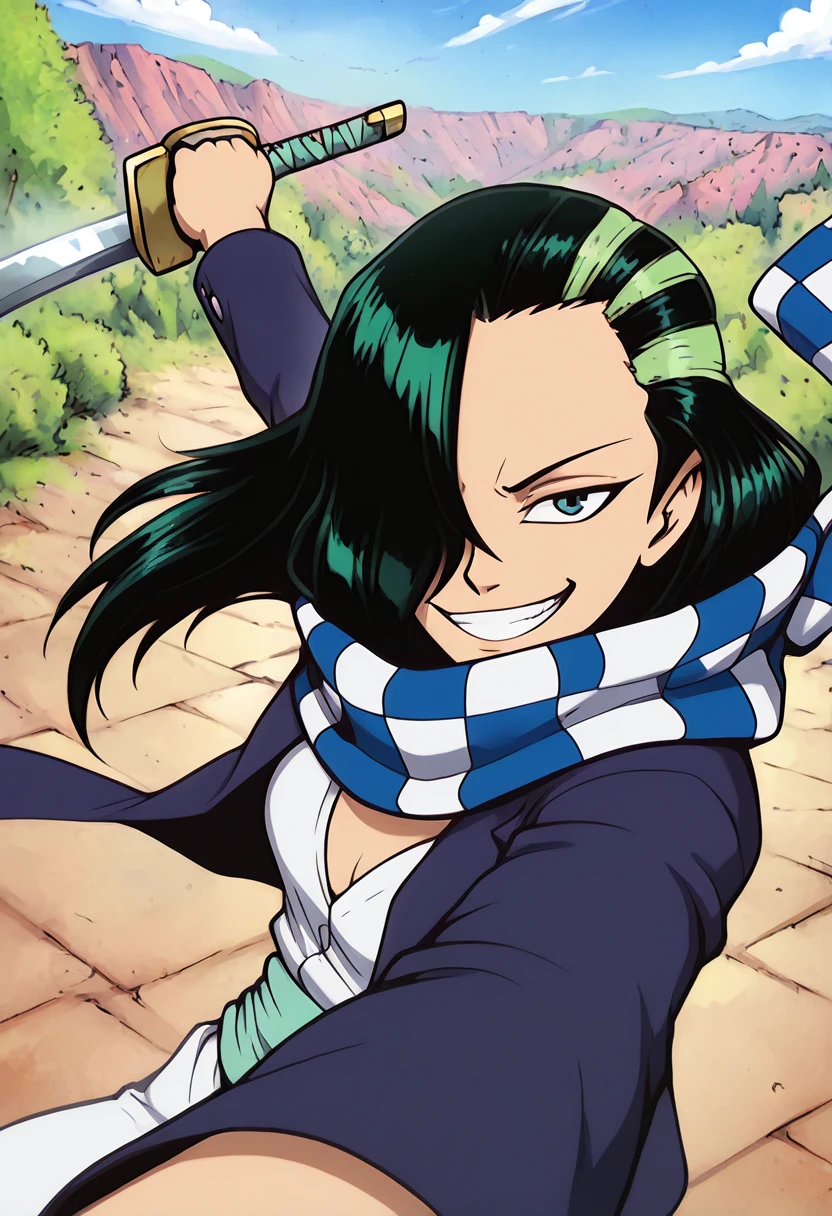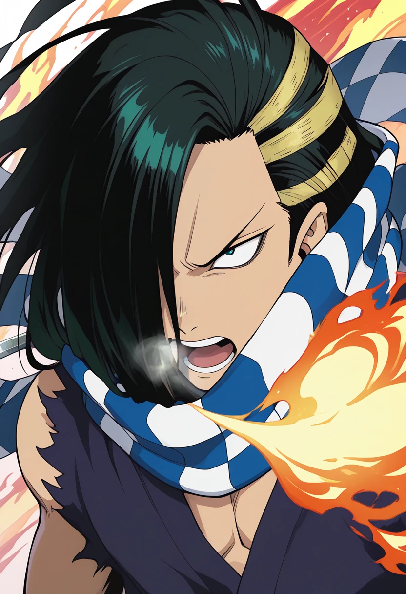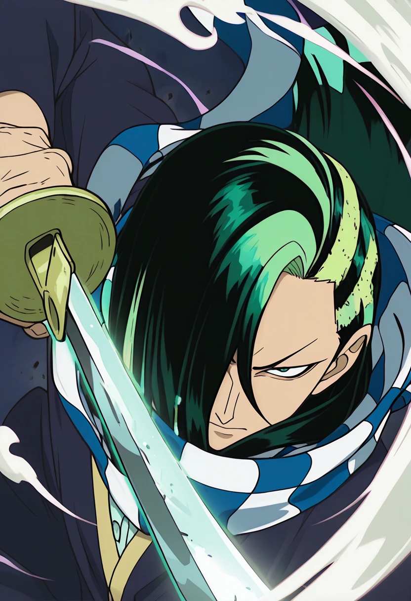 trigger words: cabaji, 1boy, green hair, black hair, hair over one eye, black eyes