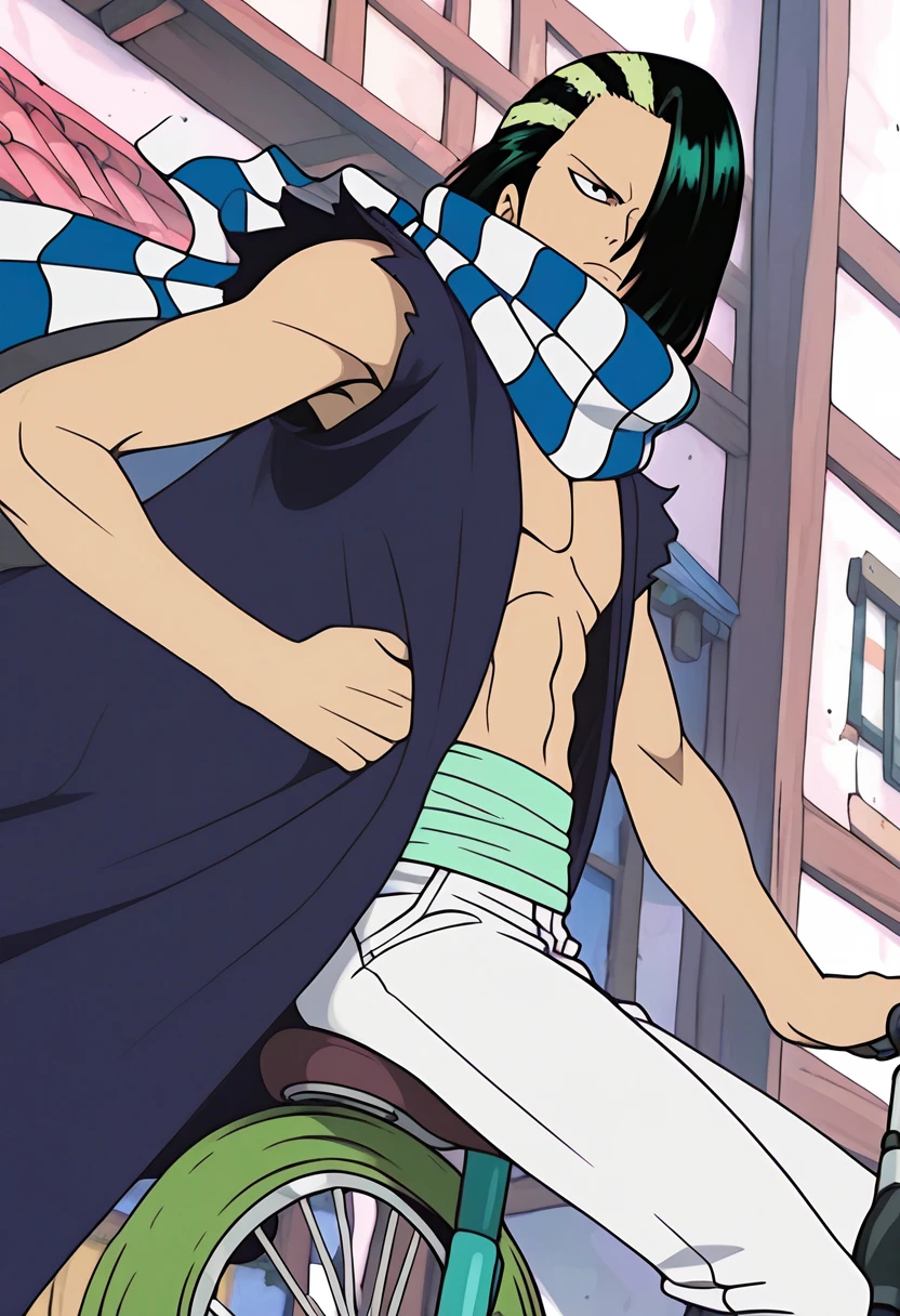 A character LoRa for Cabaji from One Piece. He first appears in Episode 7 "Grand Duel! Zoro the Swordsman vs. Cabaji the Acrobat!" of the anime and is an acrobat swordsman and the chief of staff of the Buggy Pirates. Trained with screencaps of Orange Town Arc only. The "unicycle" he is riding on did not bake in very good, but you can try using that tag. Can be used at weight 1.0, but I think I got the best results slightly below.
