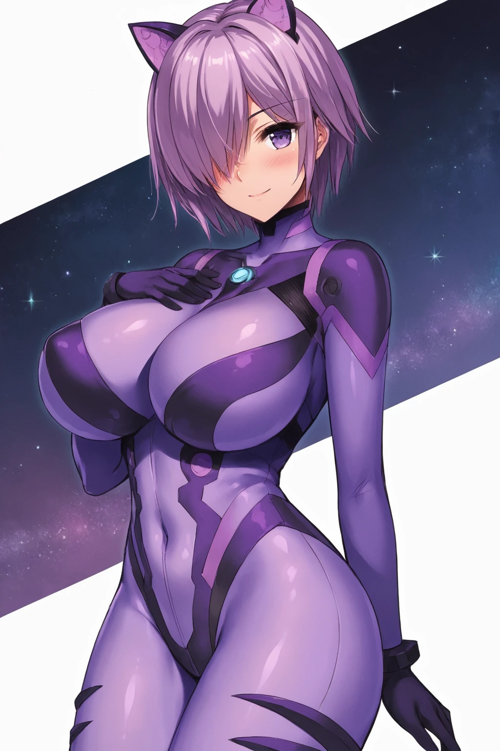 phee kissthermite, short hair, hair over one eye, purple hair, purple eyes, large breasts,