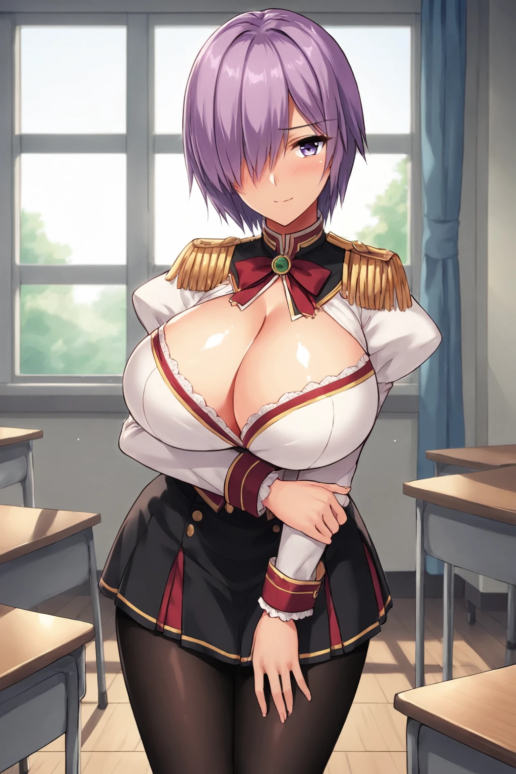 white top, cleavage cutout, epaulettes, black skirt, long sleeves, juliet sleeves, shiny skin, black pantyhose,