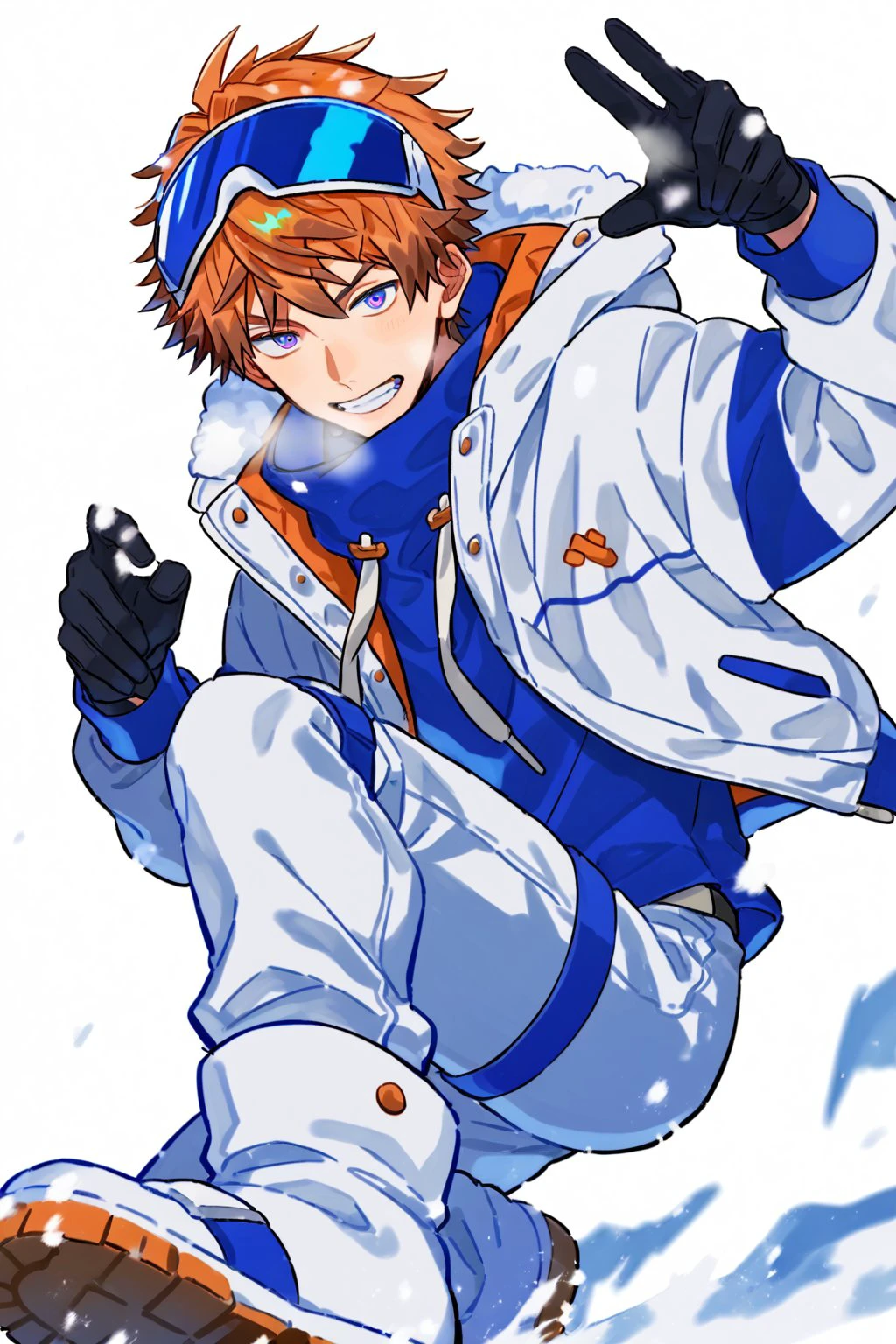 kitami yusei, orange hair, blue eyes, purple eyes, gradient eyes, winter clothes, hooded coat, white coat, fur-trimmed hood, blue shirt, white pants, kneepads, hiking boots, white footwear, goggles on head, black gloves