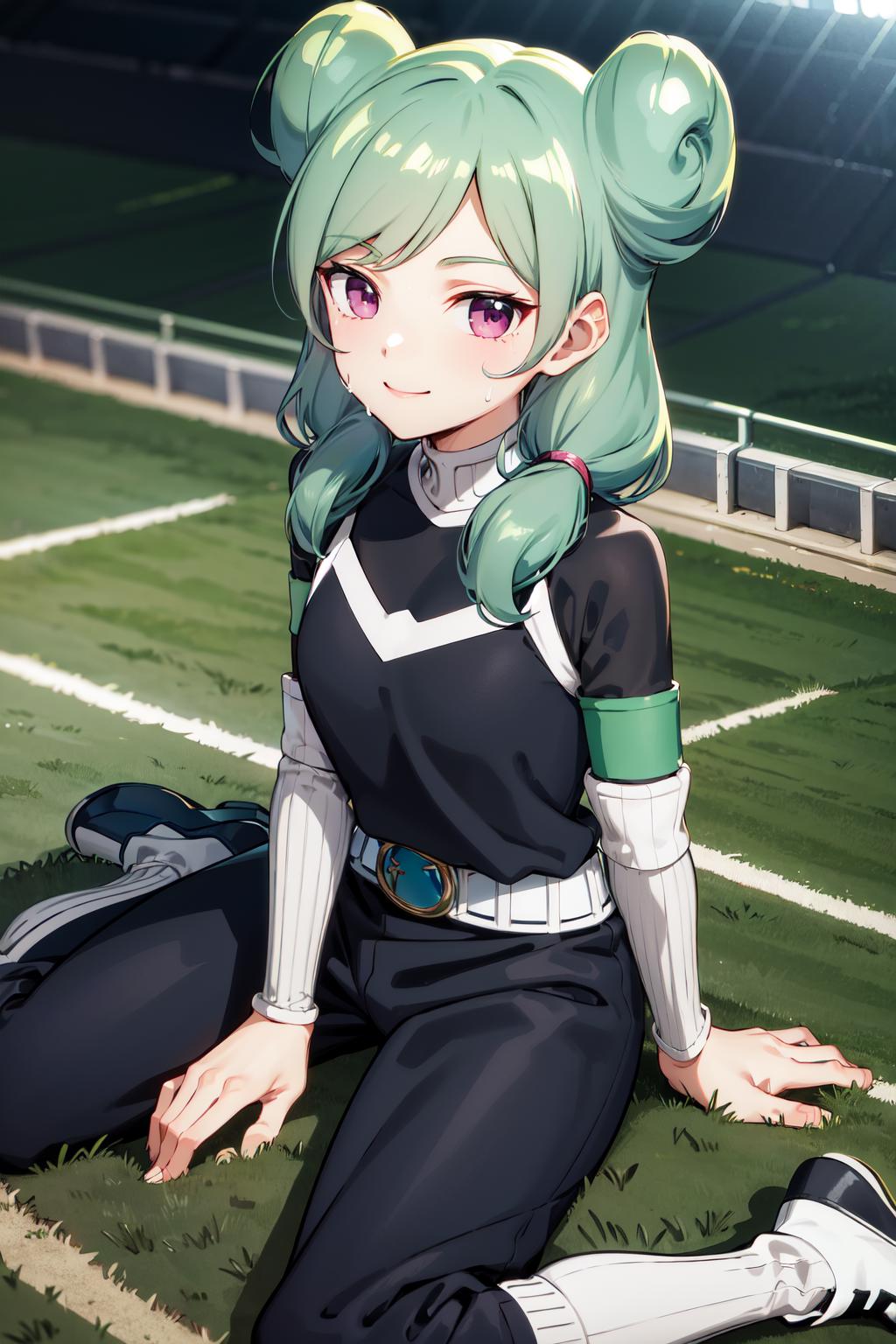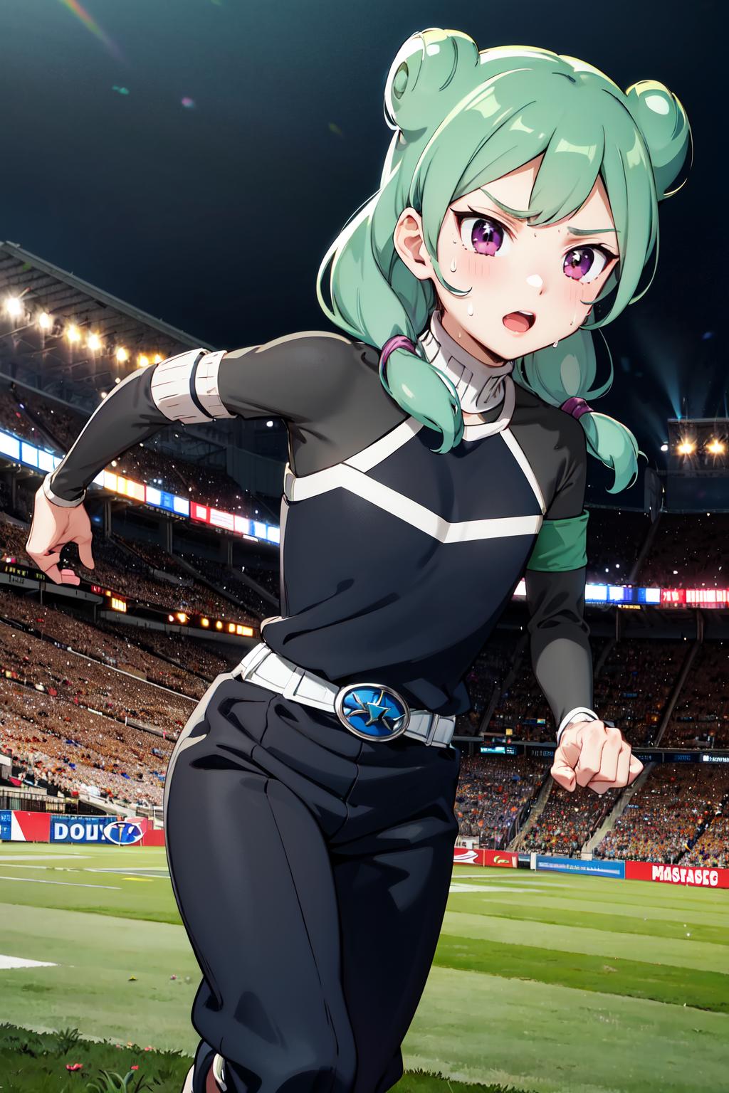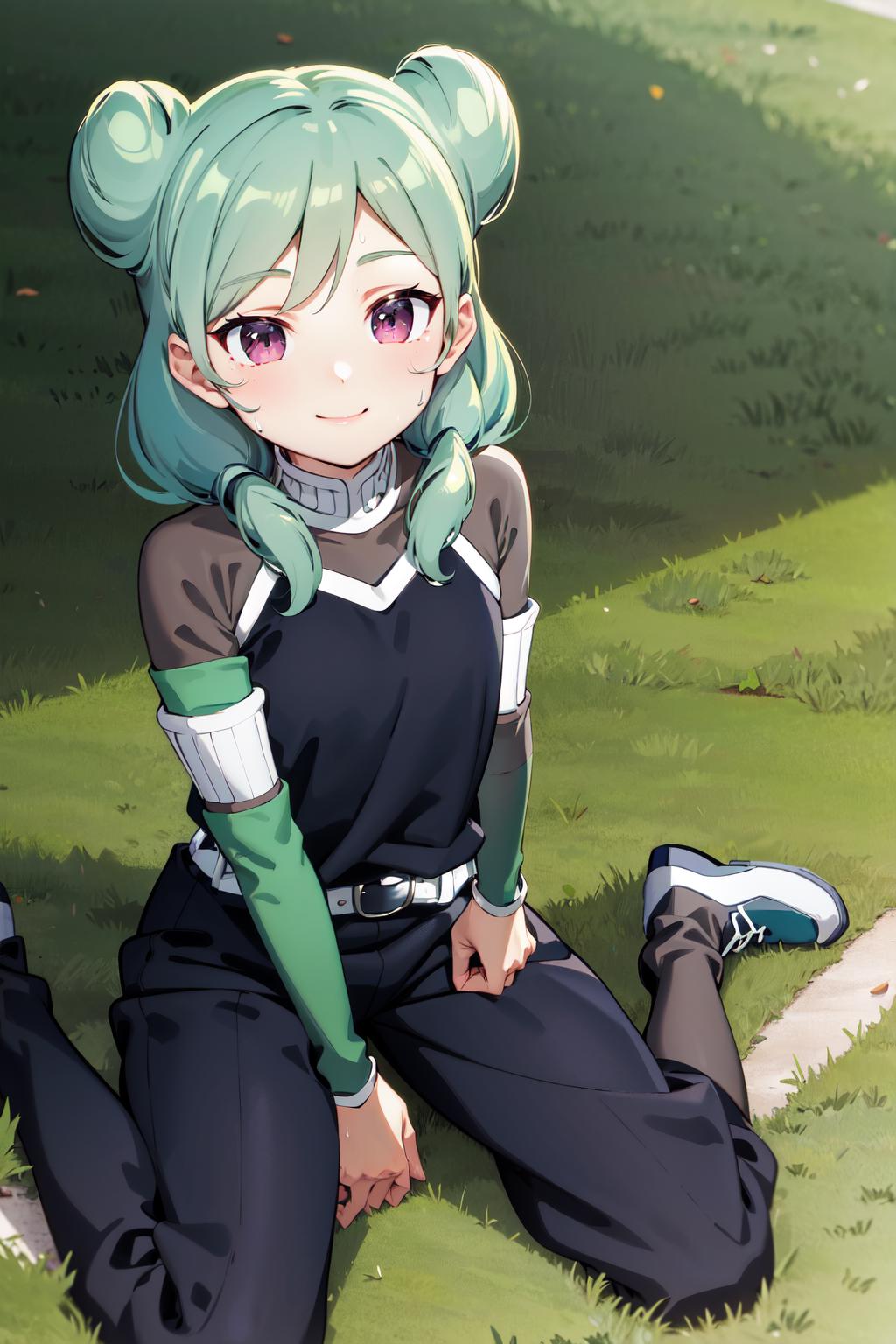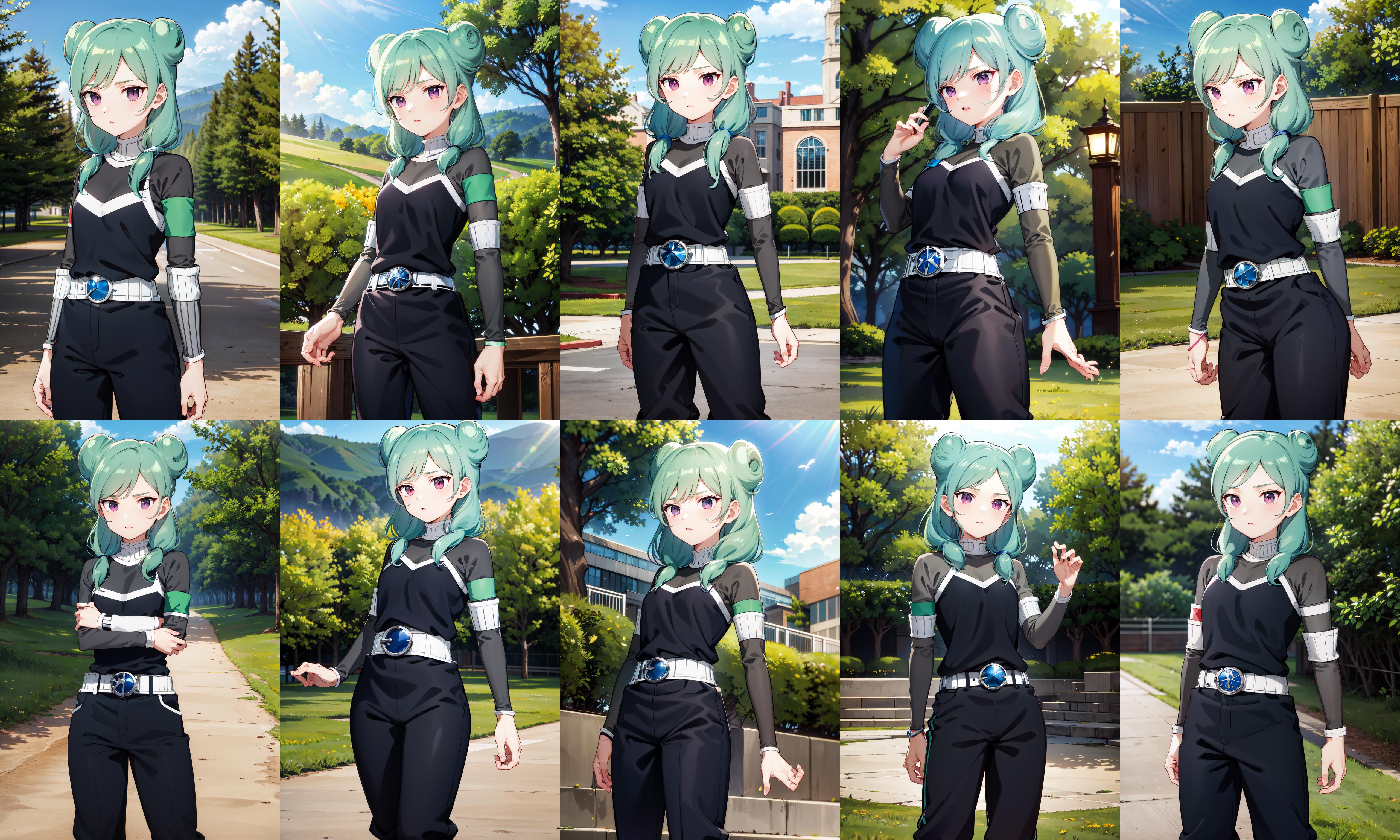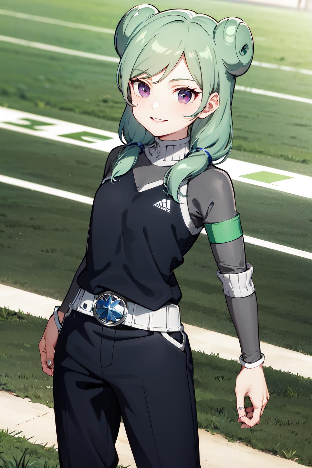 outfit1aabeta, armband, sportswear, double bun, black shirt, belt, black pants