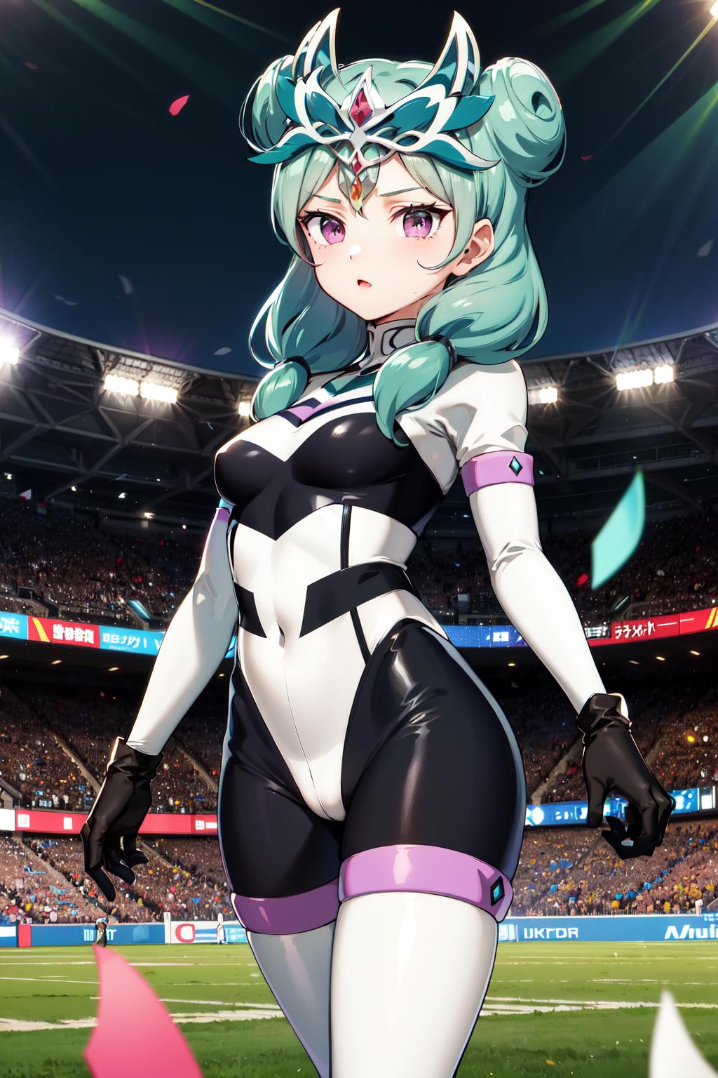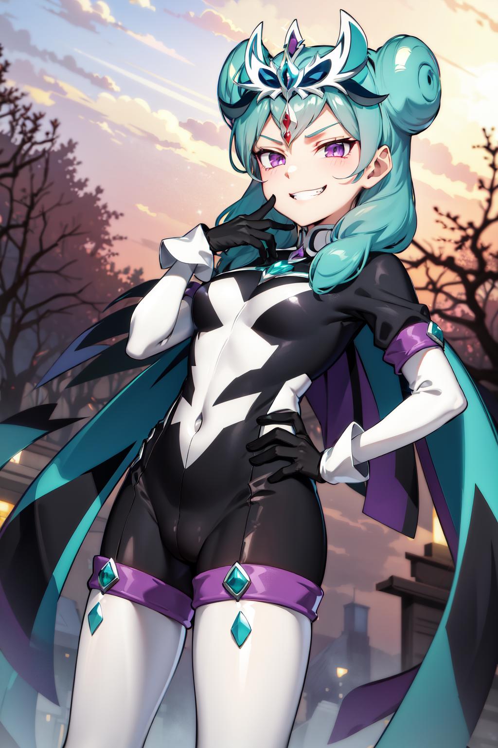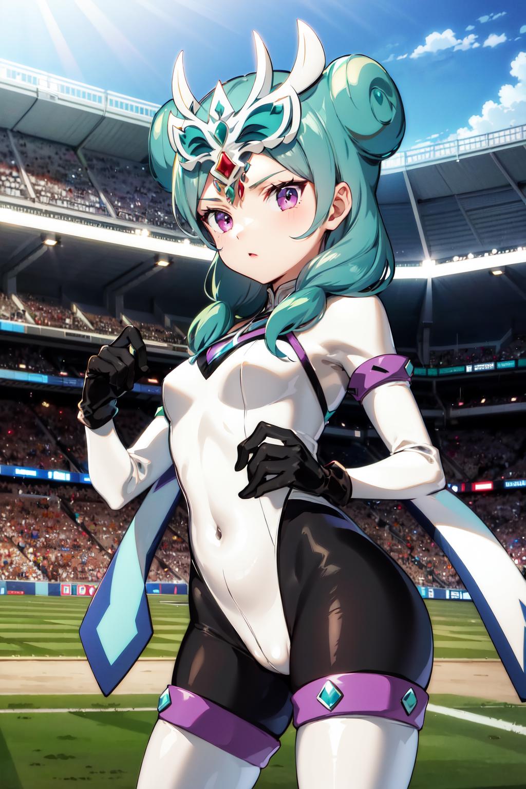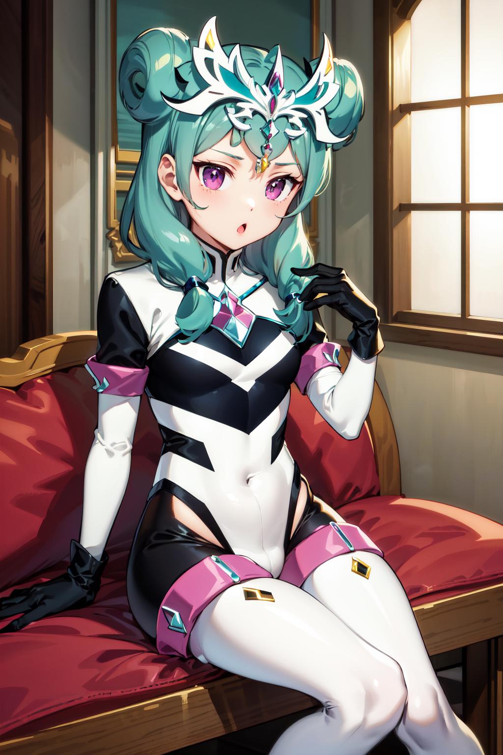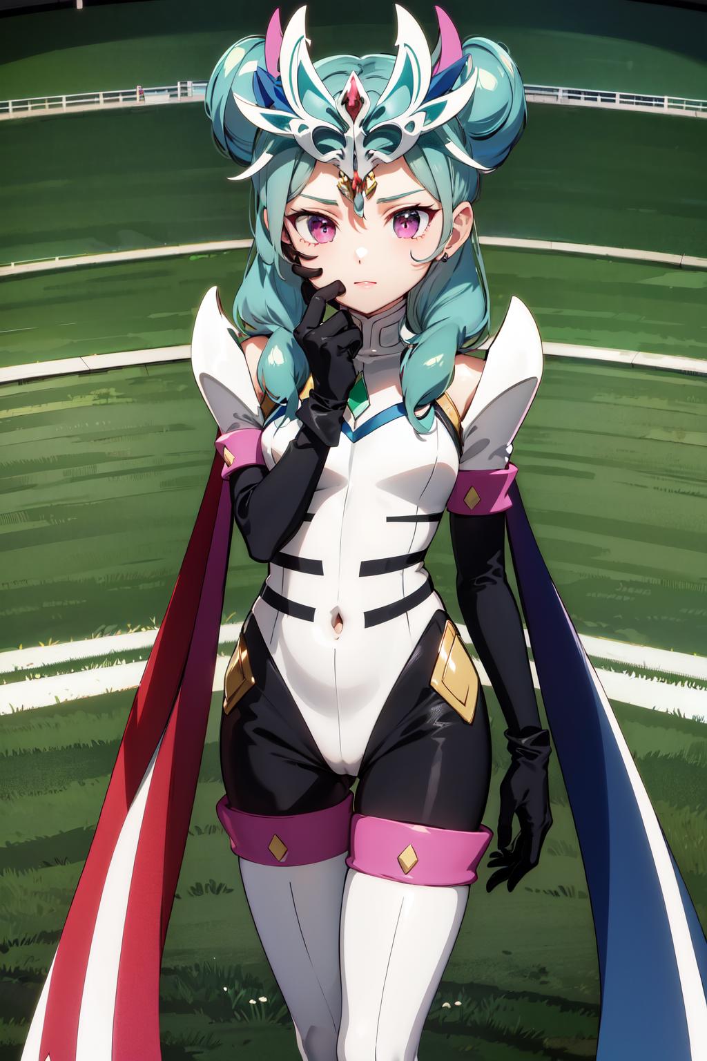 outfit2aabeta, double bun, hair ornament, white bodysuit, black gloves, white thighhighs