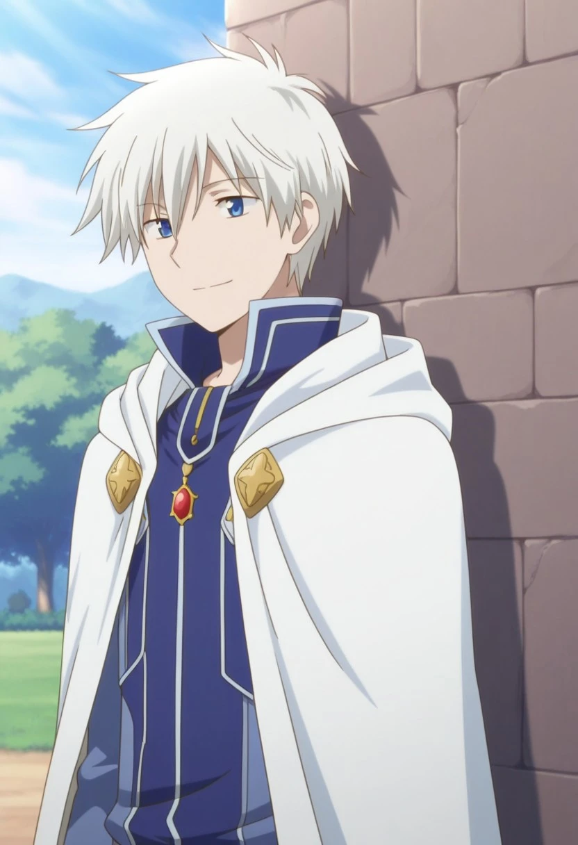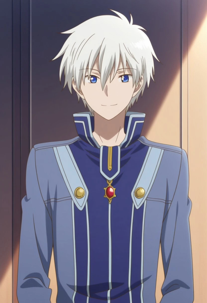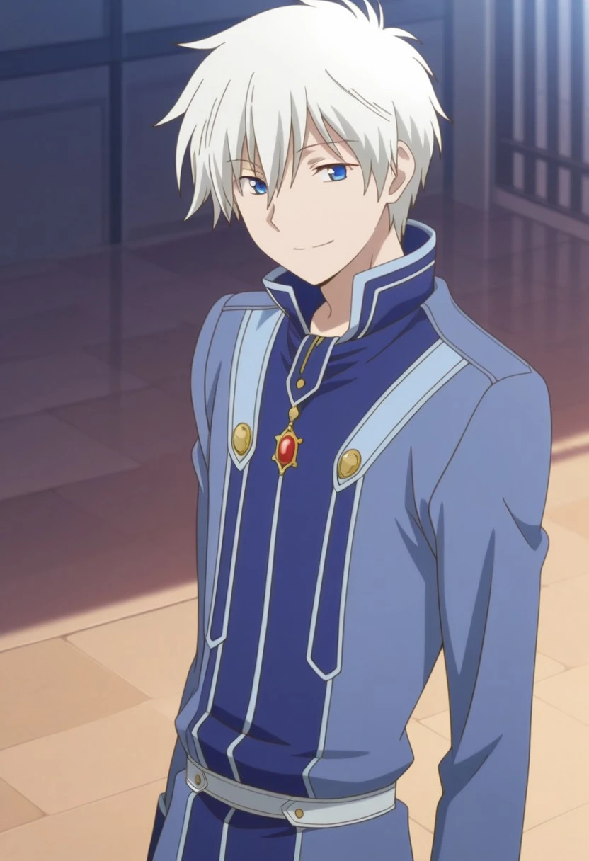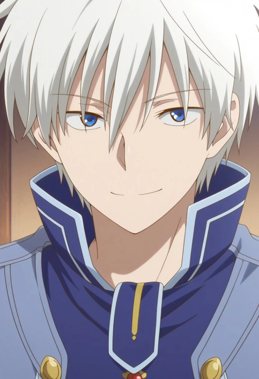 zenwi, 1boy, male focus, solo, blue eyes, boots, uniform, blue uniform, high collar, white hair, blue footwear,