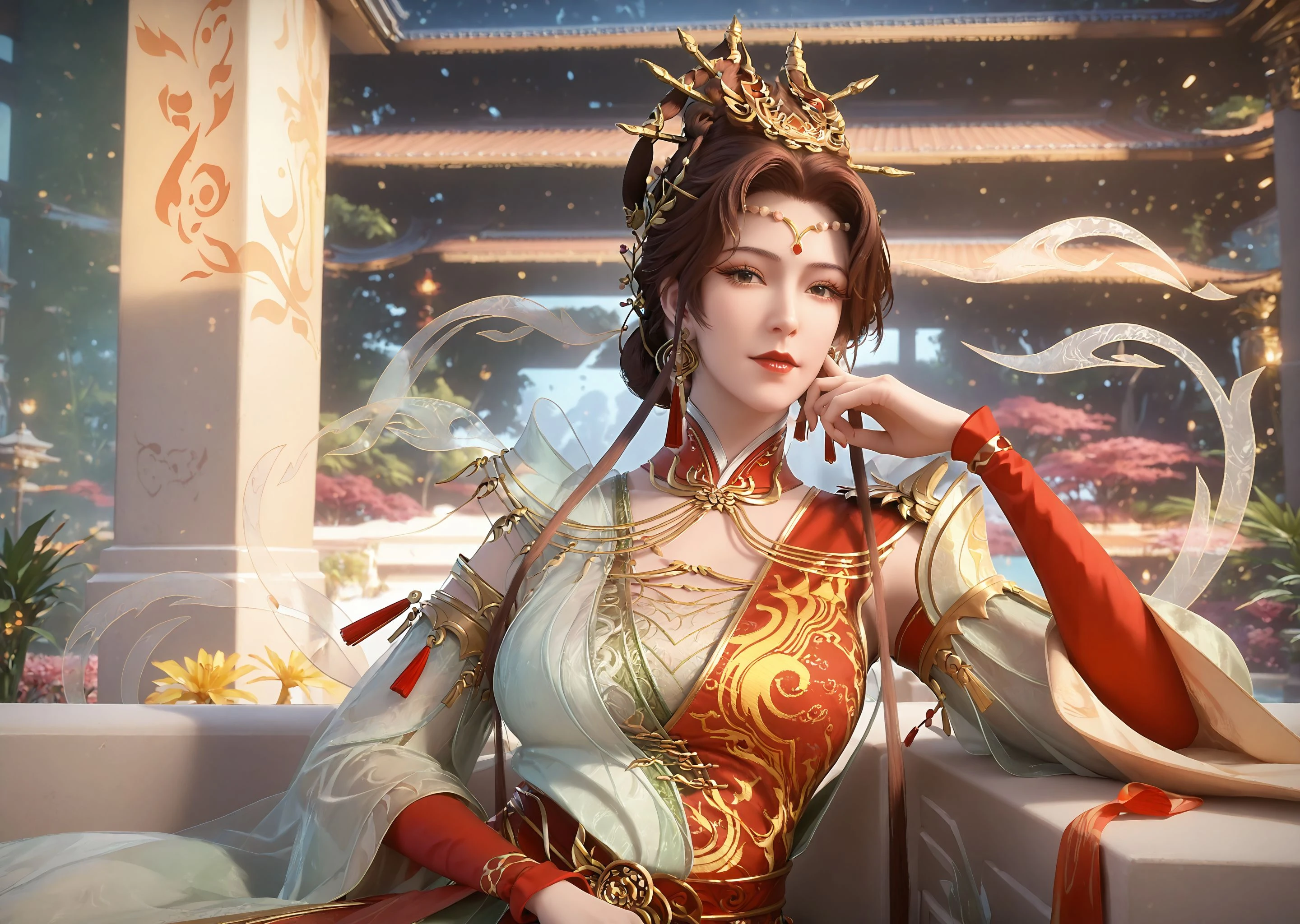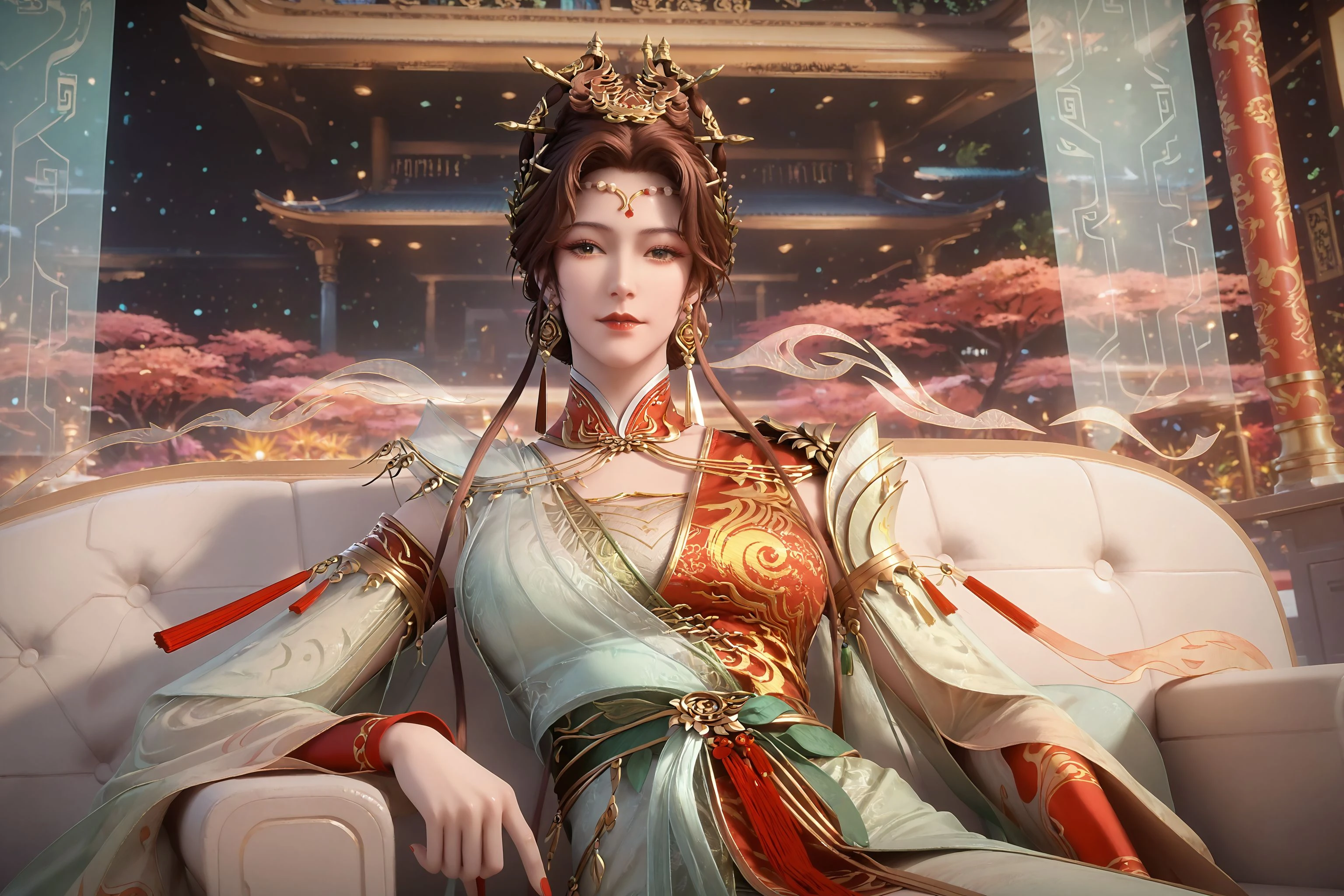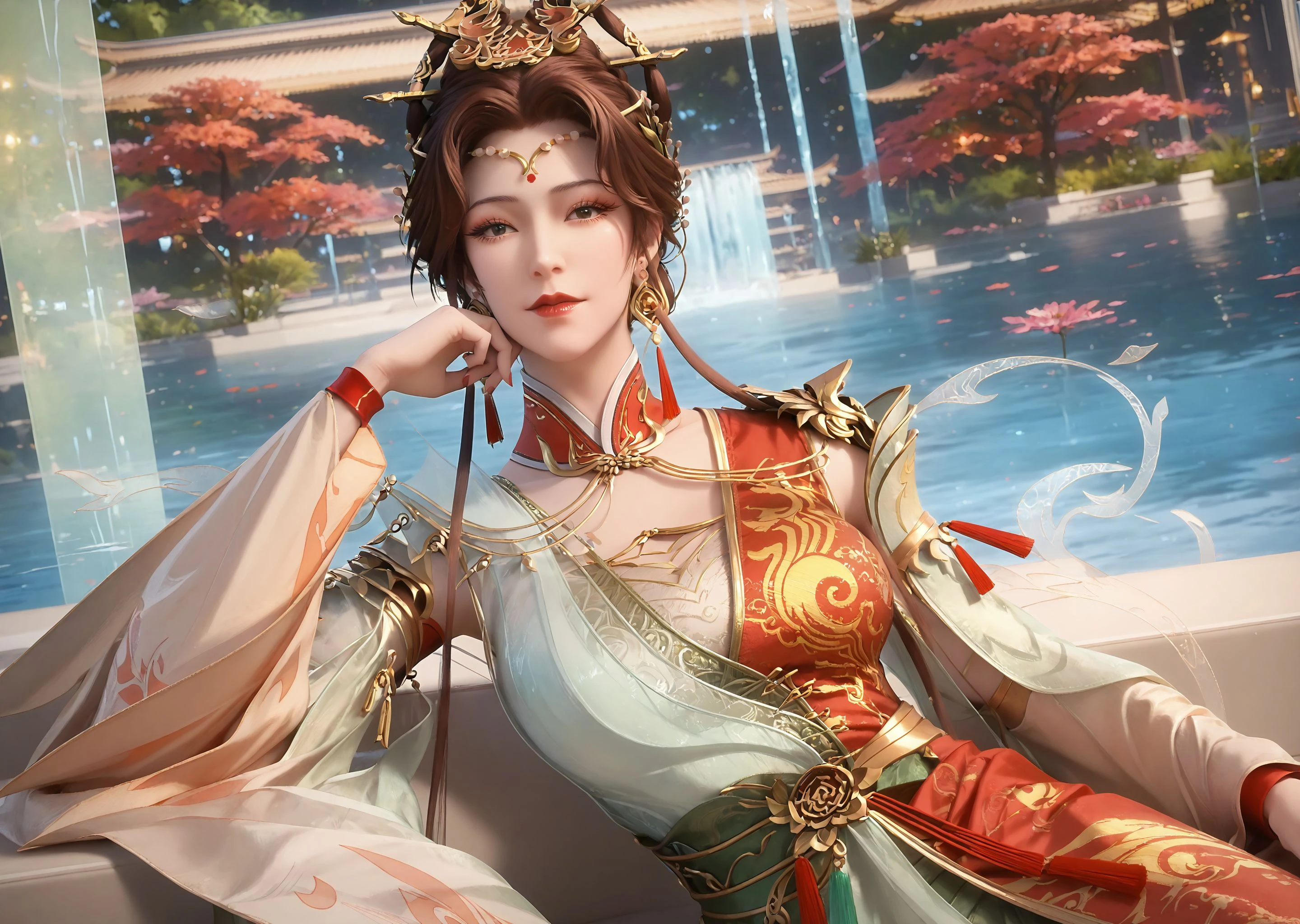 1girl, solo, jewelry, earrings, dress, hair ornament, chinese clothes, brown hair, red dress, green dress, multicolored dress, hair bun