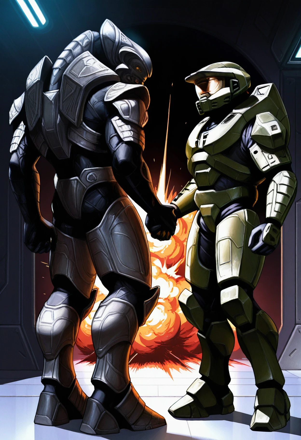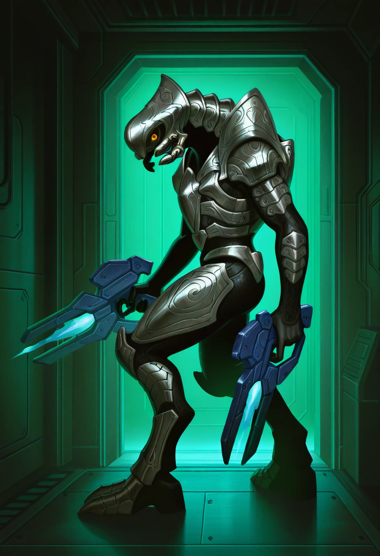 arbiter, mandibles, helmet, grey armor, shoulder armor, black skin, 4 fingers, orange eyes