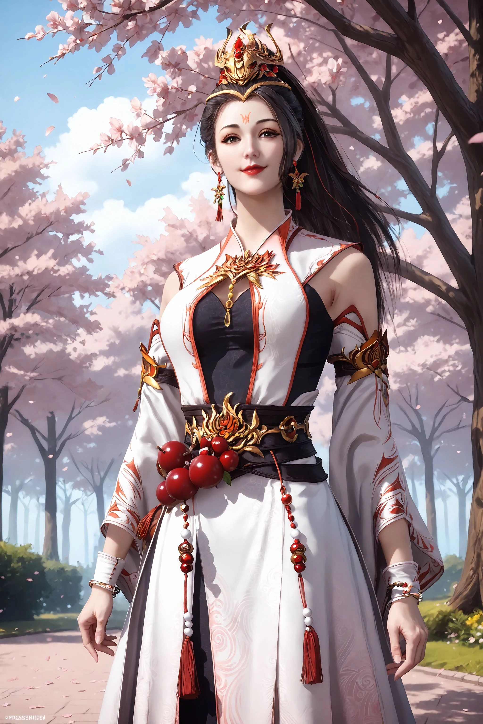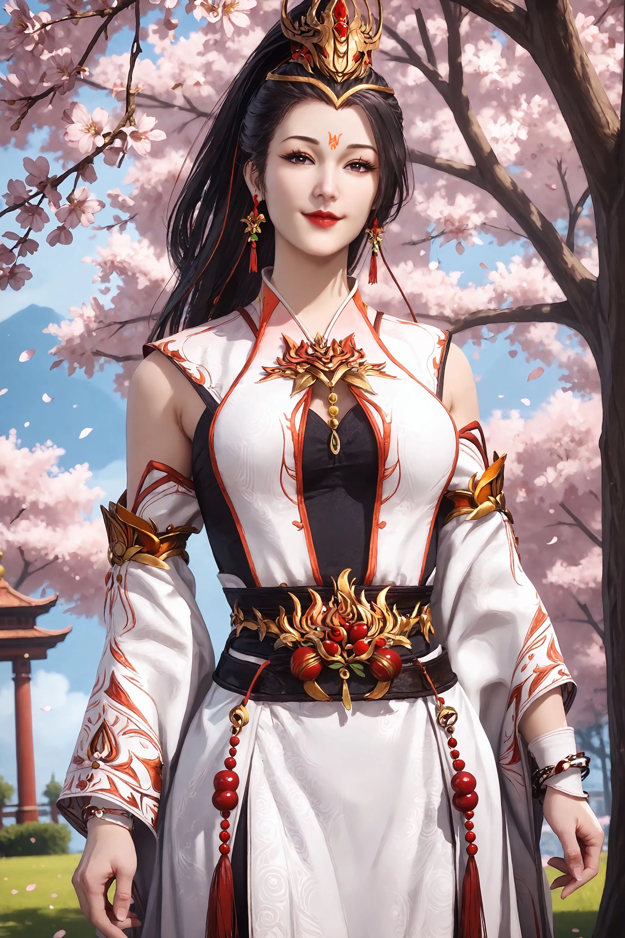 1girl, solo, jewelry, earrings, black hair, detached sleeves, bracelet, long hair, ponytail, dress, white dress, realistic, forehead mark