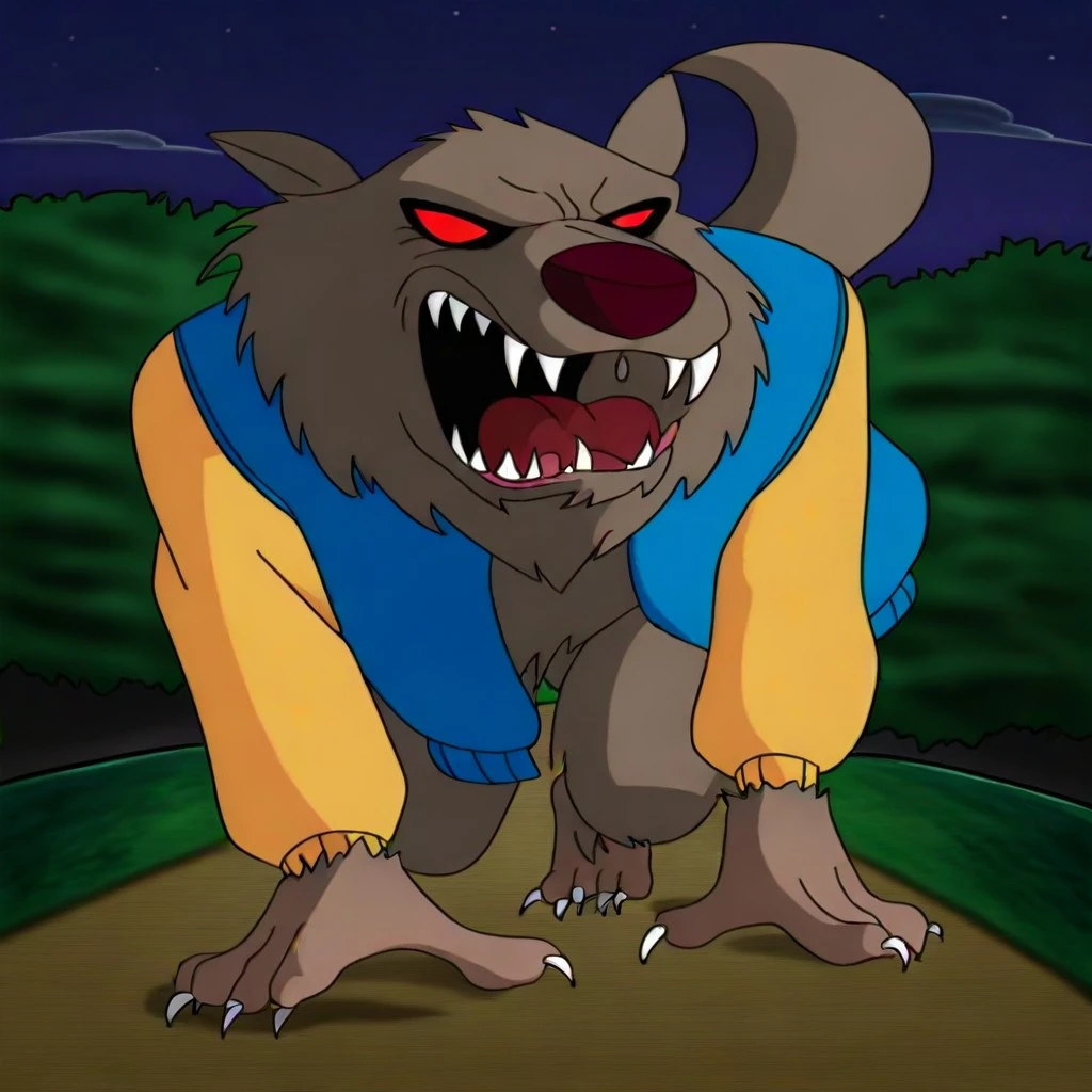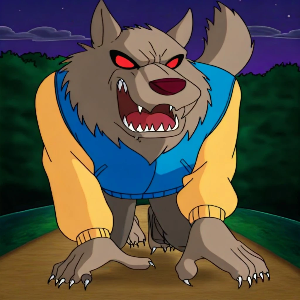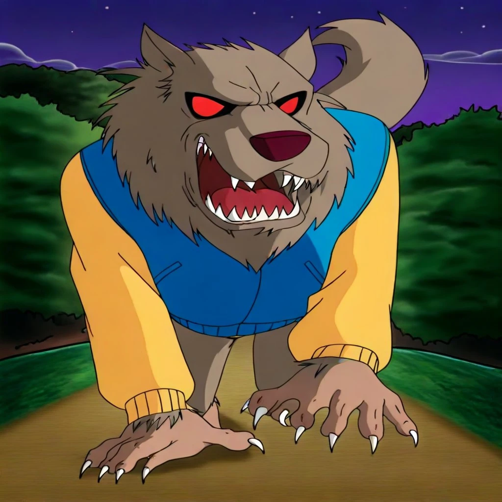 WW-AWM, grey brown fur, brown nose, red eyes, no pupils, sharp teeth, claws