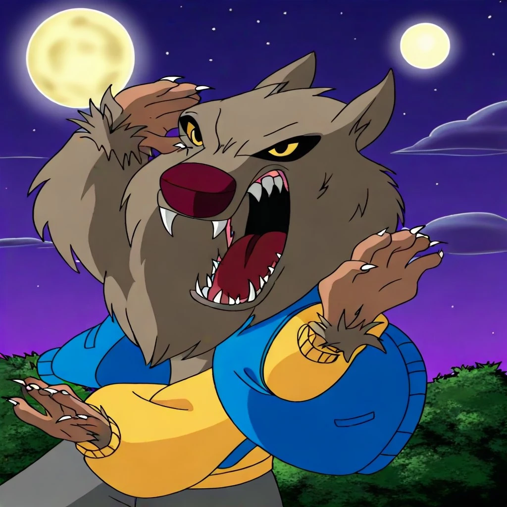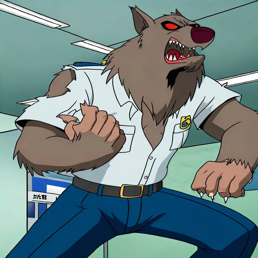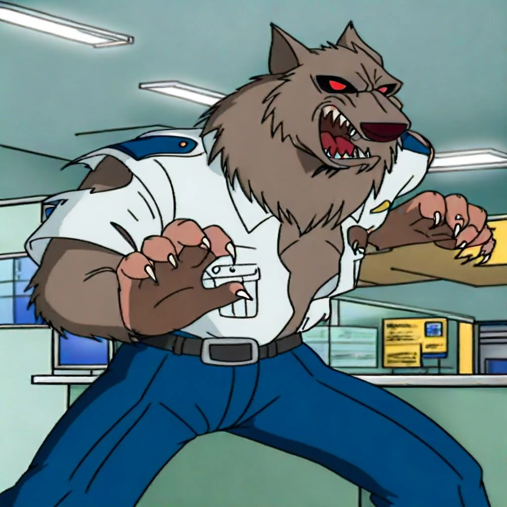 WW-AWM, grey brown fur, brown nose, red eyes, no pupils, sharp teeth, claws