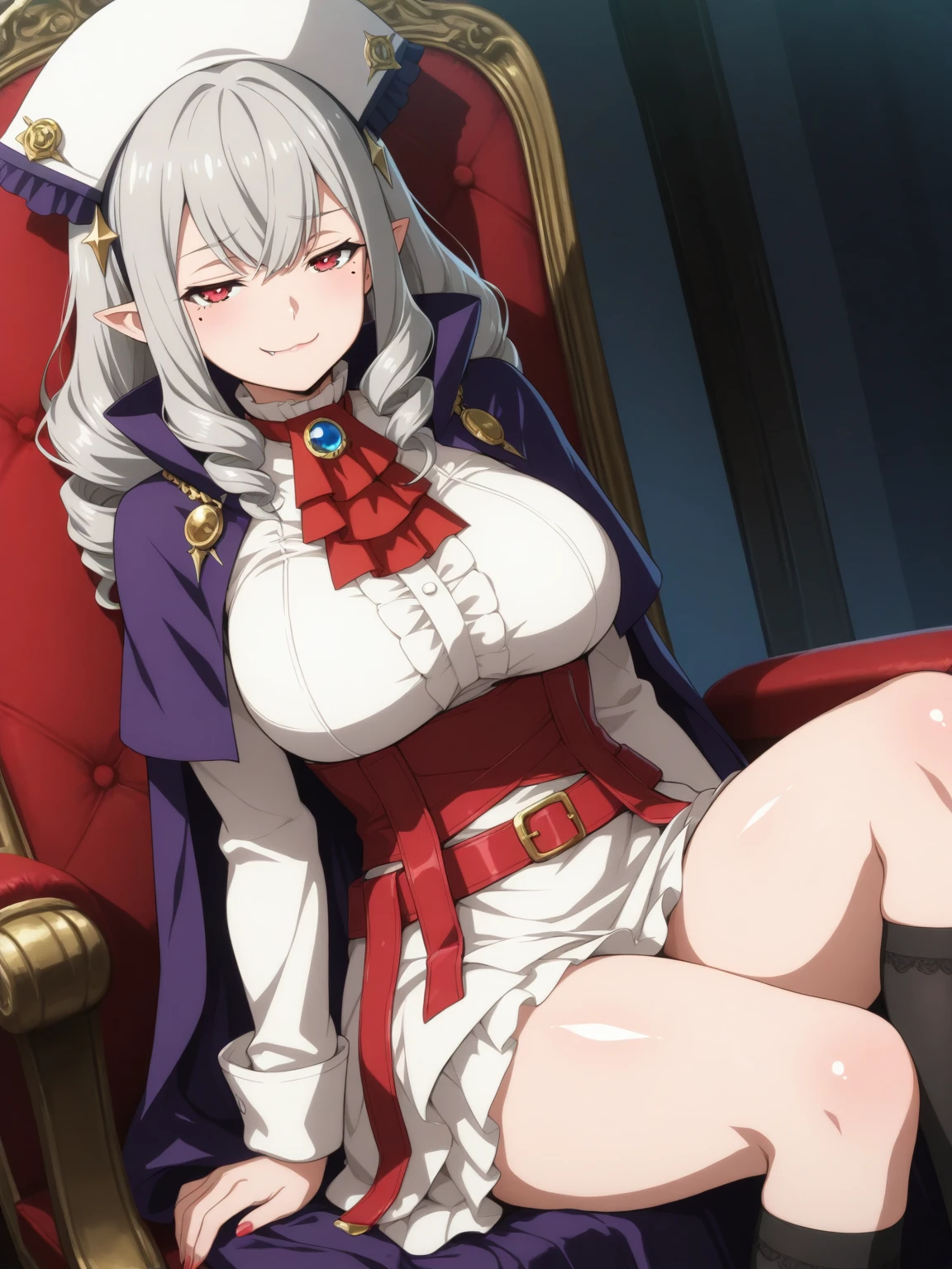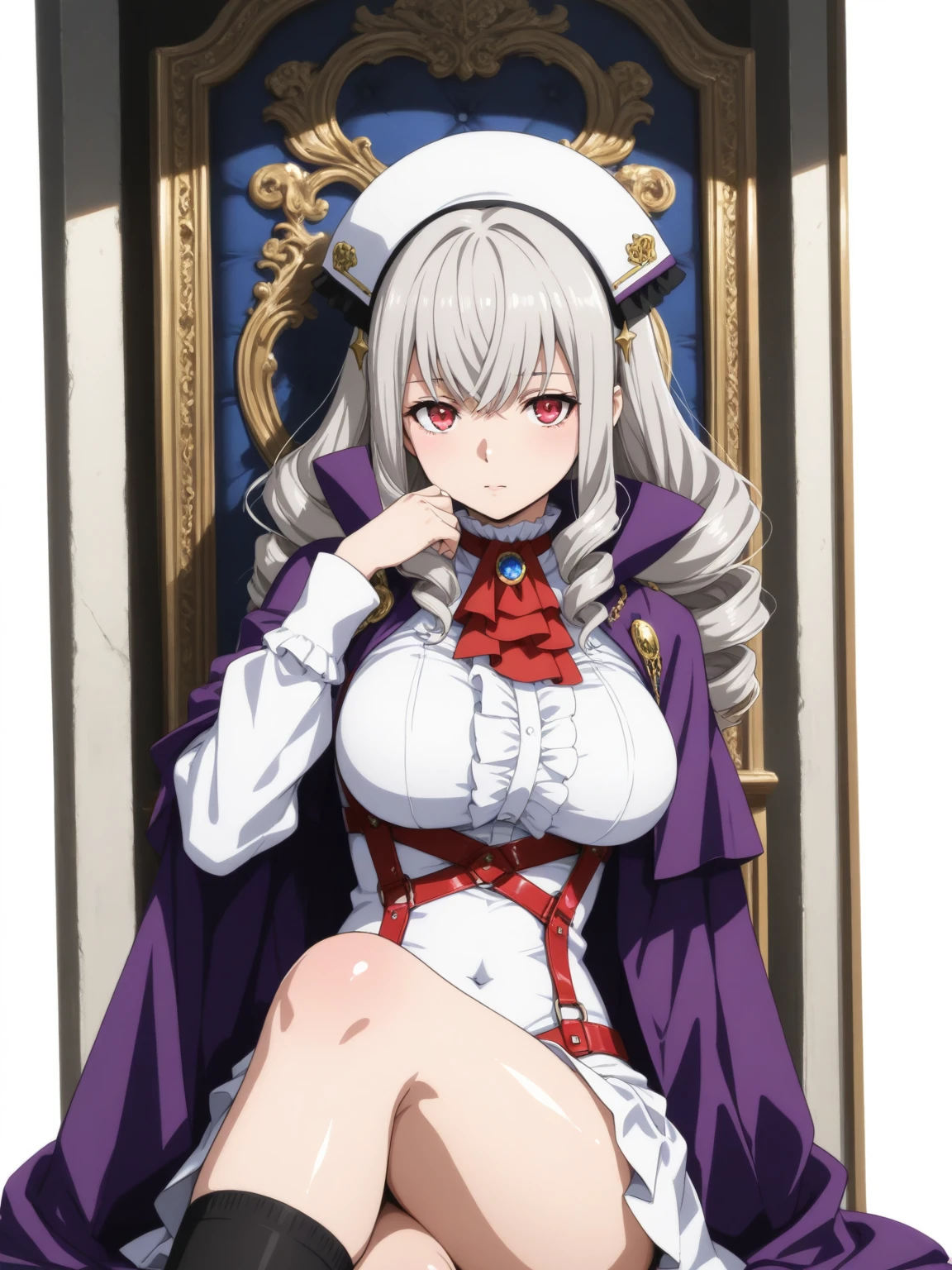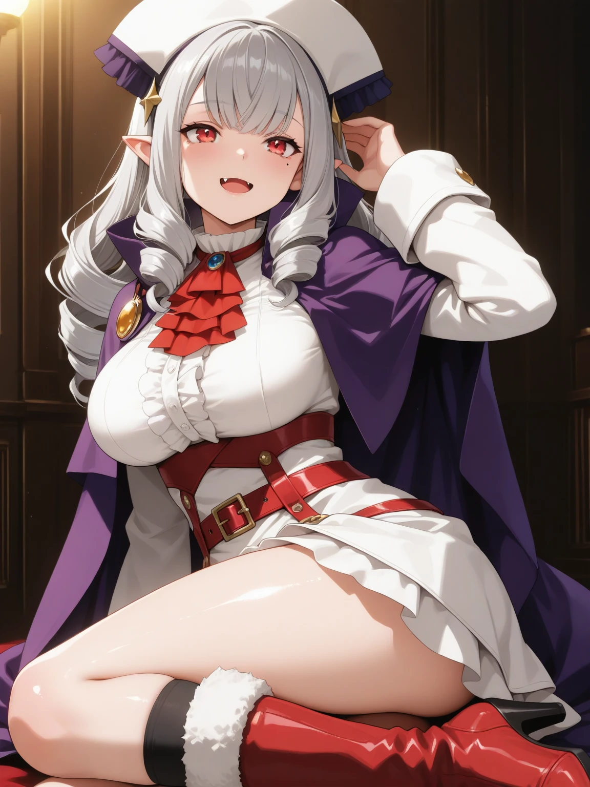 Clothes: (cape, (white hat, purple trim), dress, red belt, white miniskirt, ascot, bare thighs, black knee socks, red boots, ankle boots, fur-trimmed boots)