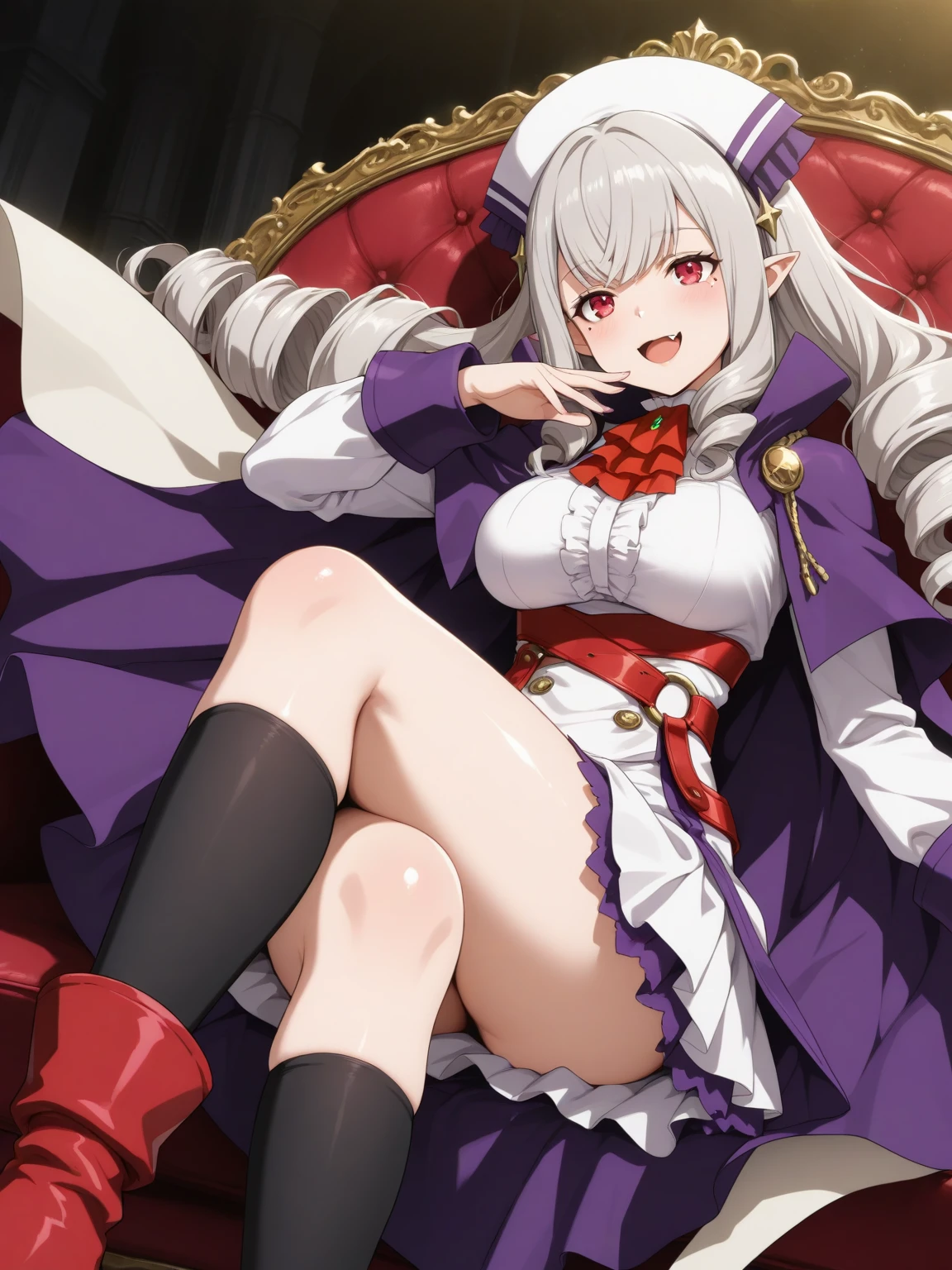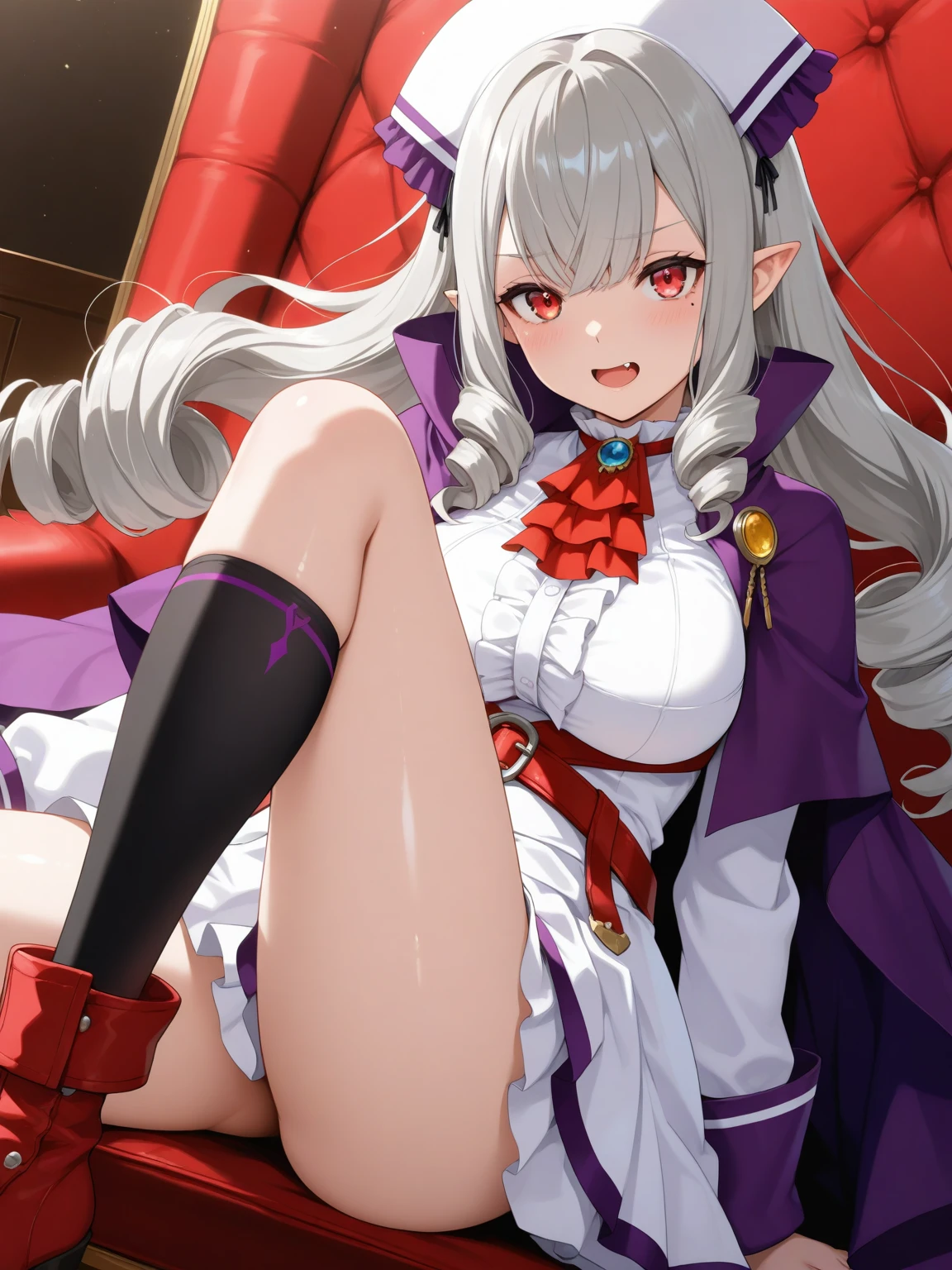 Character: (SophiaSpider, pointy ears, red eyes, gray hair, drill hair, mole under eye, fang),