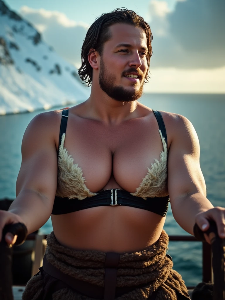 "((best quality)), ((masterpiece)), ((ultra-realistic skin texture)), 8k, highly detailed. A young man with large, round breasts sitting in the driver’s seat of a truck on a sunny day. He is wearing a bikini top that reveals his feminine chest, while the rest of his body remains muscular and masculine. His short hair is slightly messy, and he has a masculine face with light stubble. Smiling confidently, the sunlight highlights his skin, emphasizing the contrast between his masculine frame and feminine chest."