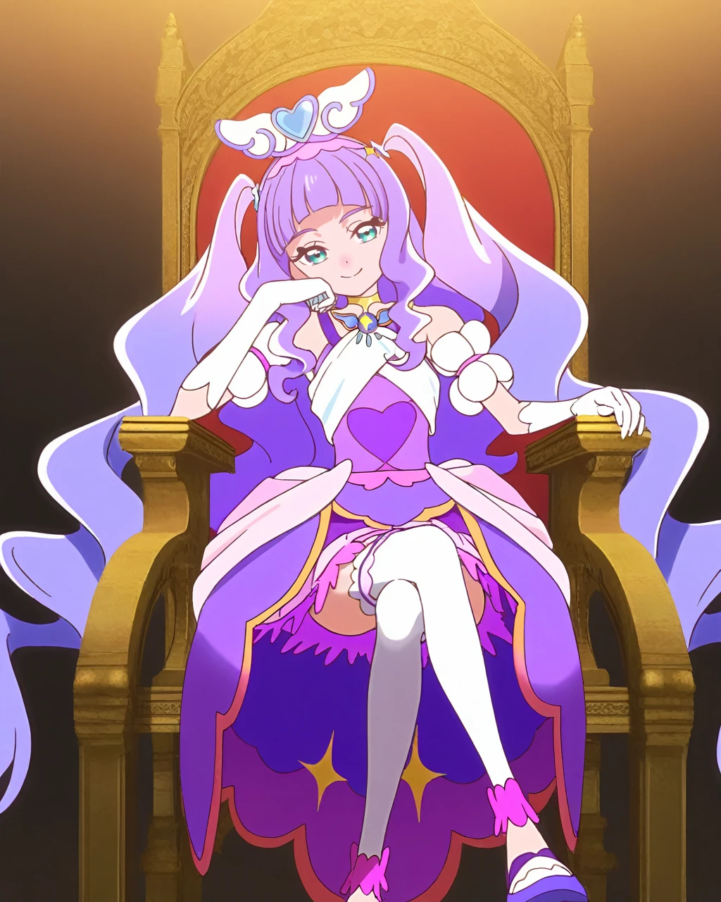 magical girl, white gloves, elbow gloves, purple dress, white thighhighs, wing brooch, wing hair ornament, brooch, jewelry, puffy sleeves, twintails, purple footwear,There are still many charming characters, but I don't think this lora can hold more information...