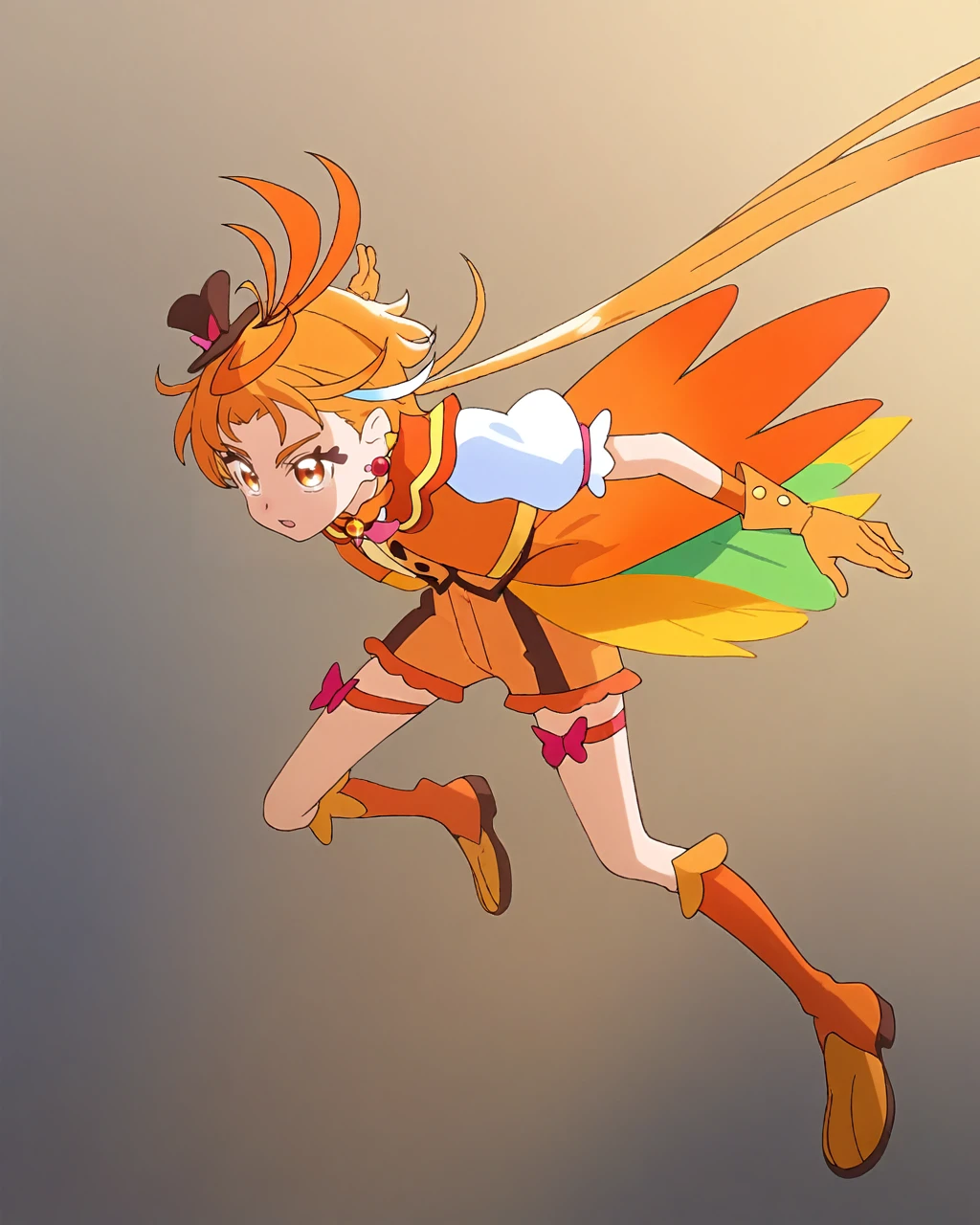 magical boy, orange gloves,orange footwear, mini hat, mini top hat, top hat, jewelry, earrings, orange shorts, hat, boots, wing brooch, puffy short sleeves,Hijiri Ageha / 聖 あげは:
