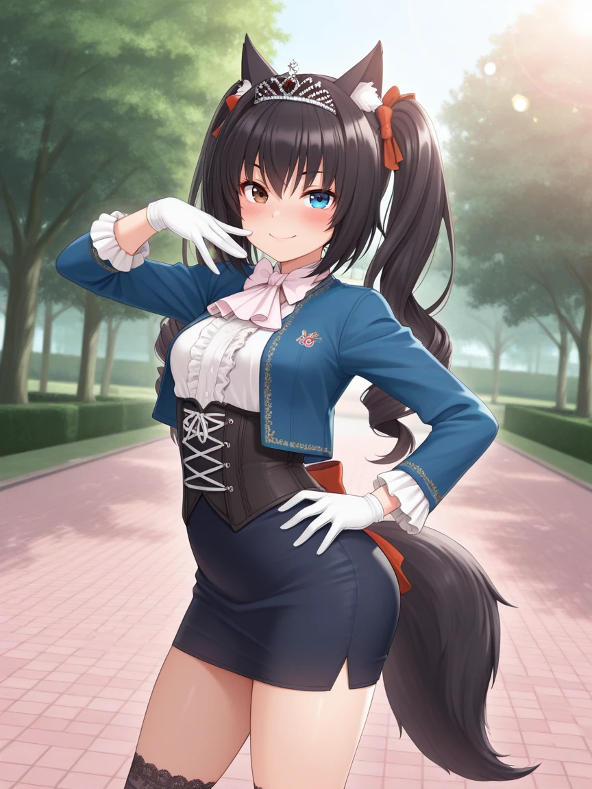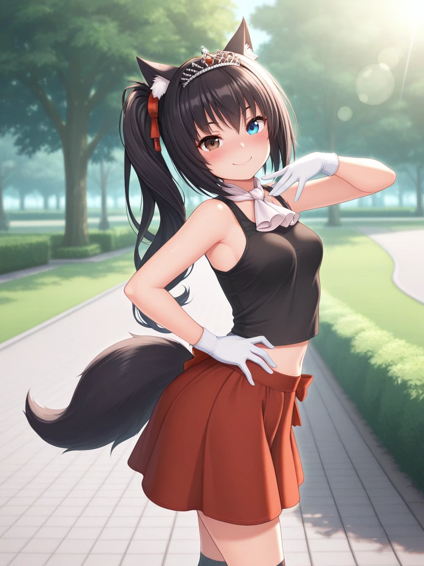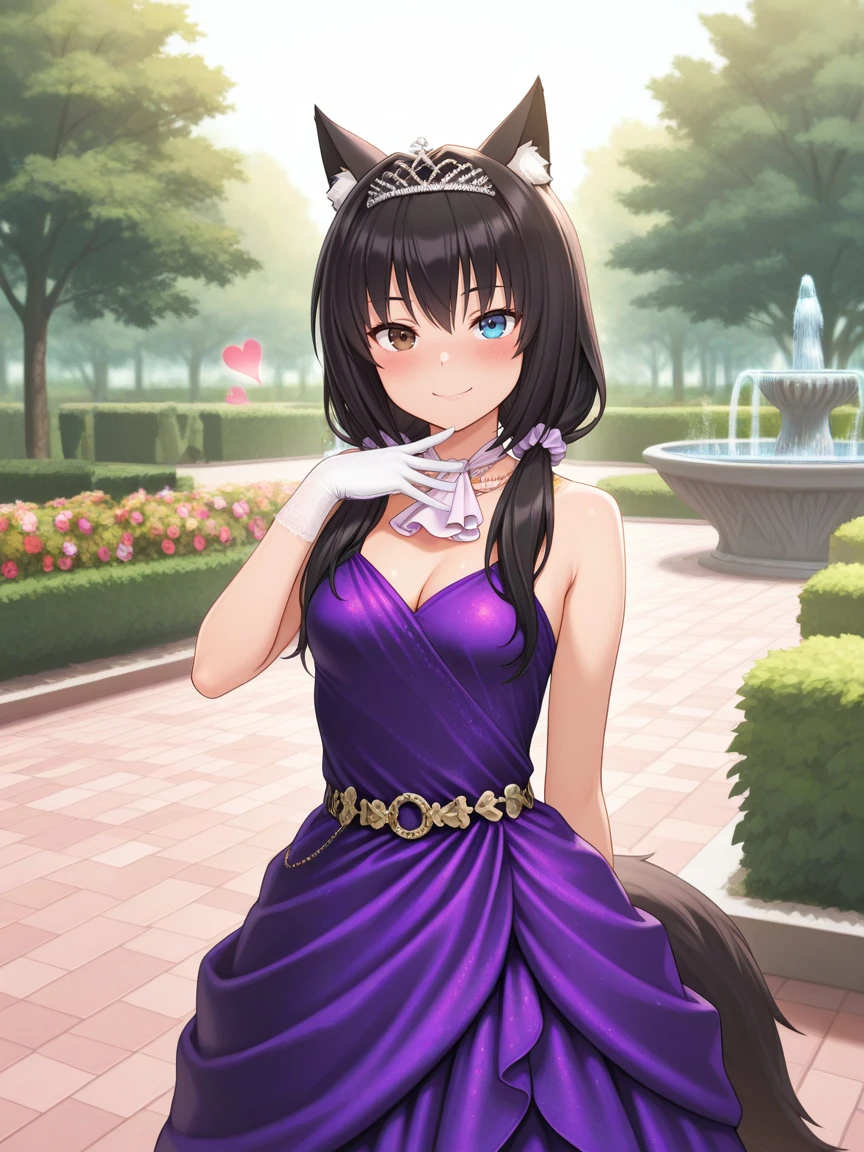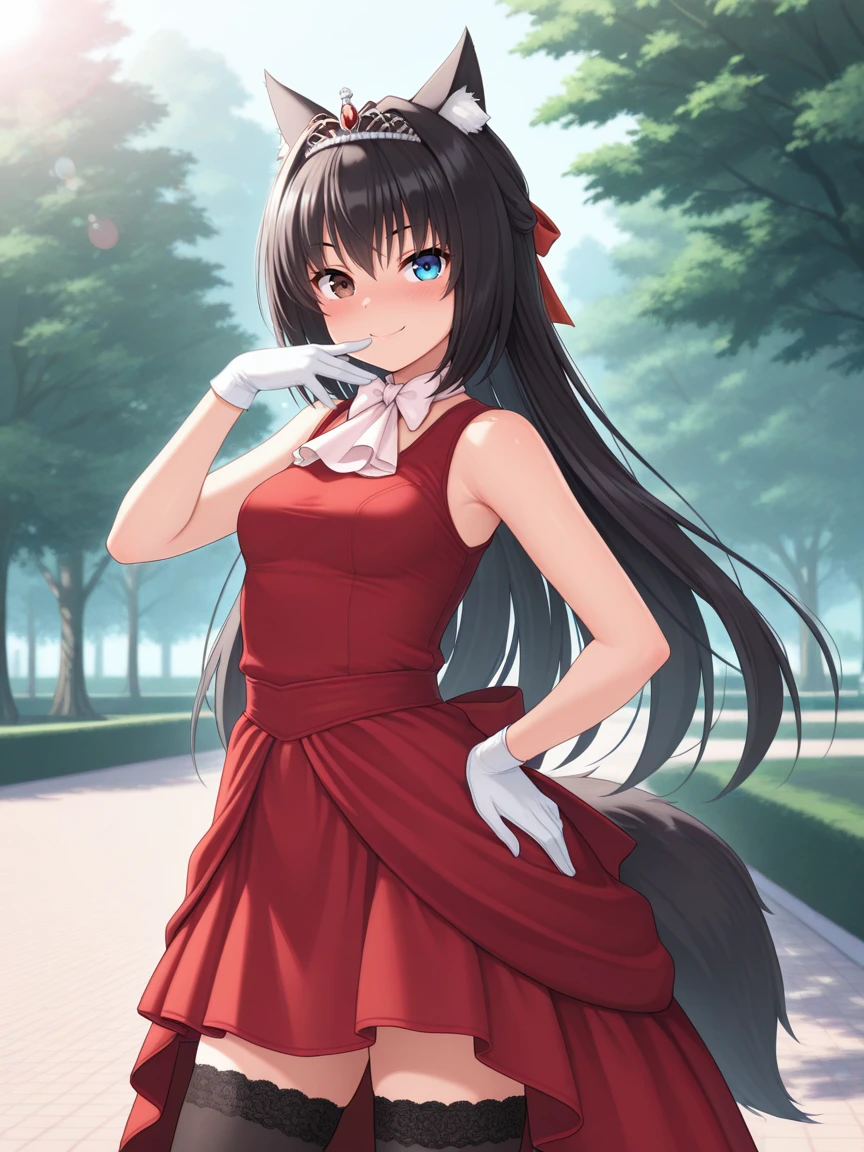 WinterIllius, Black hair, Tail, animal ears, wolf ears, heterochromia, Brown eyes, blue eyes, long hair,tiara, ascot, ribbon, Small breasts, medium breasts,red jacket, long sleeves, purple dress, belt, White gloves, pantyhose,
