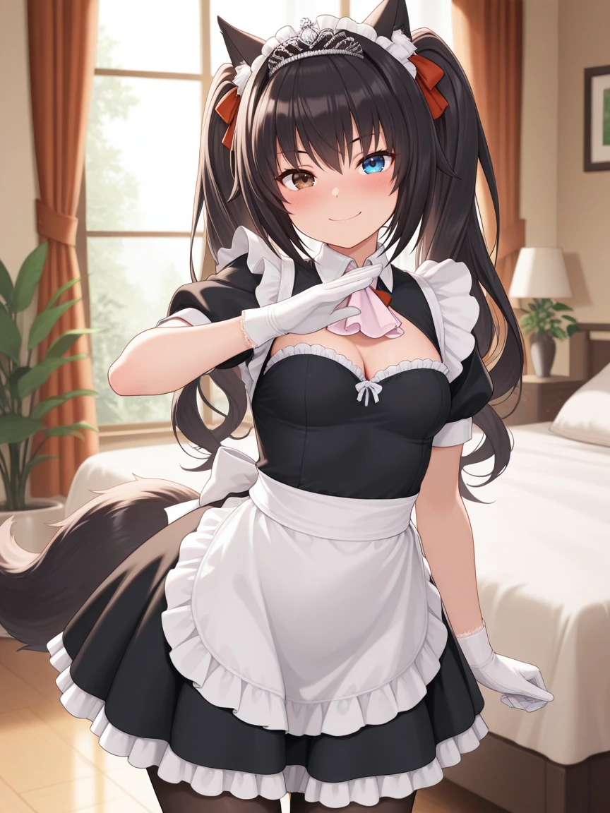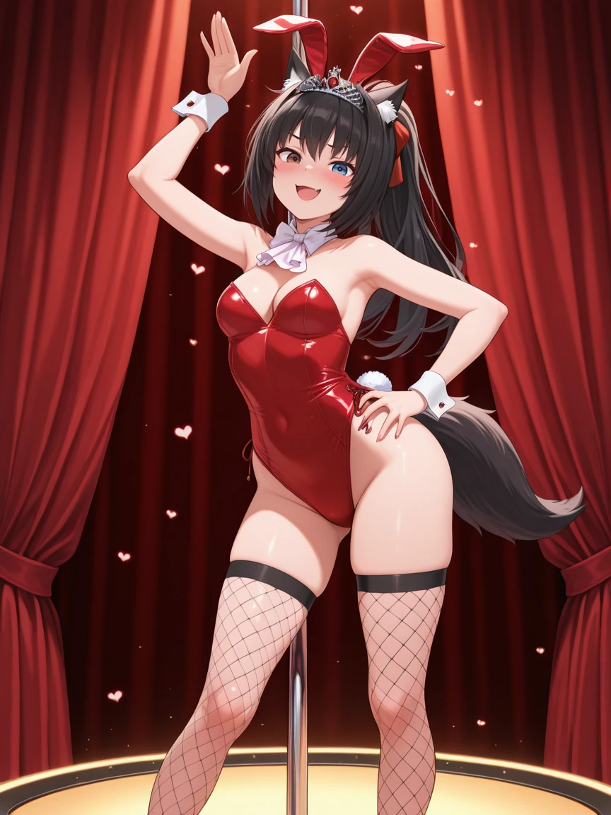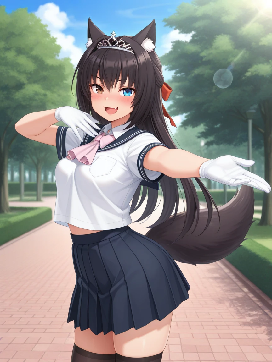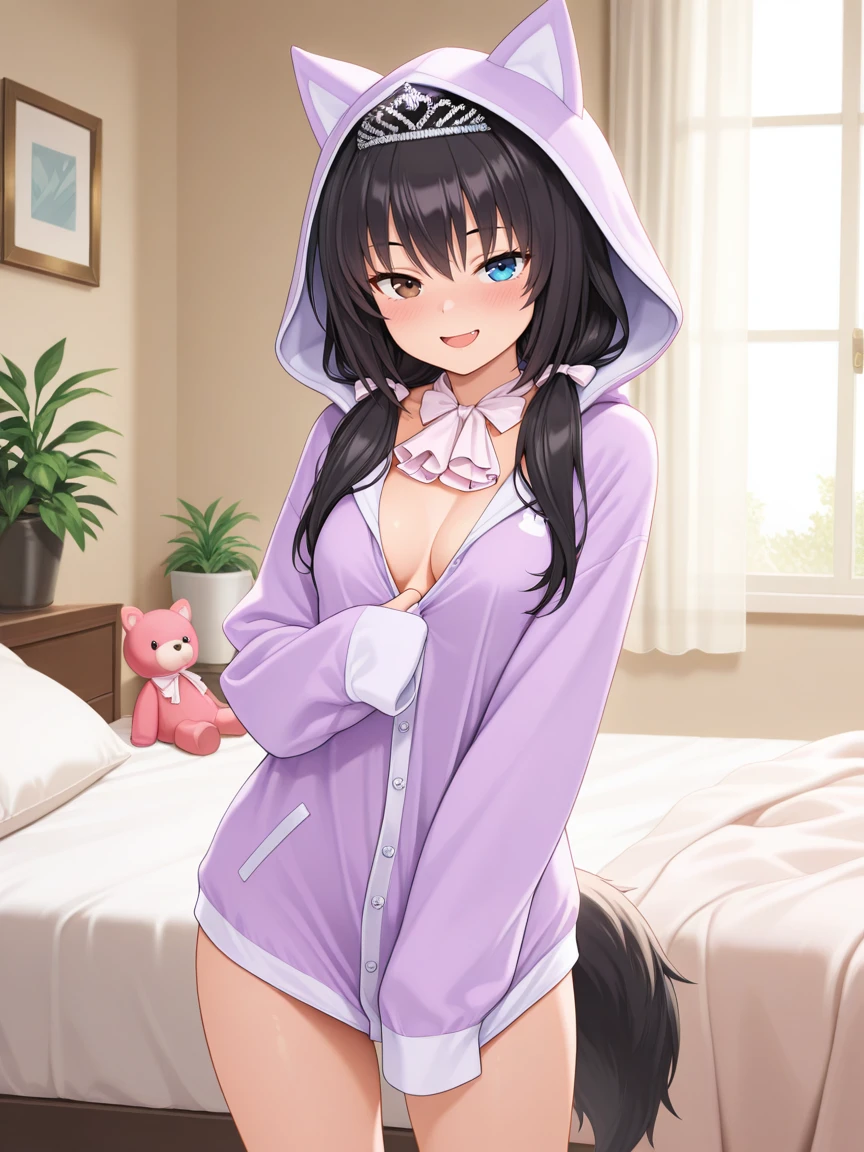 WinterIllius, Black hair, Tail, animal ears, wolf ears, heterochromia, Brown eyes, blue eyes, long hair,tiara, ascot, ribbon, Small breasts, medium breasts,red jacket, long sleeves, purple dress, belt, White gloves, pantyhose,