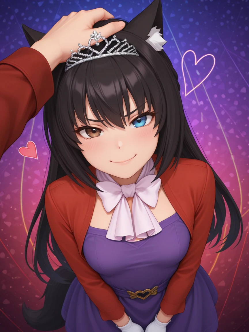WinterIllius, Black hair, Tail, animal ears, wolf ears, heterochromia, Brown eyes, blue eyes, long hair,tiara, ascot, ribbon, Small breasts, medium breasts,red jacket, long sleeves, purple dress, belt, White gloves, pantyhose, Fantasy outfit prompt