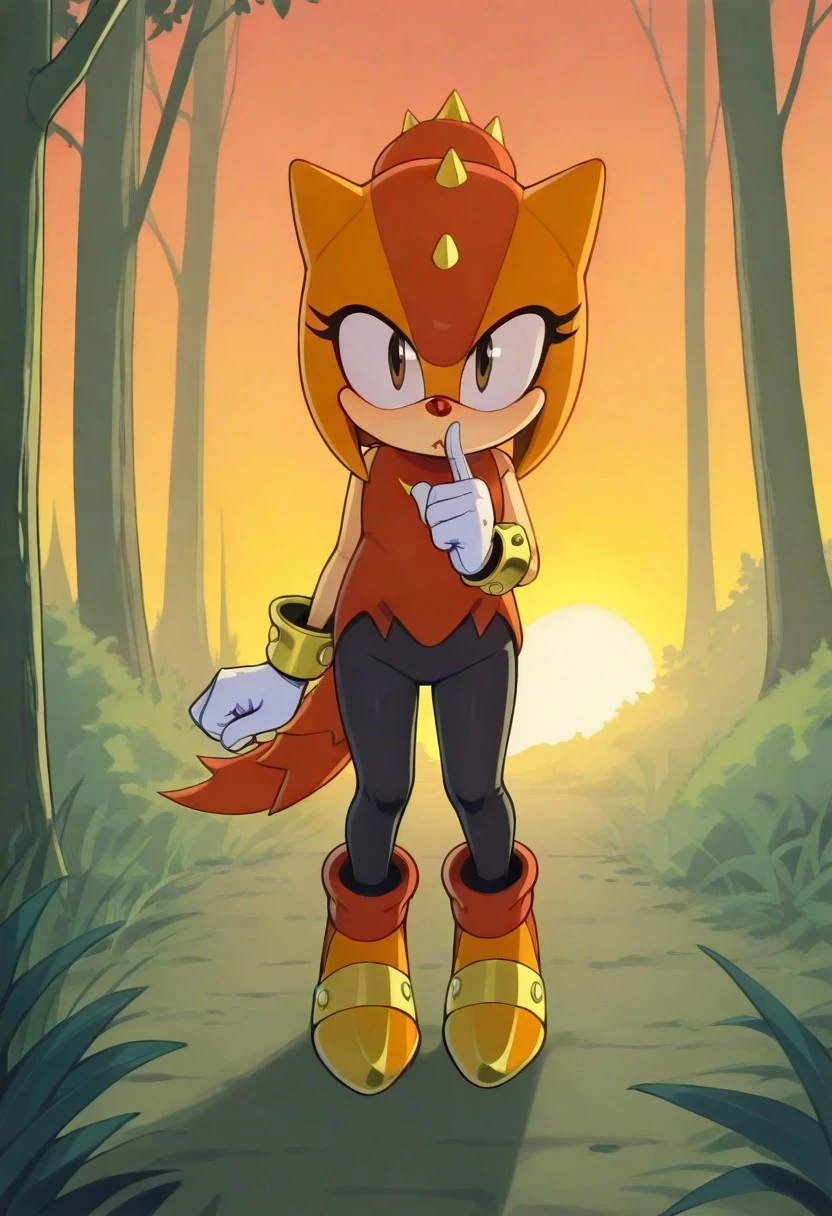 Trip the Sungazer, orange skin, peach muzzle, brown eyes, yellow spiky horns on top of head, red nose, red and orange tail, white gloves, red and yellow dress, black pants, orange shoes