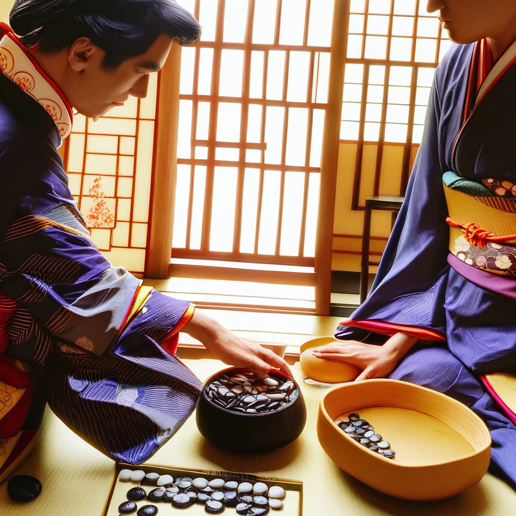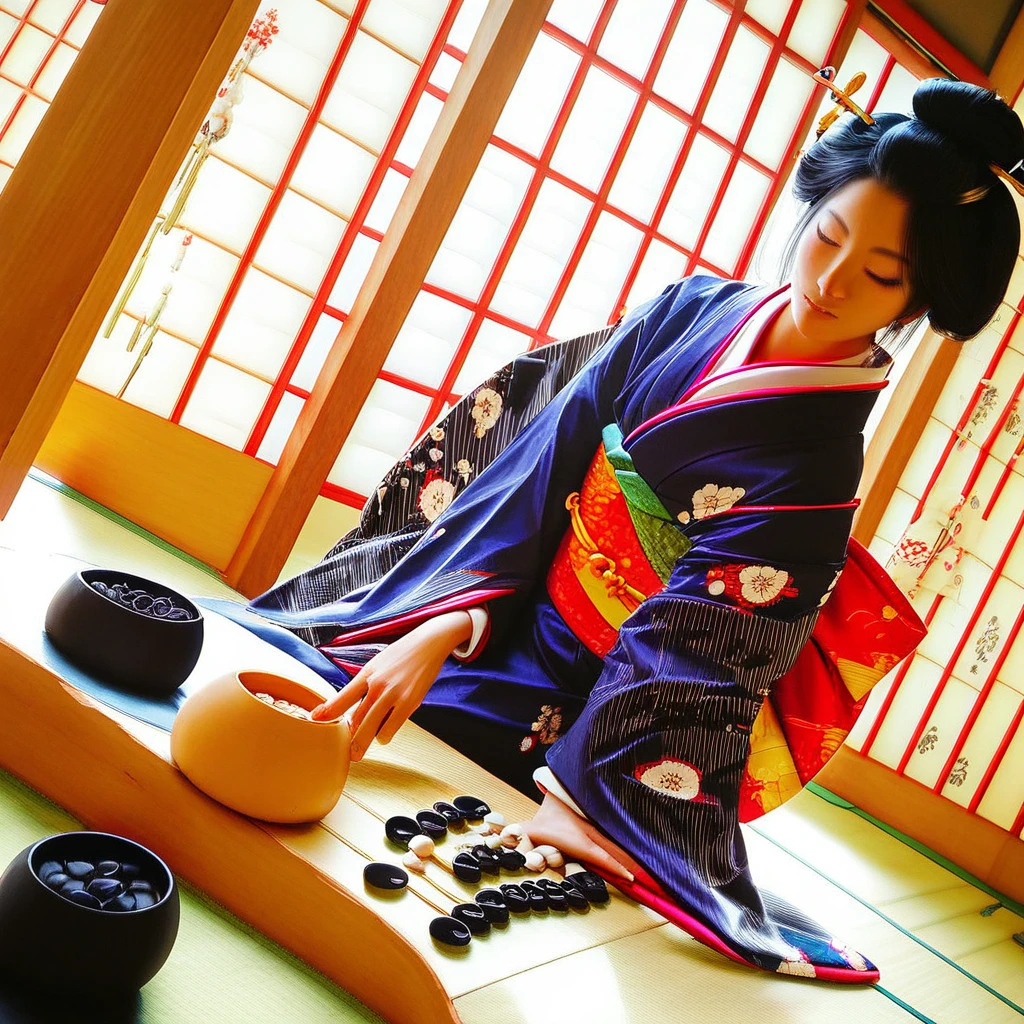 goban, go bowl, go stones, japanese interior, kimono, holding go stone,
