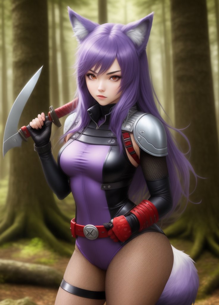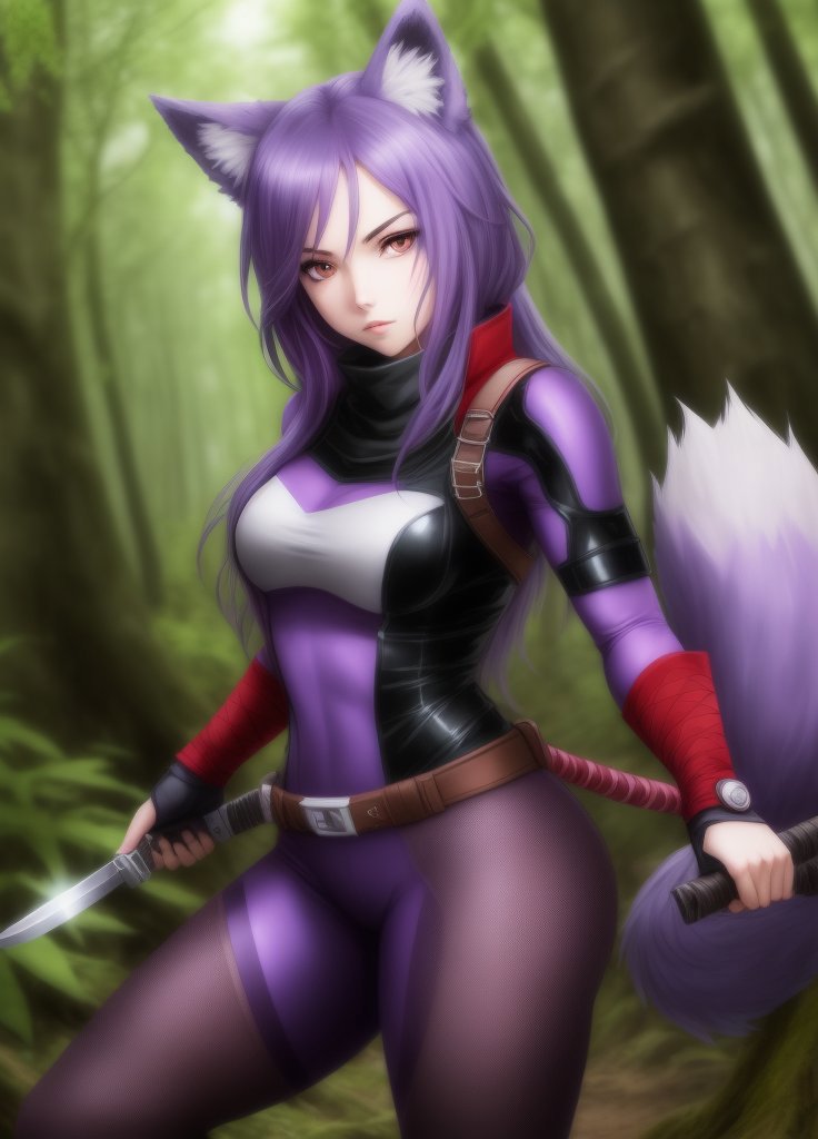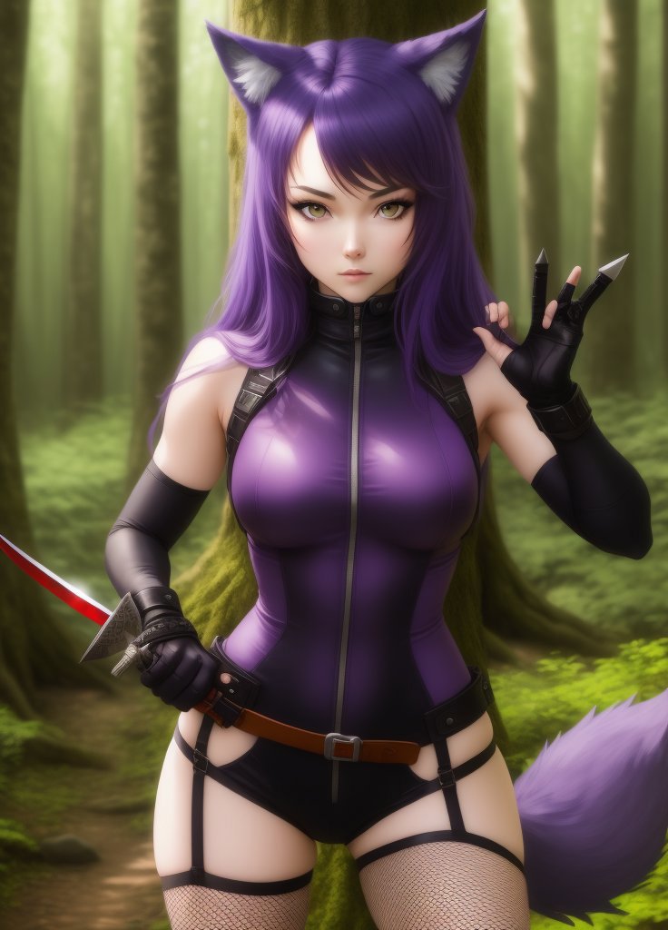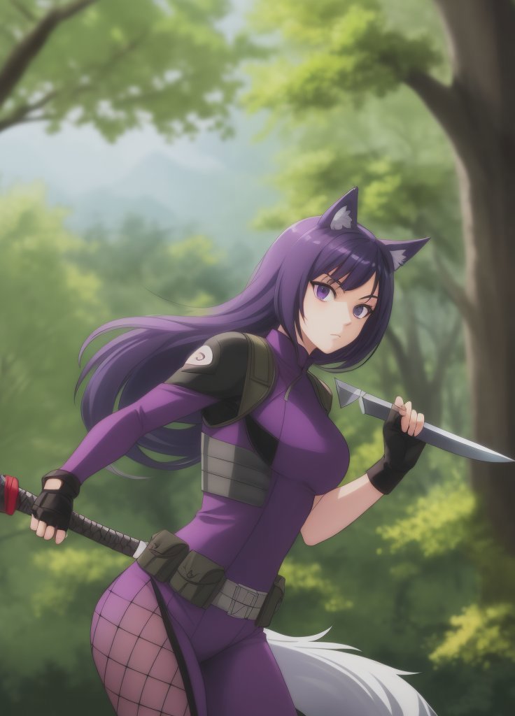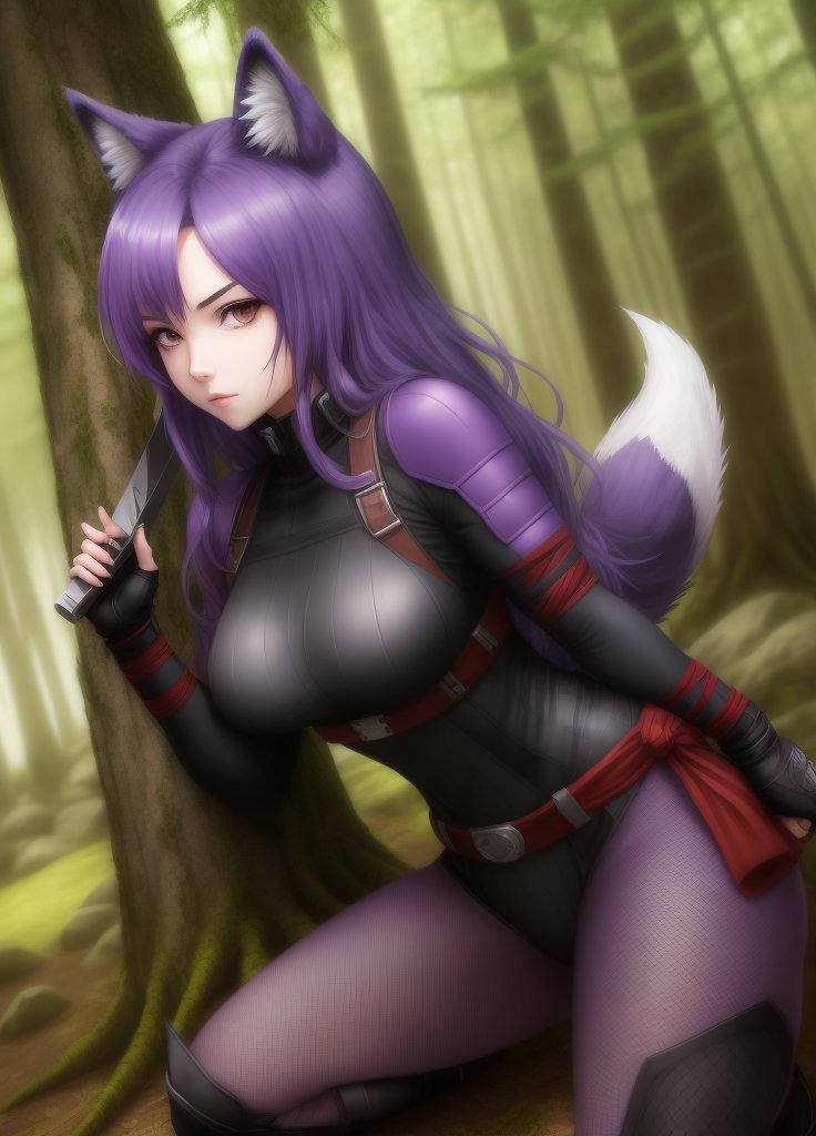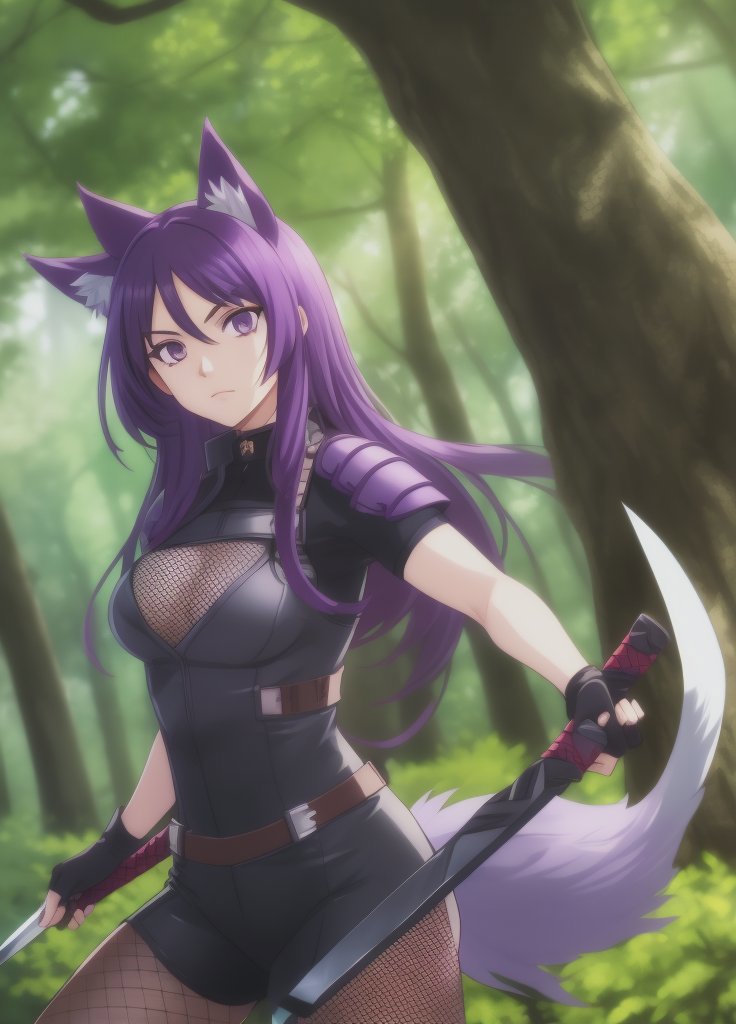 Kuroinu, 1girl, animal ears, violett eyes, violett hair, blurry, violett bodysuit, fingerless gloves, fishnets, forest, gloves, holding, holding weapon, kunai, long hair, nature, ninja, outdoors, parody, solo focus, tail, tree, weapon, wolf ears, wolf tail,