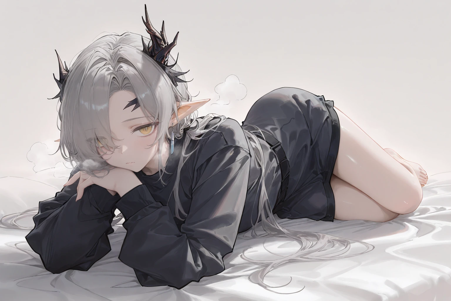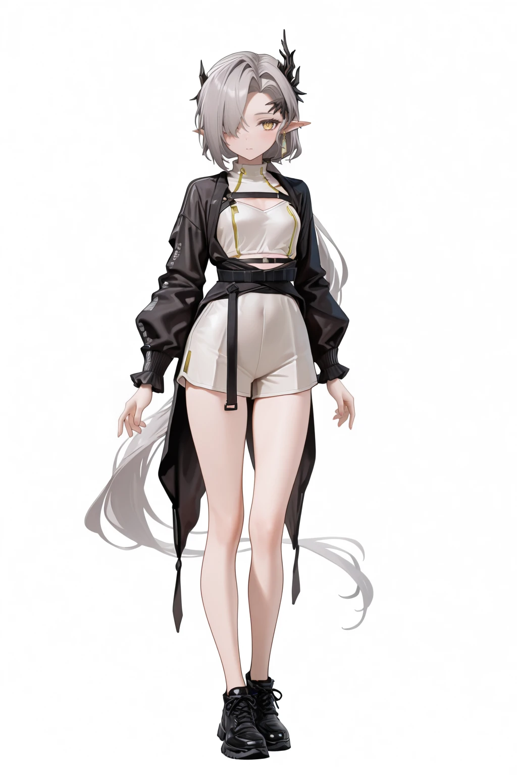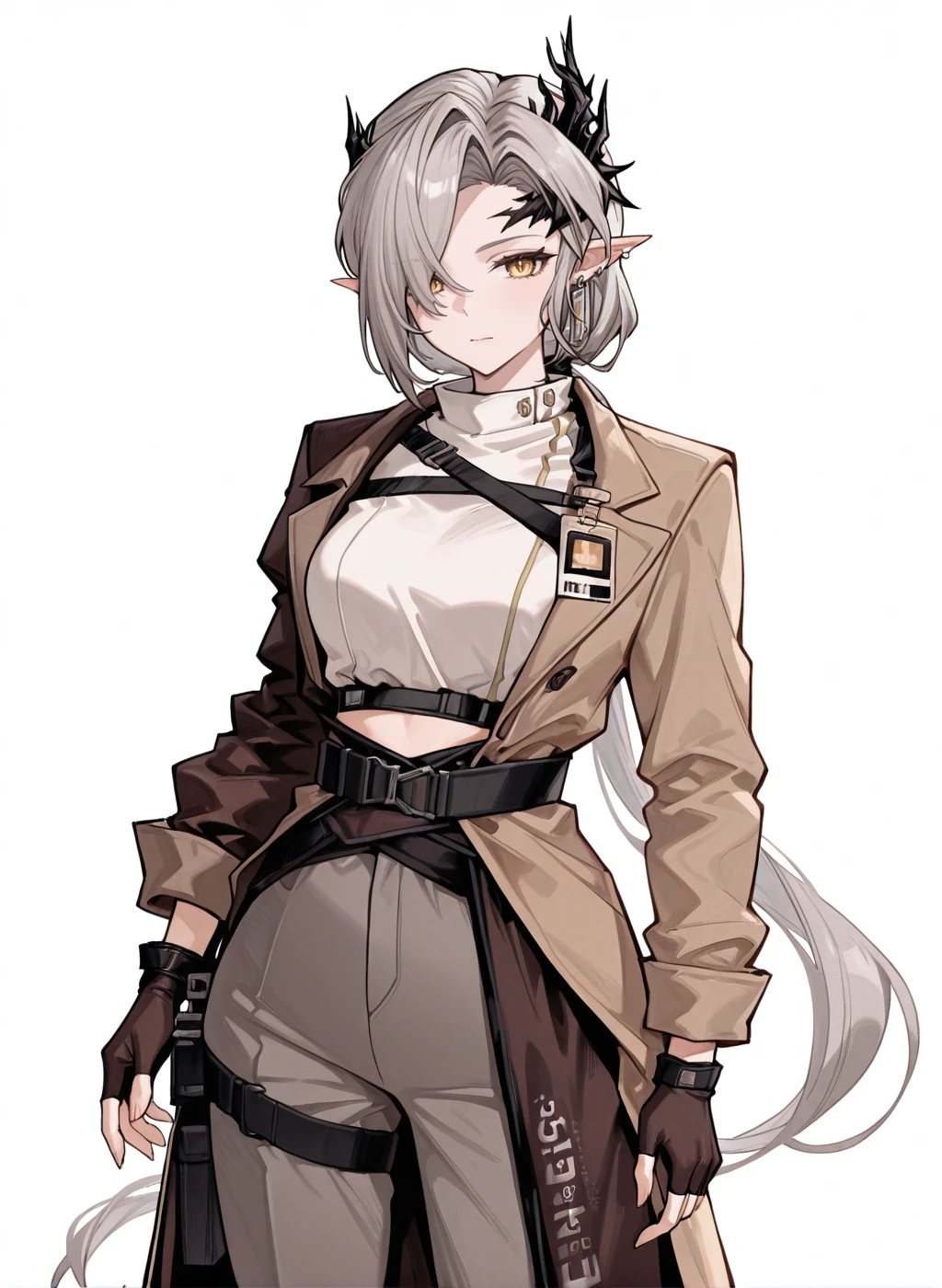 nasti_lunorey,horns,grey hair,curtained hair,hair over one eye,low ponytail,yellow eyes,pointy ears,earrings,collared shirt,white shirt,id card,brown coat,,fingerless gloves,belt,high-waist pants,