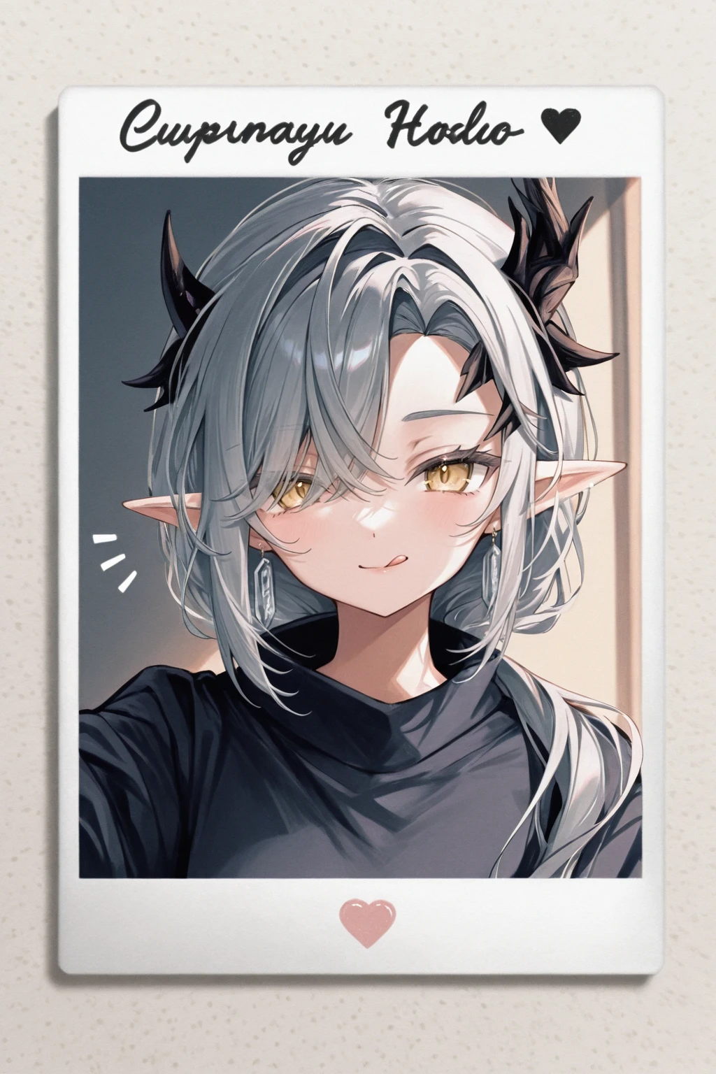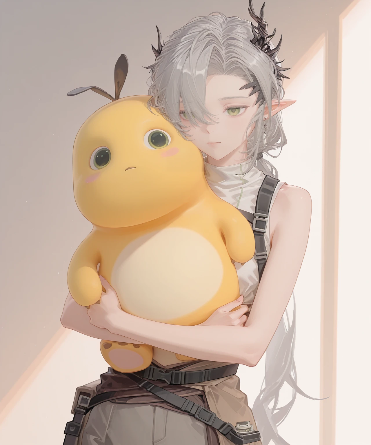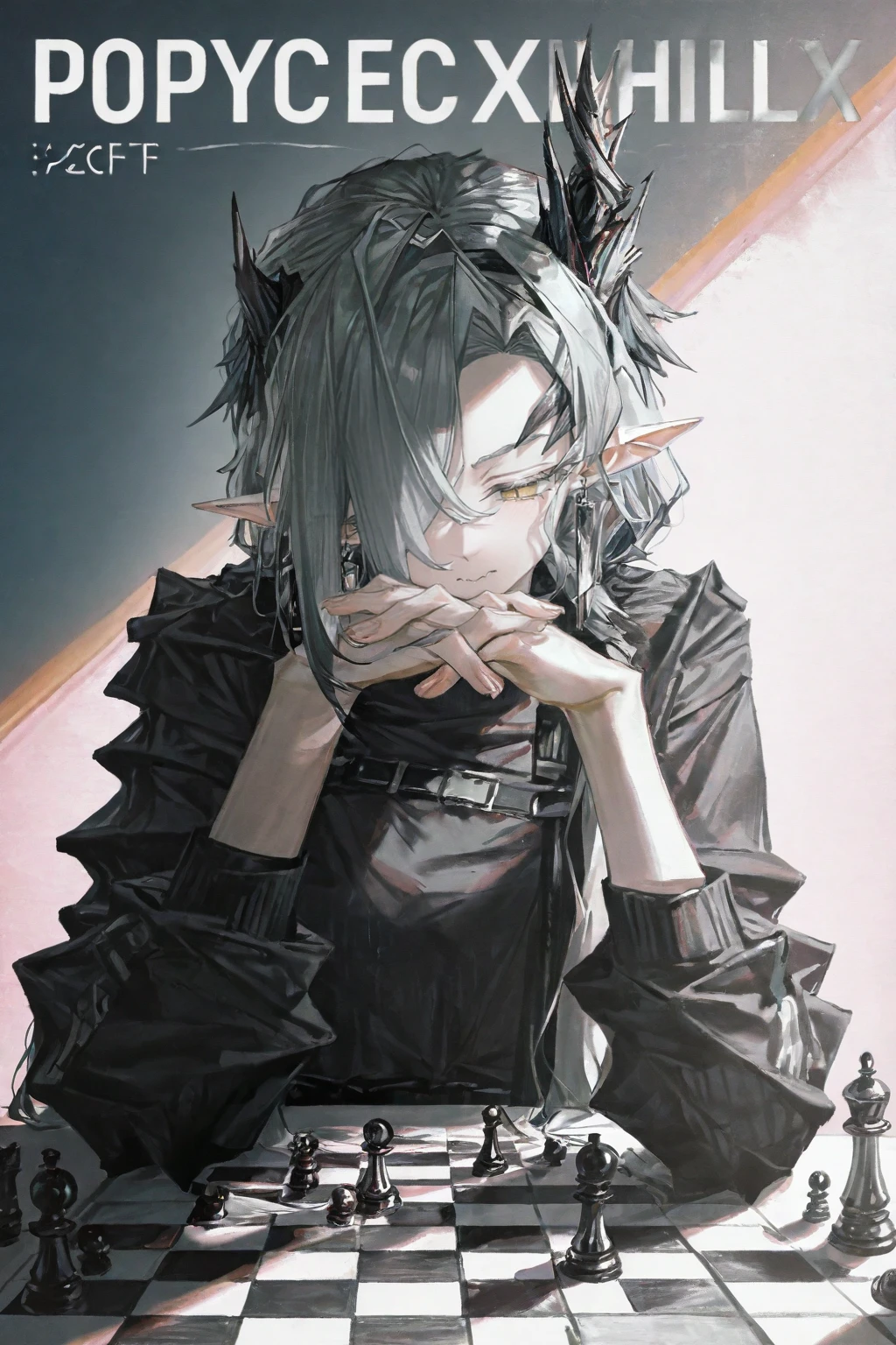 nasti_lunorey,horns,grey hair,curtained hair,hair over one eye,low ponytail,yellow eyes,pointy ears,earrings,collared shirt,white shirt,id card,brown coat,,fingerless gloves,belt,high-waist pants,