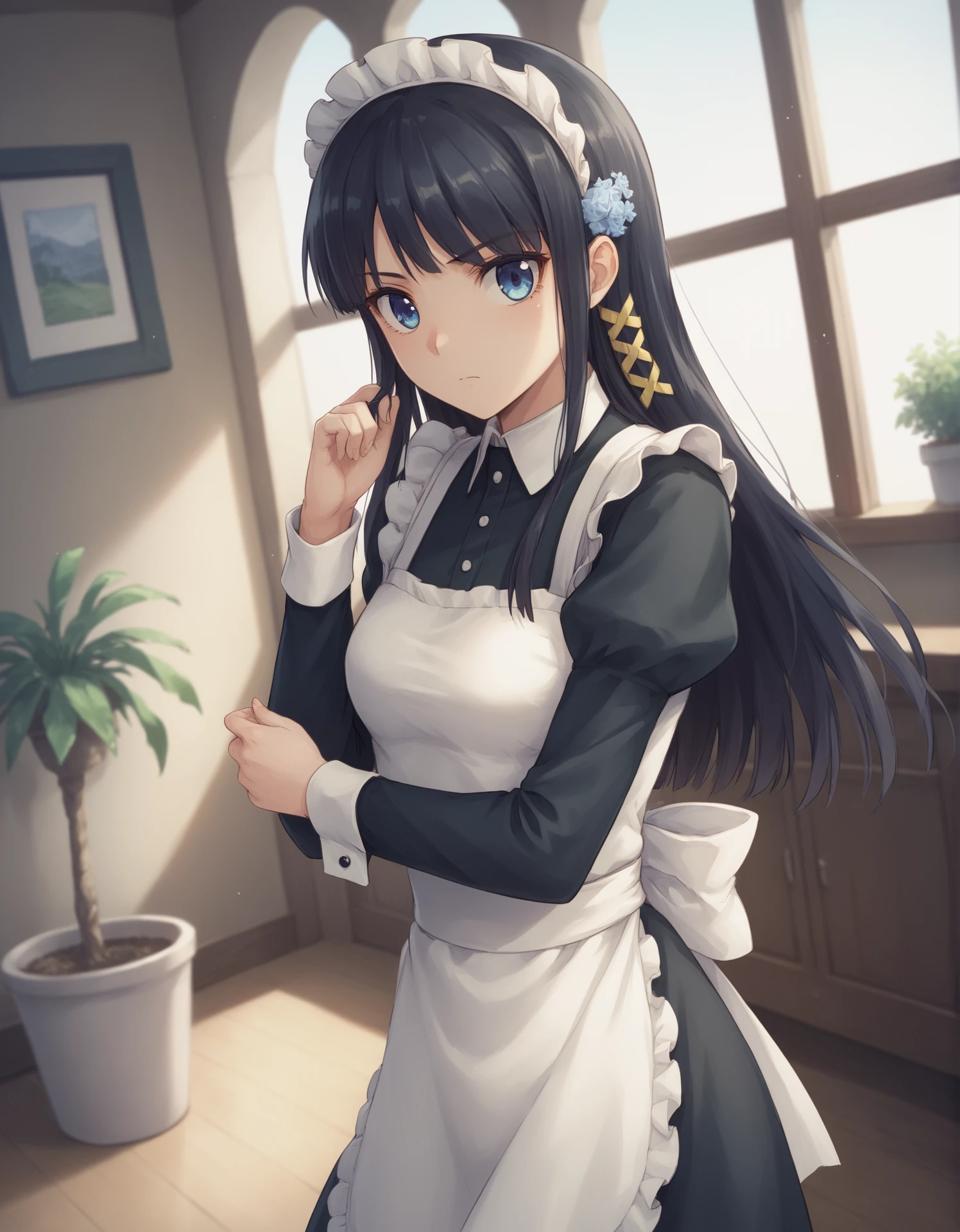 shiba miyuki, black hair, blue eyes, long hair, hair ornament, blunt bangs