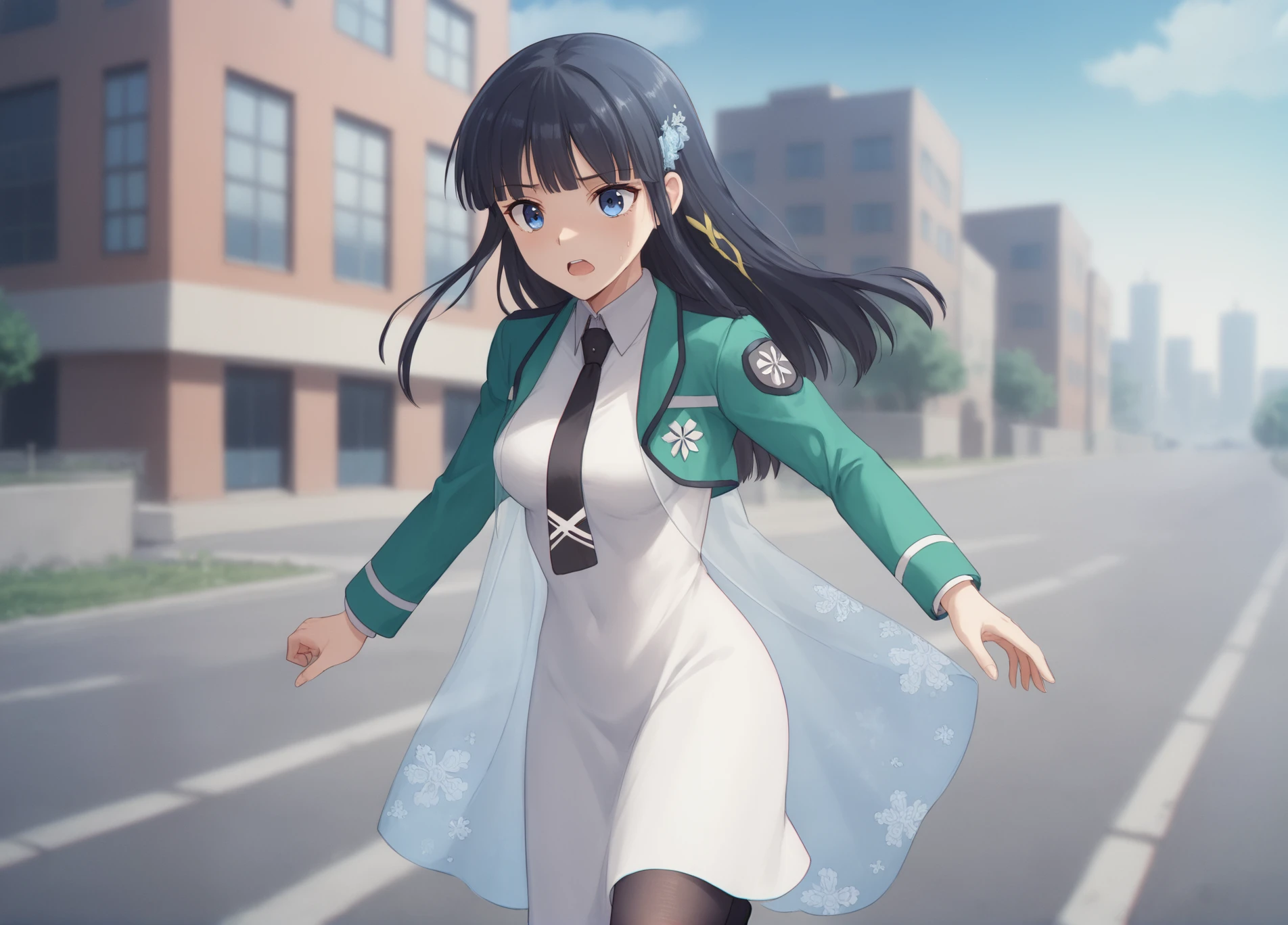 first high school uniform, white dress, black necktie, city, black pantyhose, see-through dress