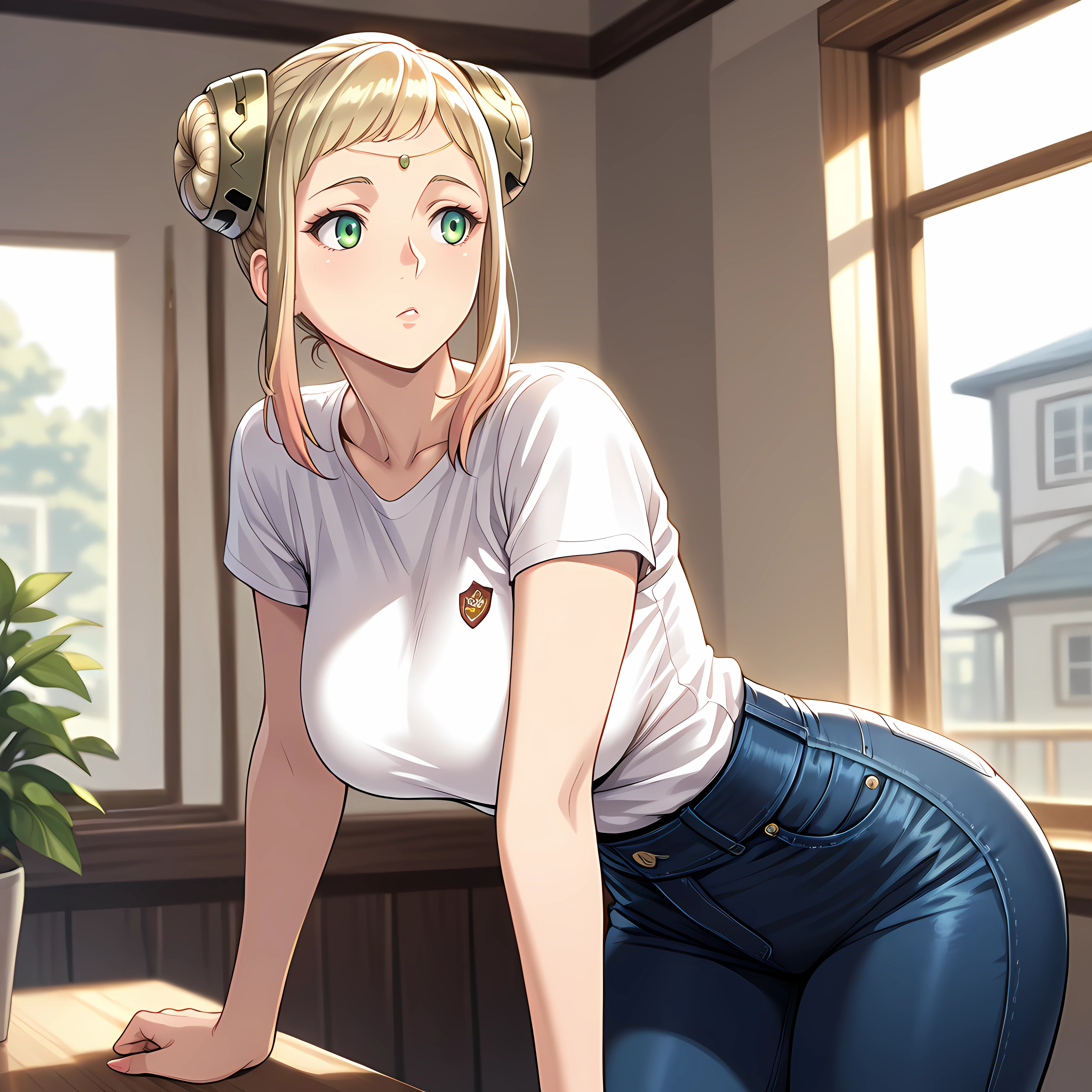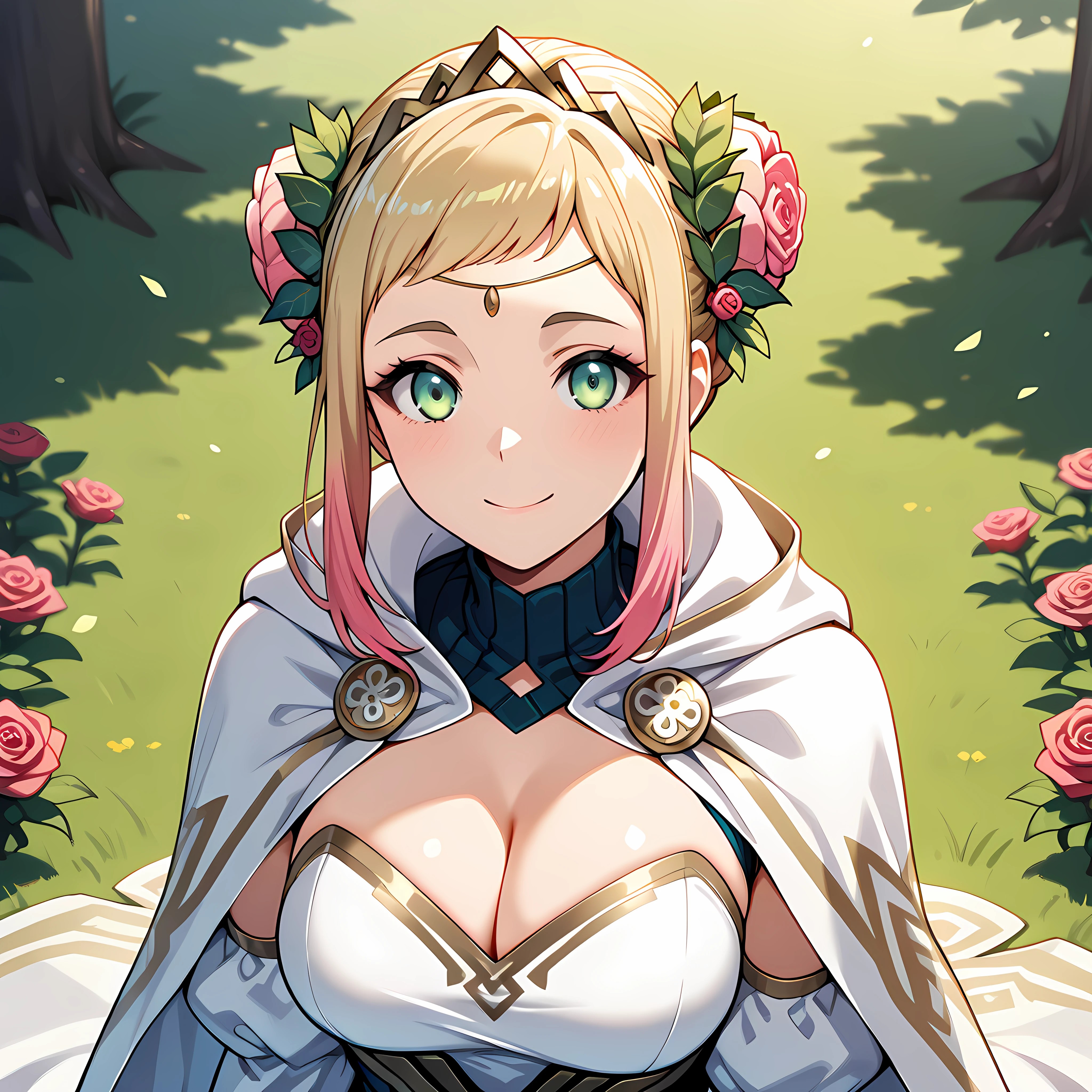 hair bun, green eyes, blonde hair, dress, fur cape, blue gloves, fur trim, armor