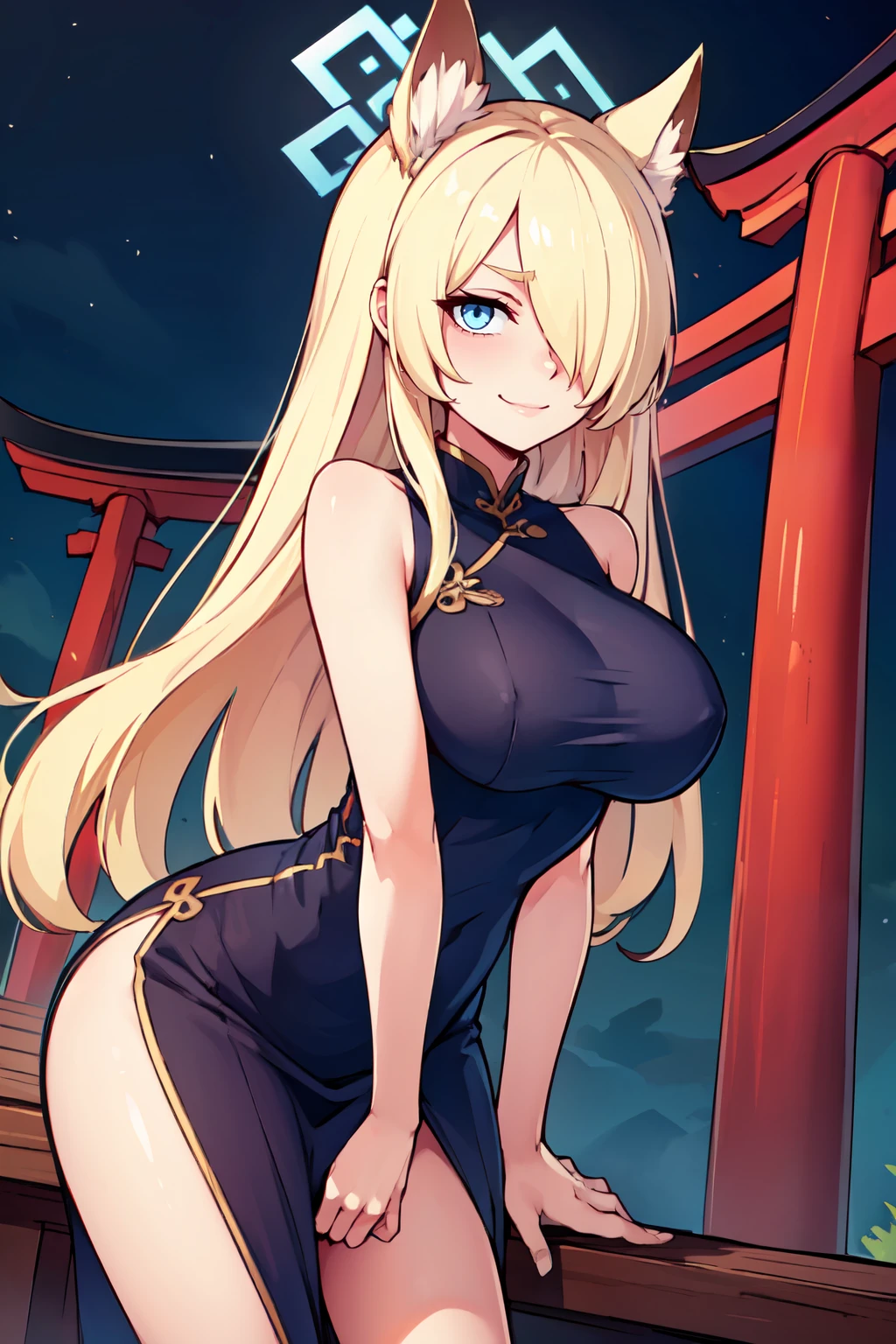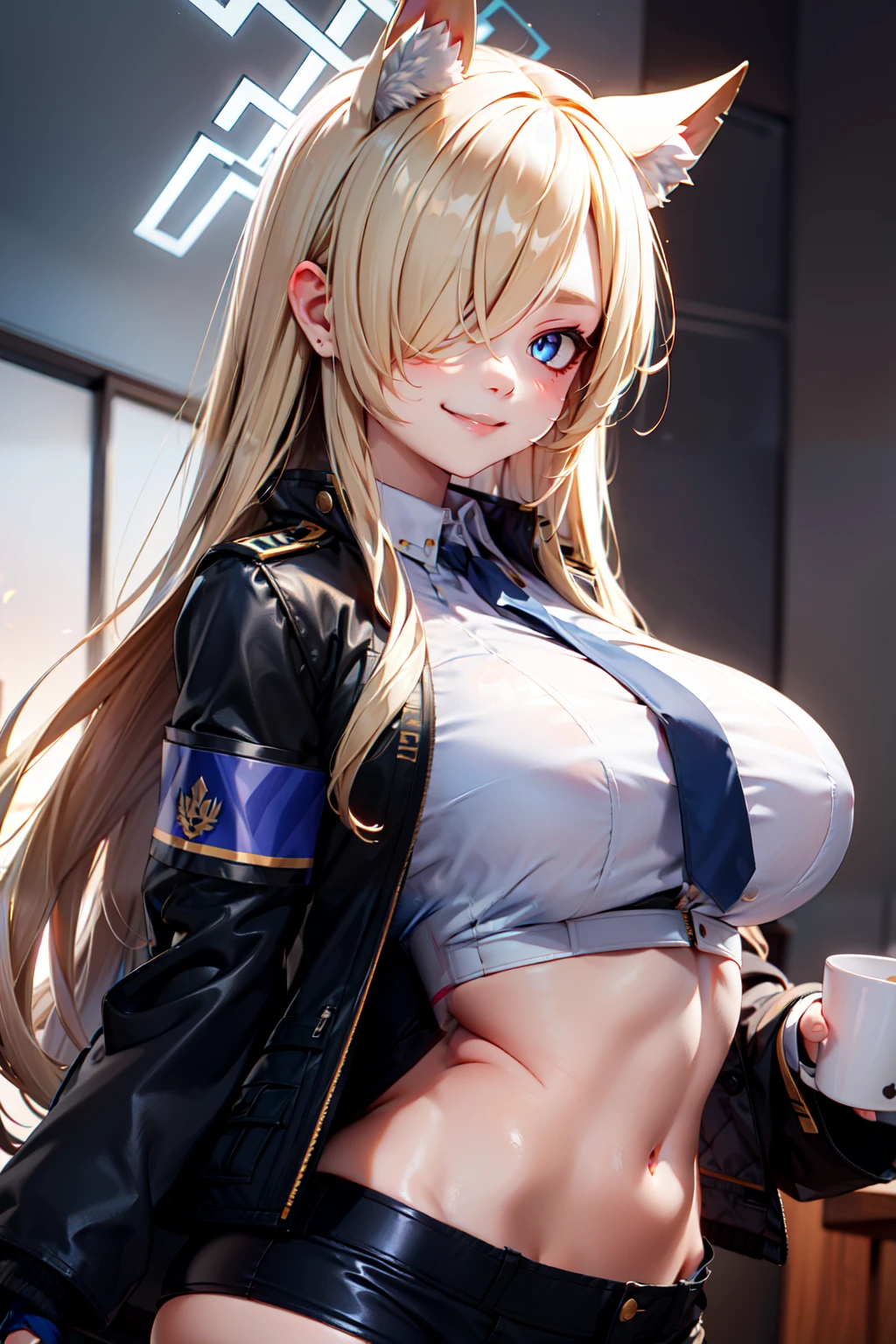 zzKanna, blonde hair, long hair, animal ears, blue halo, hair over one eye, blue eyes, large breasts, extra ears, dog ears black jacket, blue shirt, collared shirt, blue necktie, black pantyhose, blue skirt, armband,