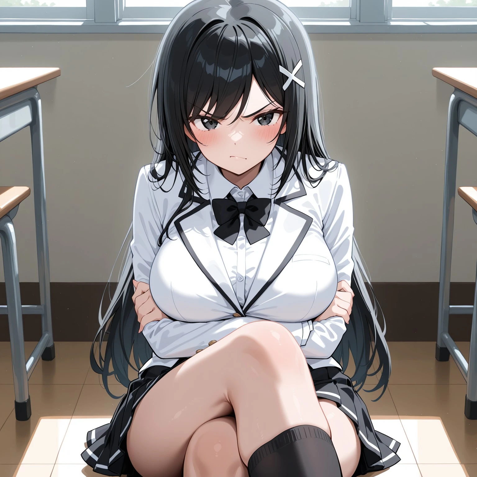 1. karsch, school uniform, bowtie, jacket, collared shirt, shirt, skirt, pleated skirt, kneehighs, white jacket, white shirt, black bow, black kneehighs, black skirt
