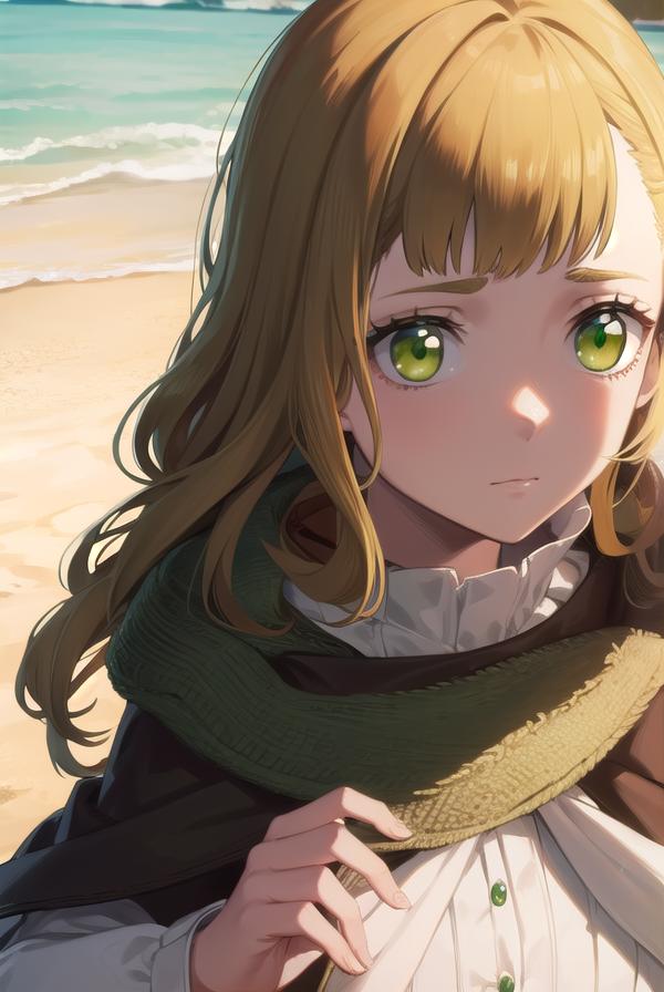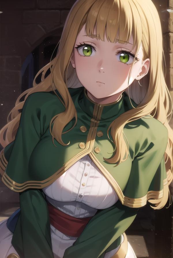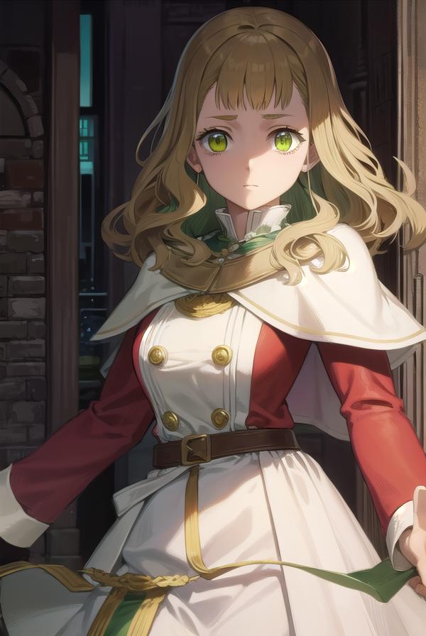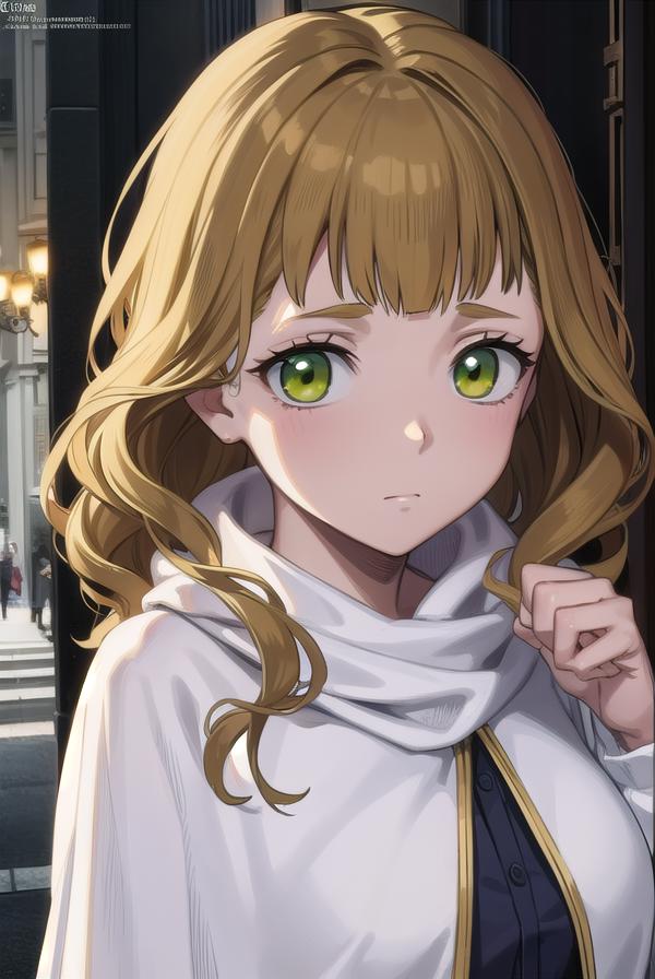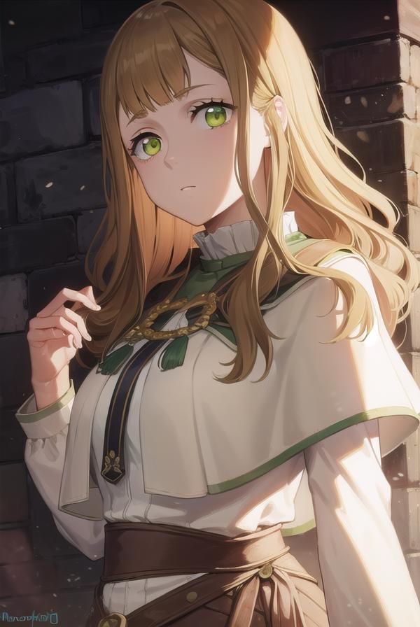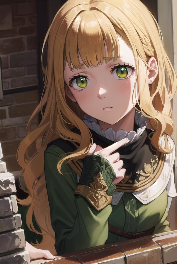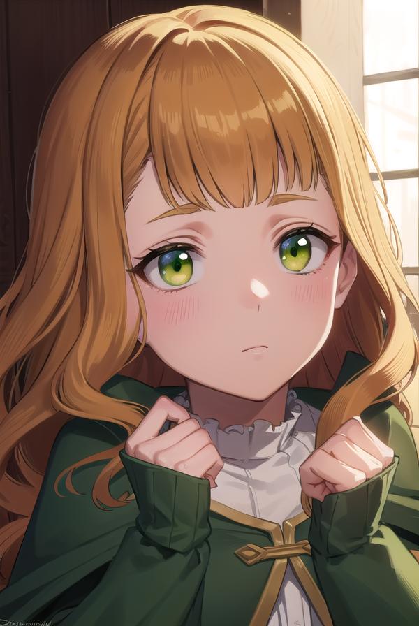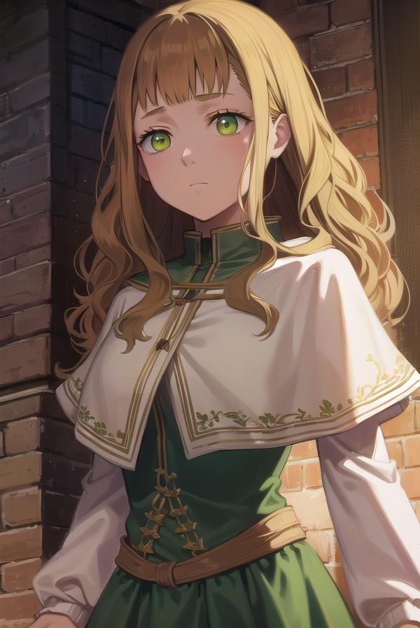 mimosa vermillion, brown hair, (green eyes:1.5), blunt bangs, bangs, medium hair, wavy hair,
