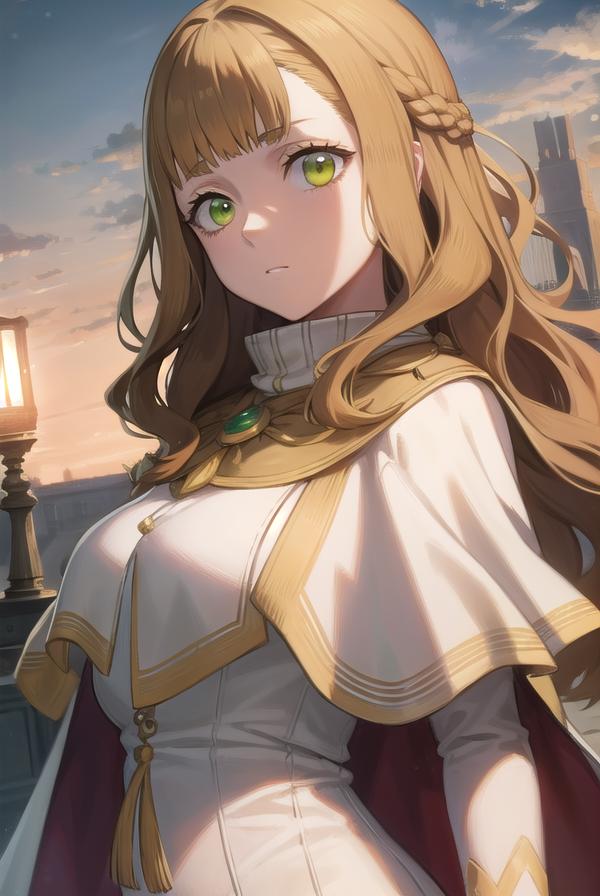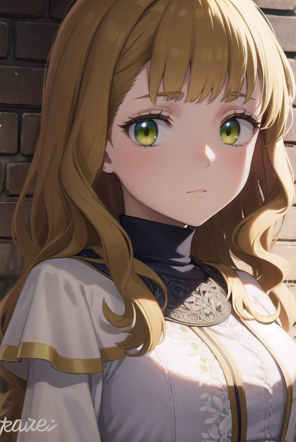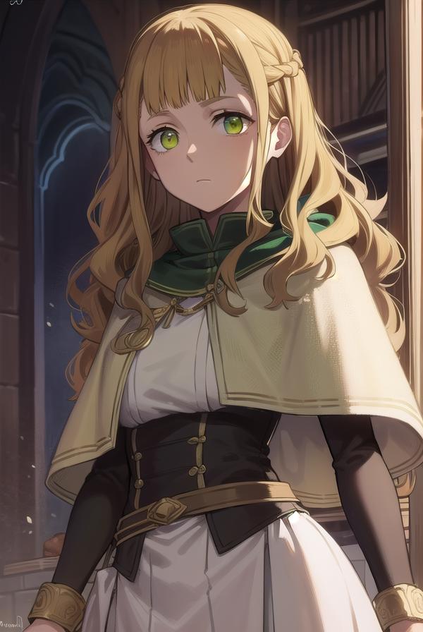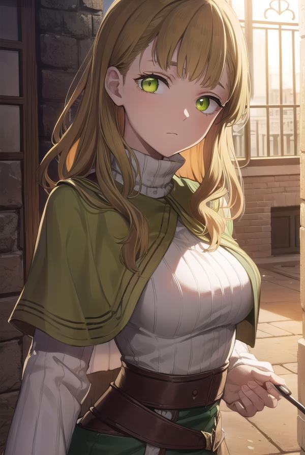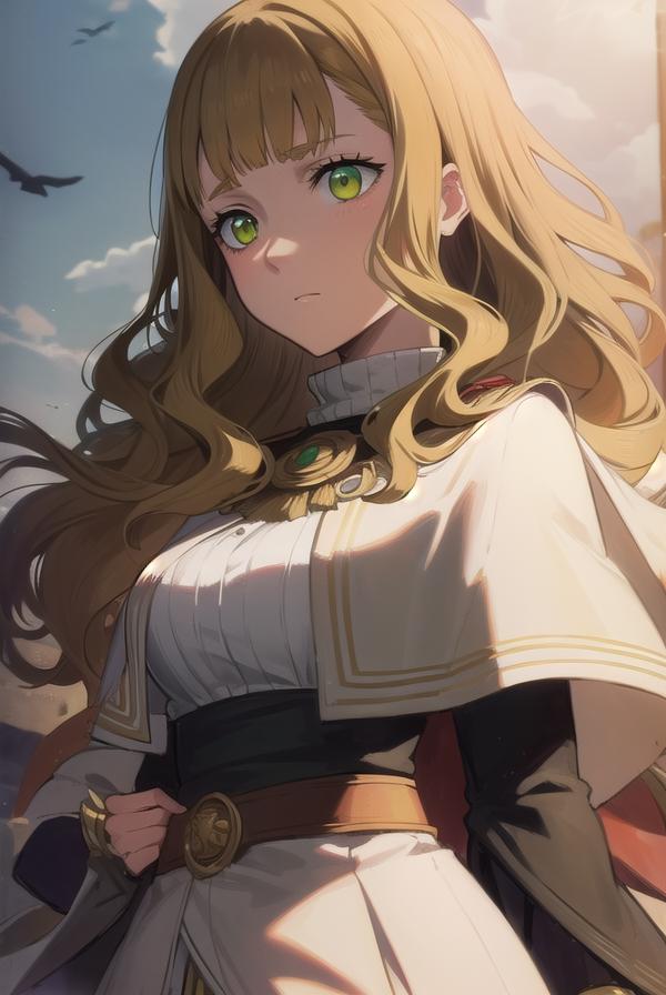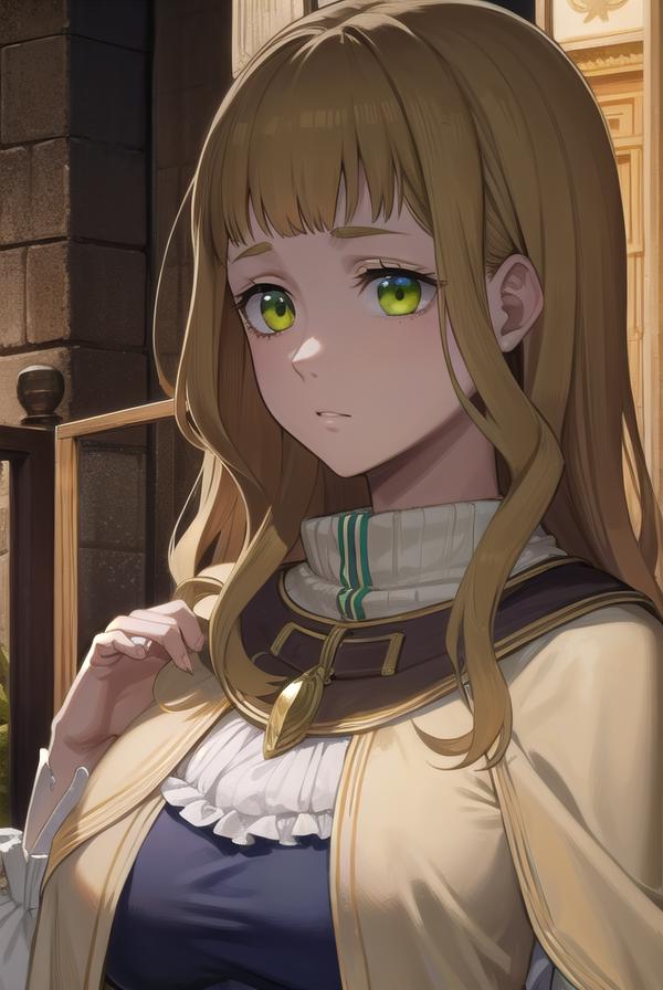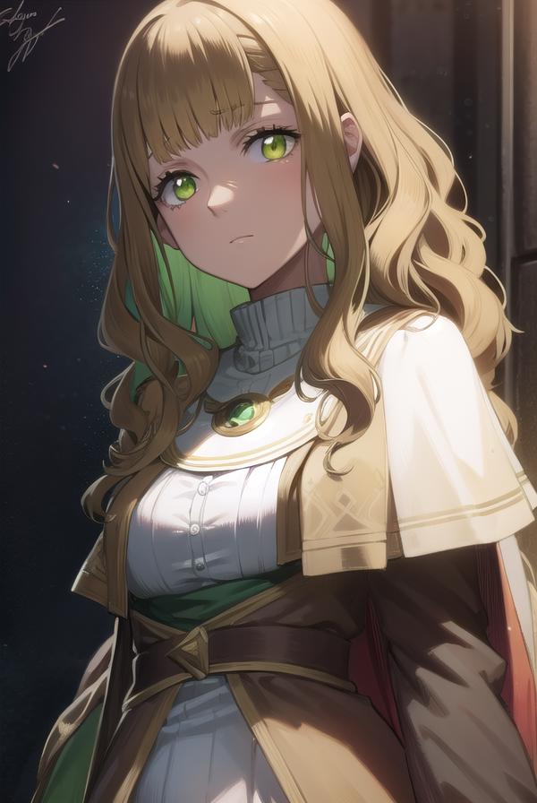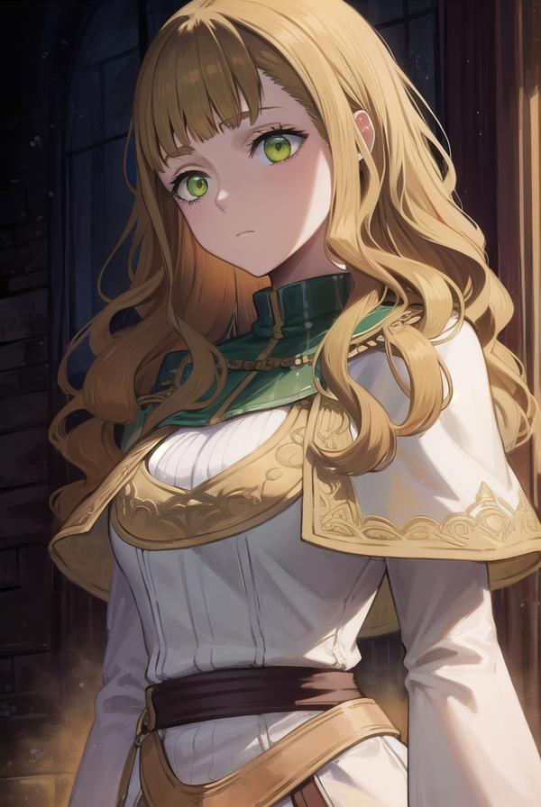 mimosa vermillion, brown hair, (green eyes:1.5), blunt bangs, bangs, medium hair, wavy hair,