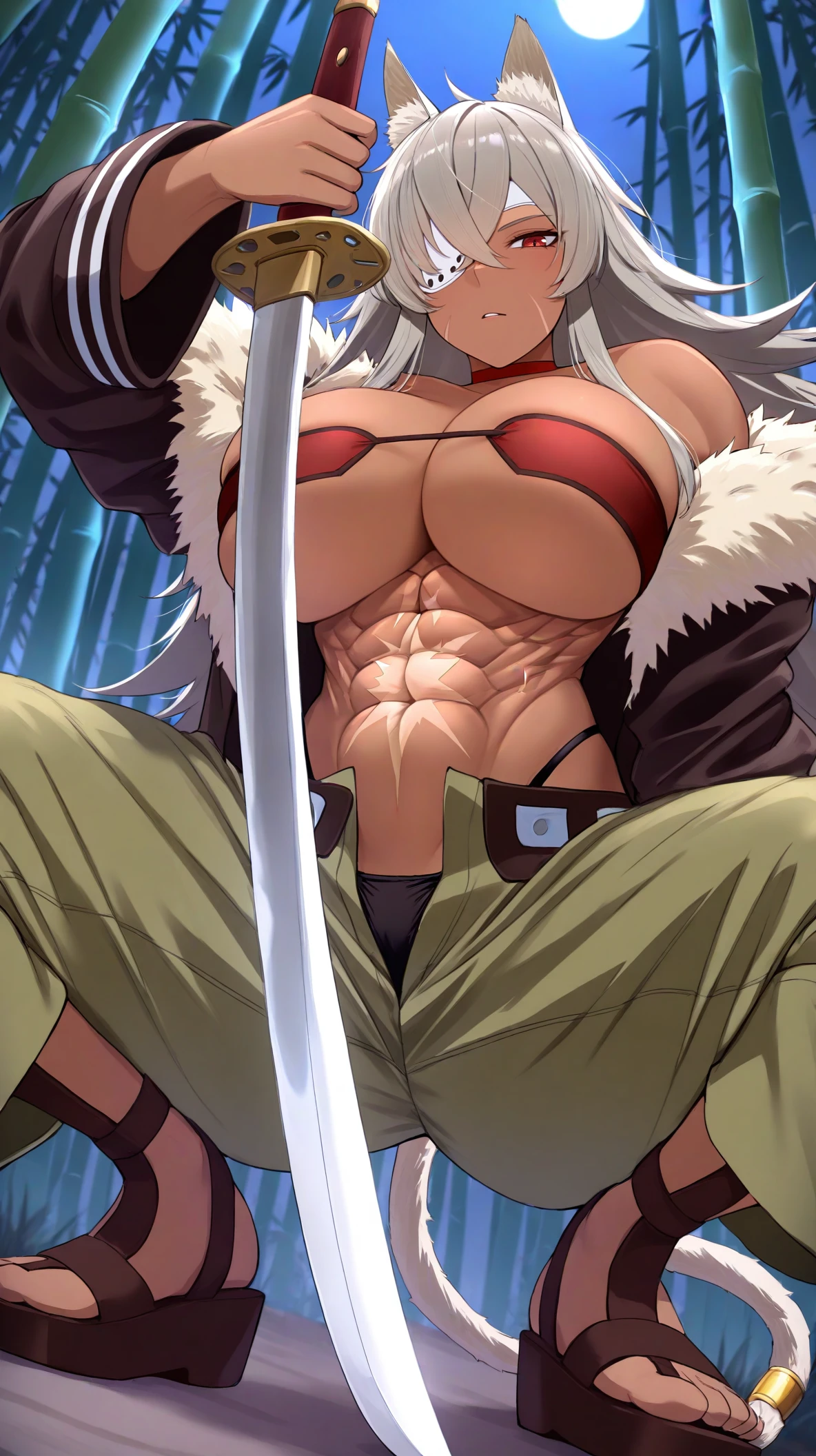 gh1sl41nd3dd, red eyes, grey hair, long hair, crossed bangs, sidelocks, scar on cheek, animal ears, cat ears, animal ear fluff, eyepatch, one-eyed, cat tail, tail ring, red choker, dark-skinned female, large breasts, red bandeau, abs, black jacket, off-shoulder jacket, open jacket, fur-trimmed jacket, navel, scar on stomach, highleg panties, string panties, black panties, green pants, open pants, sandals,