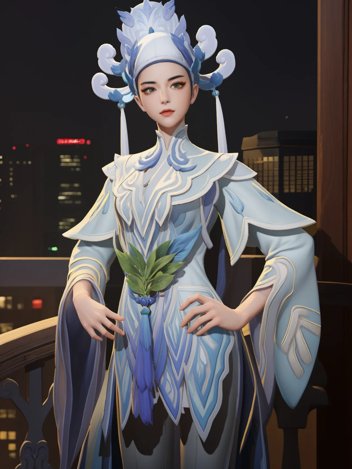 WZRYshangguanwanerLZ, solo, 1girl,black hair, wide sleeves, looking at viewer, boots, long sleeves, chinese clothes, pants, closed mouth, hat,layered sleeves,hair ornament,robe,cityscape, night, hand on hip,
