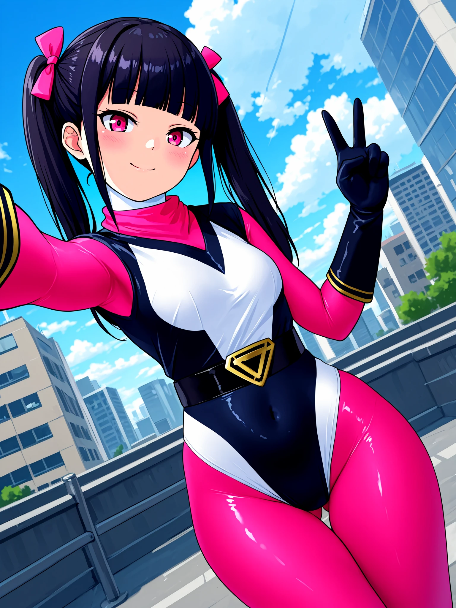 hanan0kun0ichigumi, shiny clothes, spandex, white neck, covered neck, bodysuit under clothes, [insert color here!] bodysuit, [insert color here!] scarf, two-tone leotard, black leotard, white leotard, highleg leotard, elbow gloves, black gloves, gold trim, black beltFor images that show below the knees (again, "high heel boots" is optional and depends on tastes):