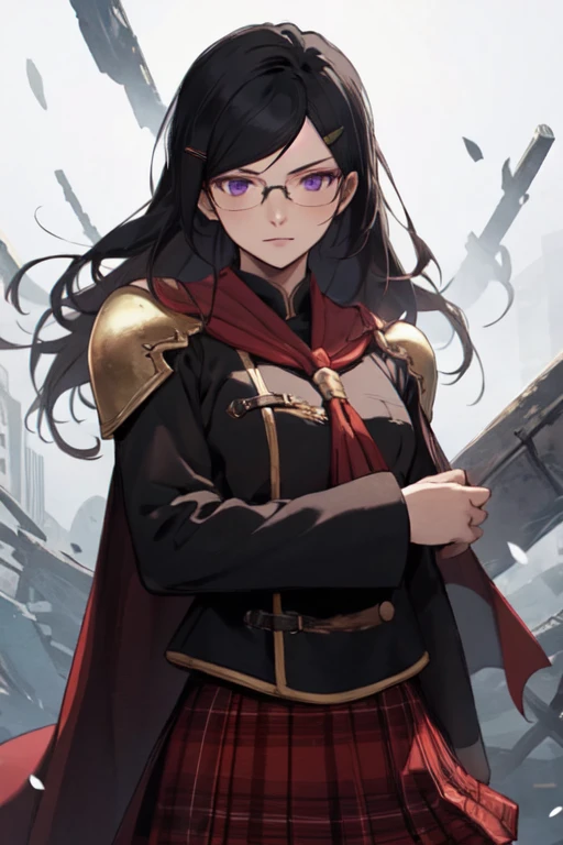 QueenFF, 1girl, solo, long hair, skirt, black hair, red cape, armor, plaid skirt, purple eyes, hairclip, shoulder armor, glasses, school uniform,